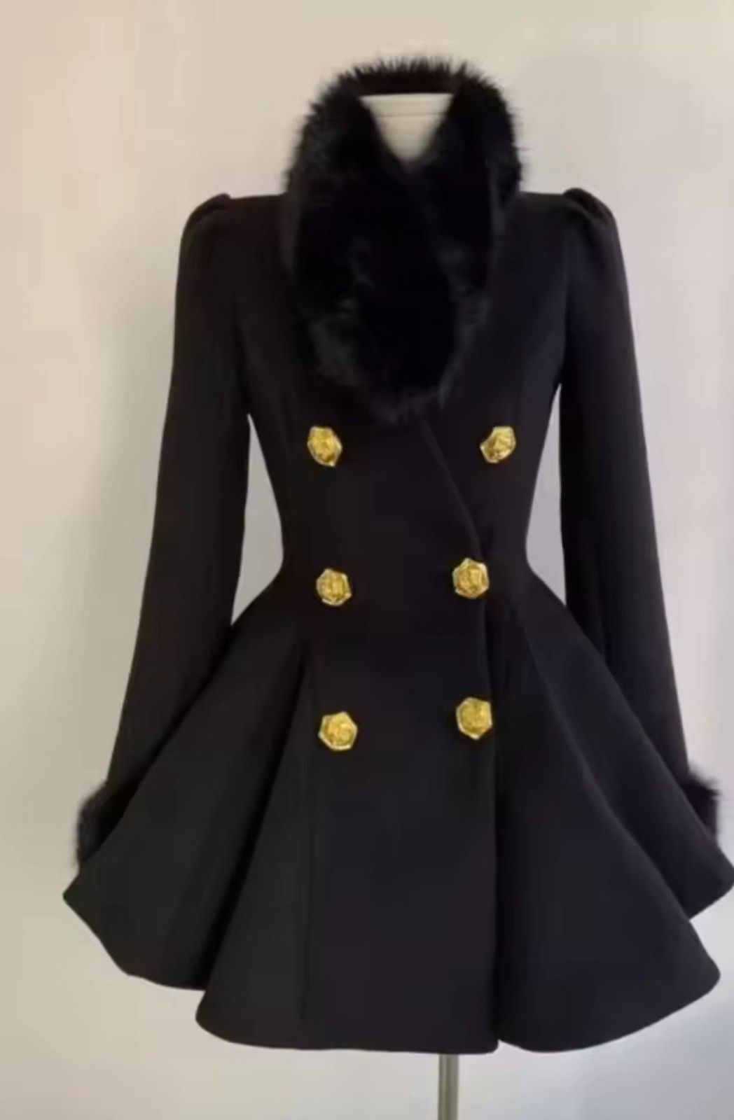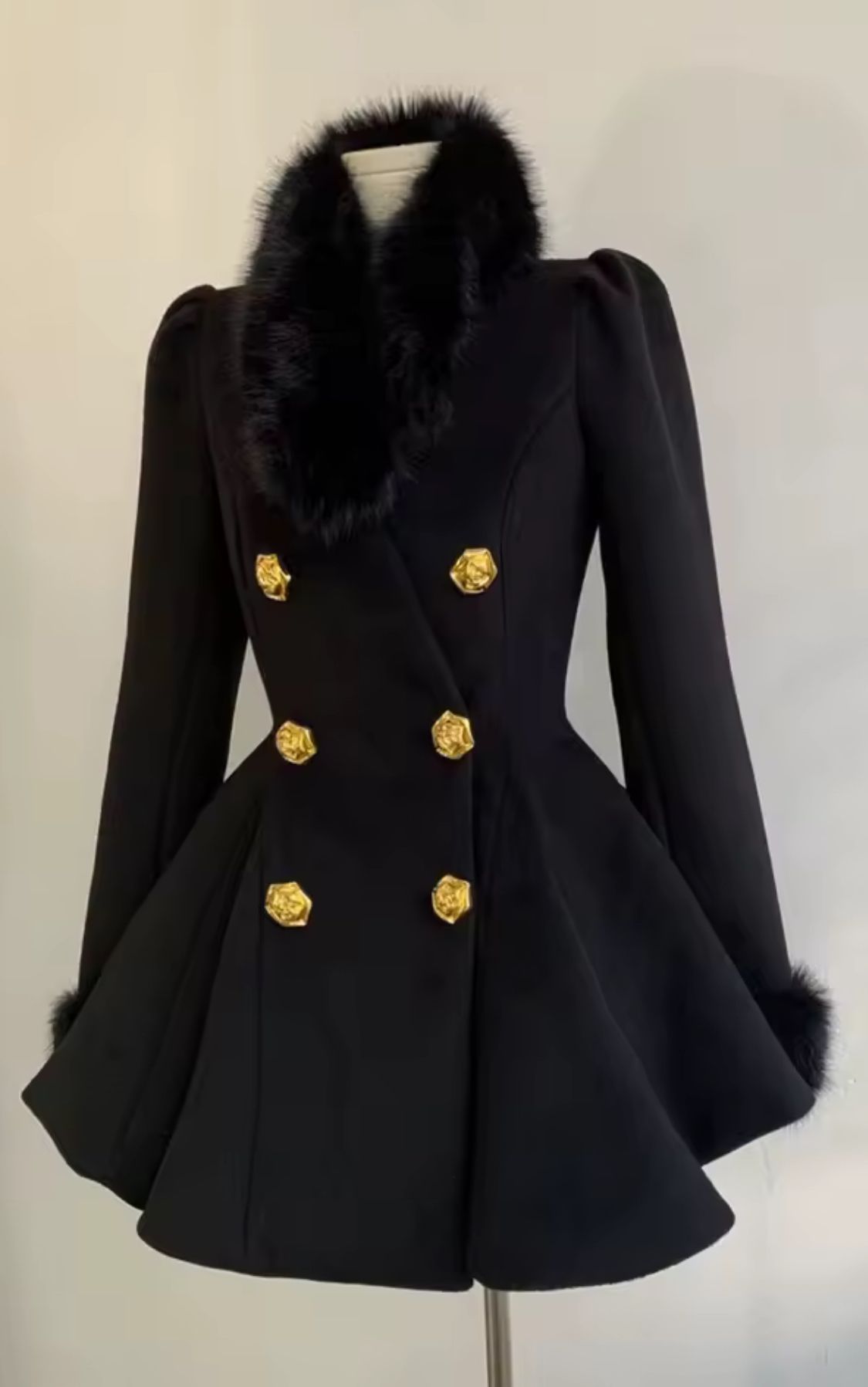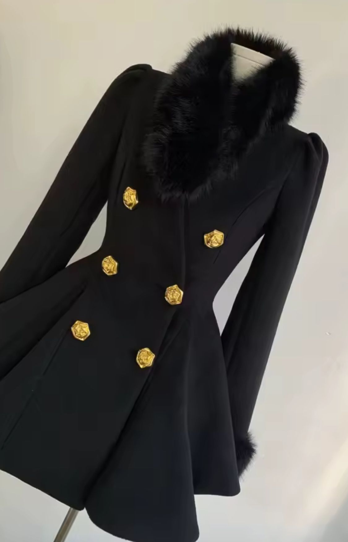 Abrigo estilo vintage francés, negro, entallado en cintura con maravillosos botones dorados metálicos en forma de rosa con cuello extraíble peludo