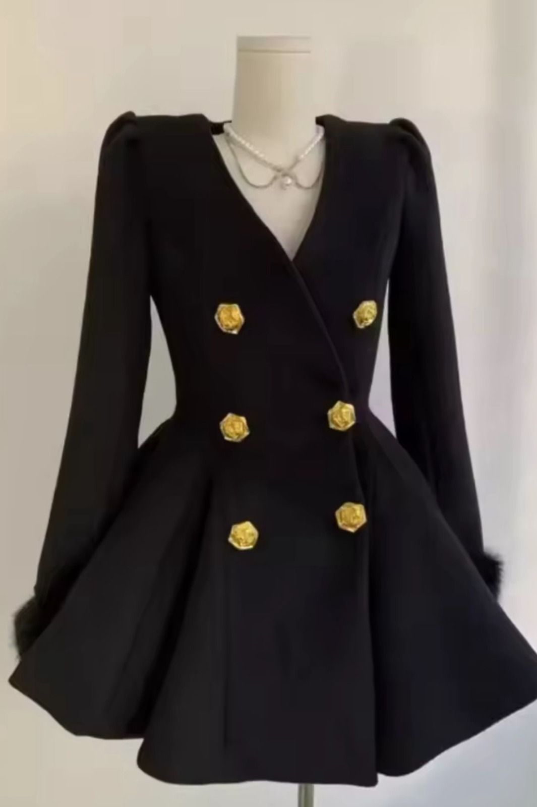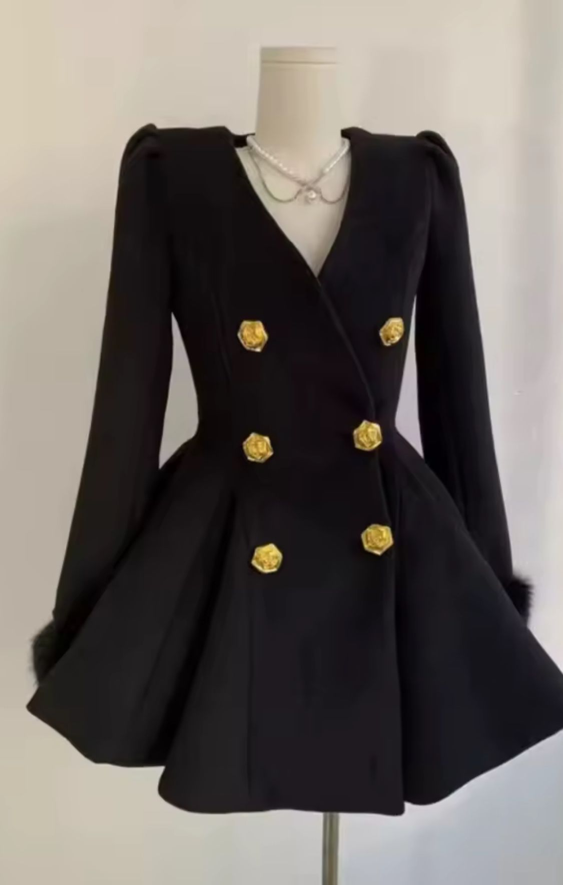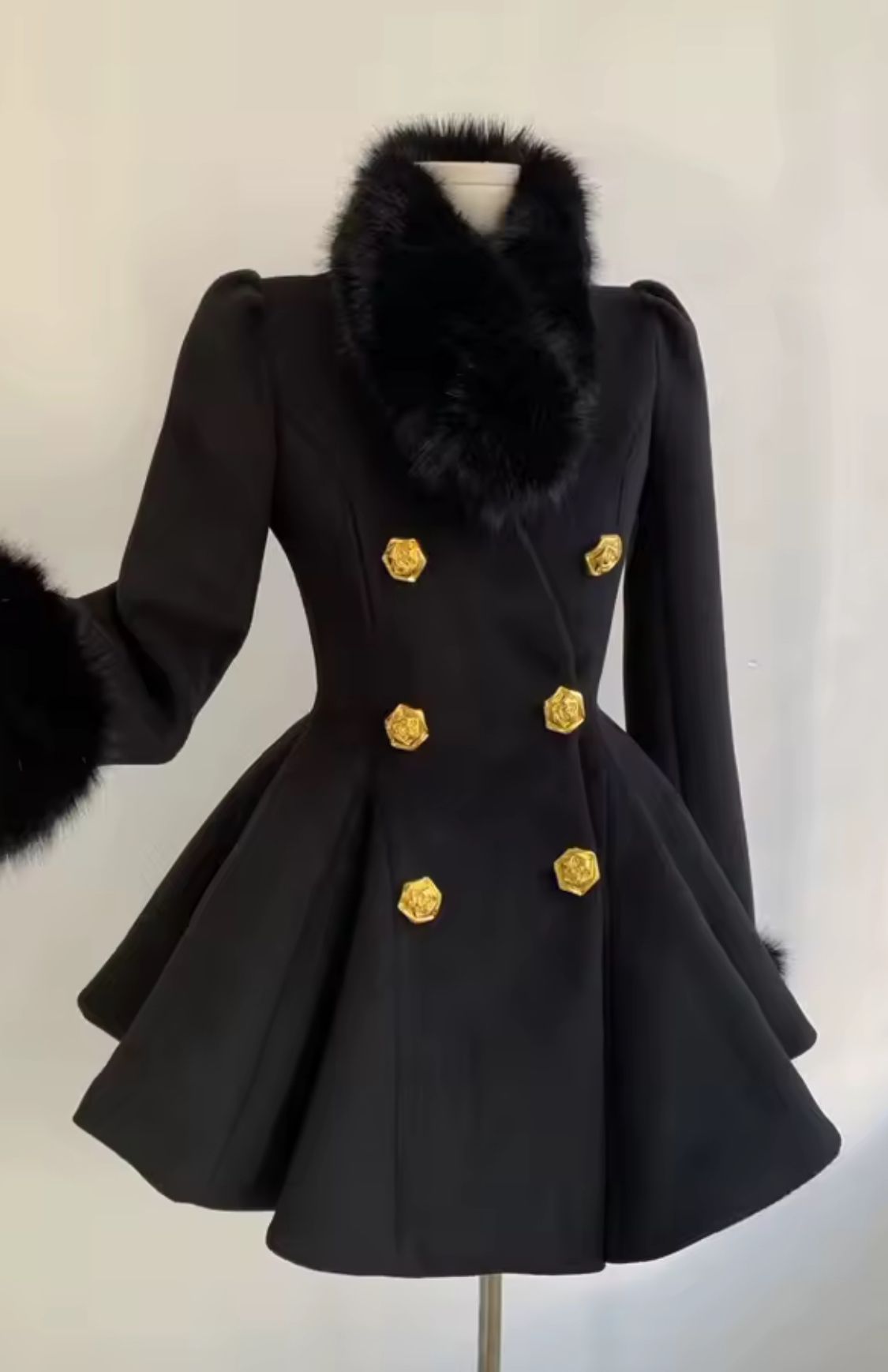 Abrigo estilo vintage francés, negro, entallado en cintura con maravillosos botones dorados metálicos en forma de rosa con cuello extraíble peludo