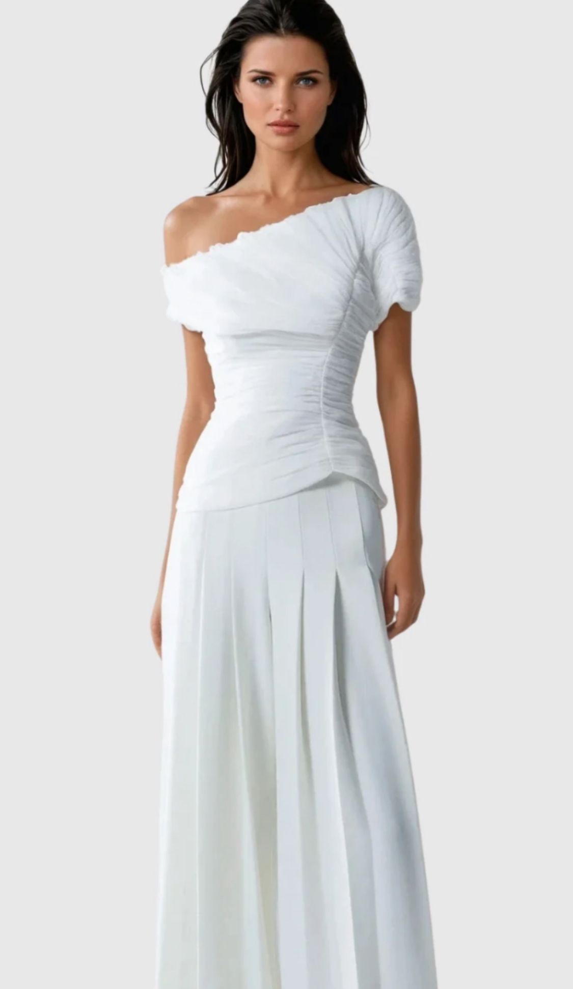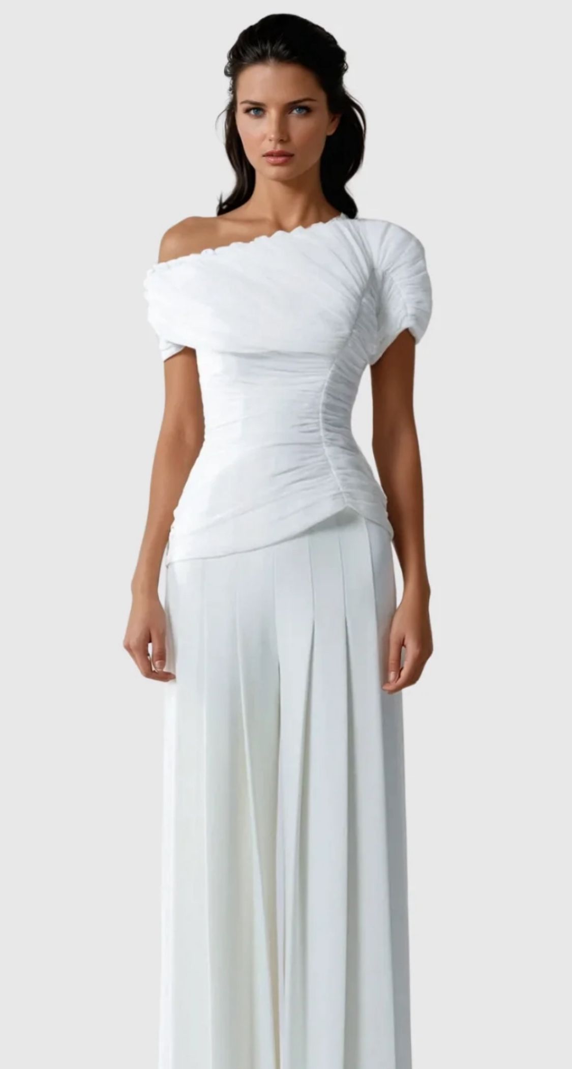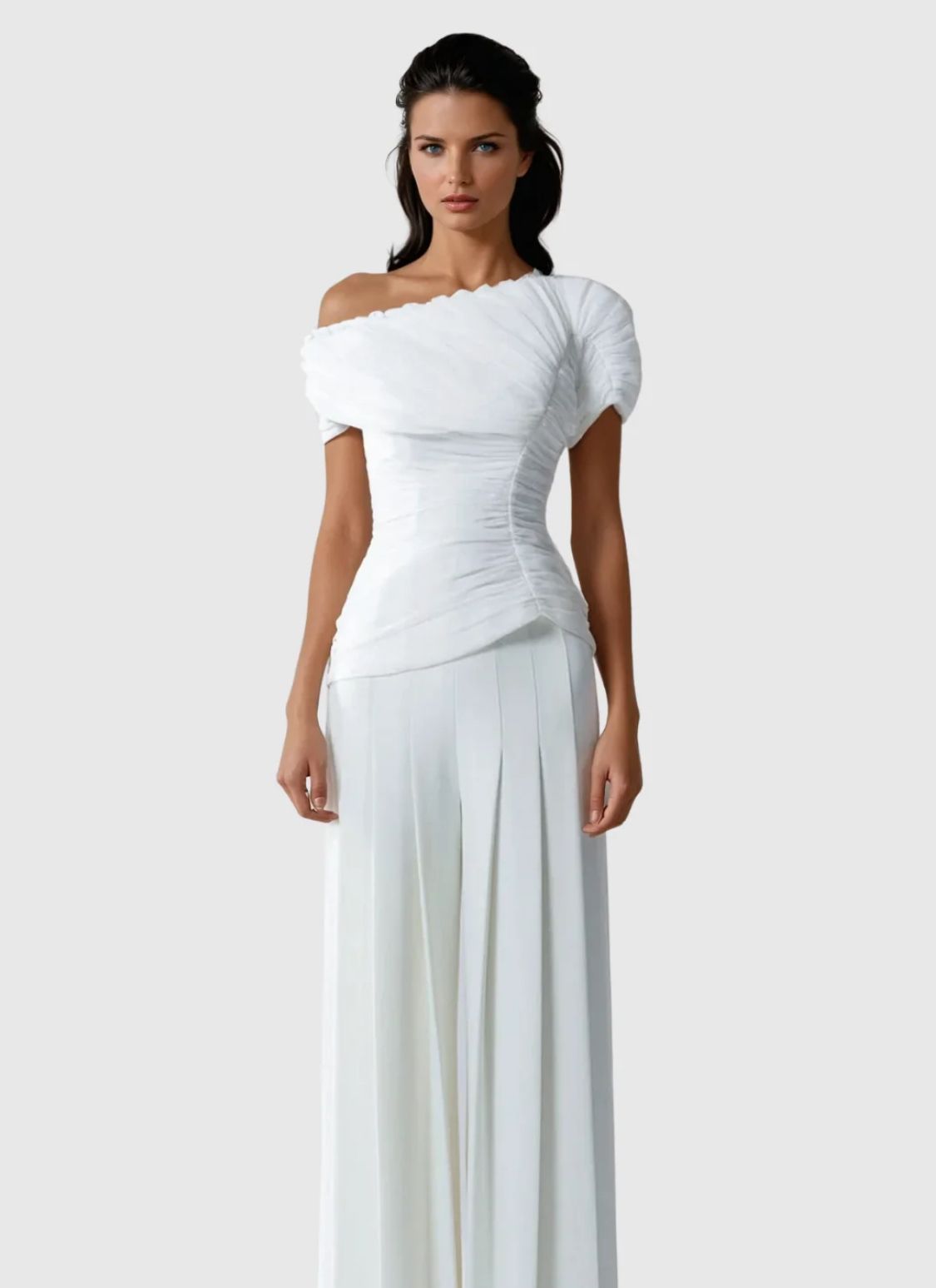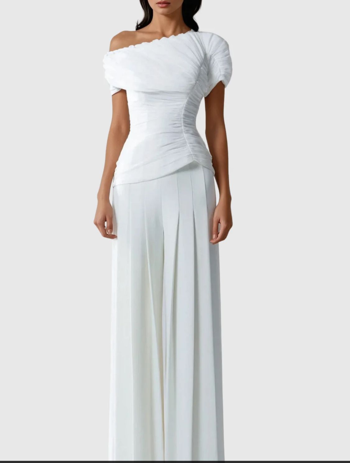 This set features an asymmetrical ruched top and stunning wide-leg white trousers.