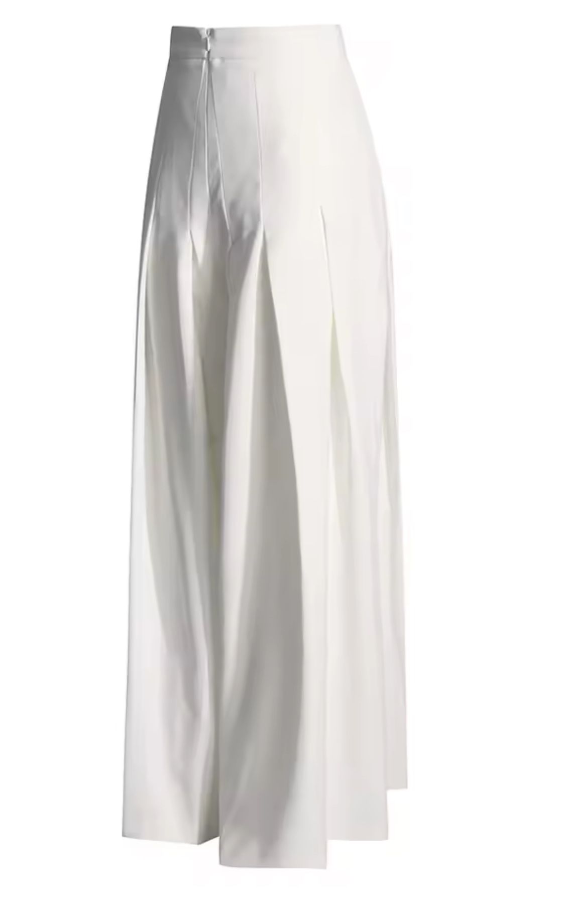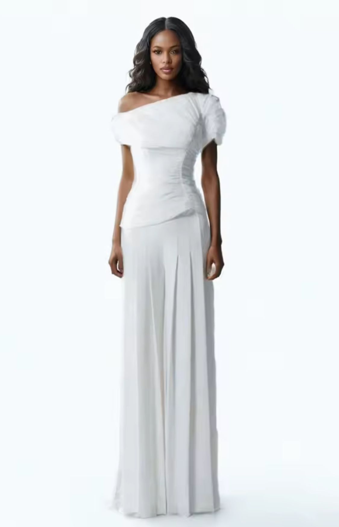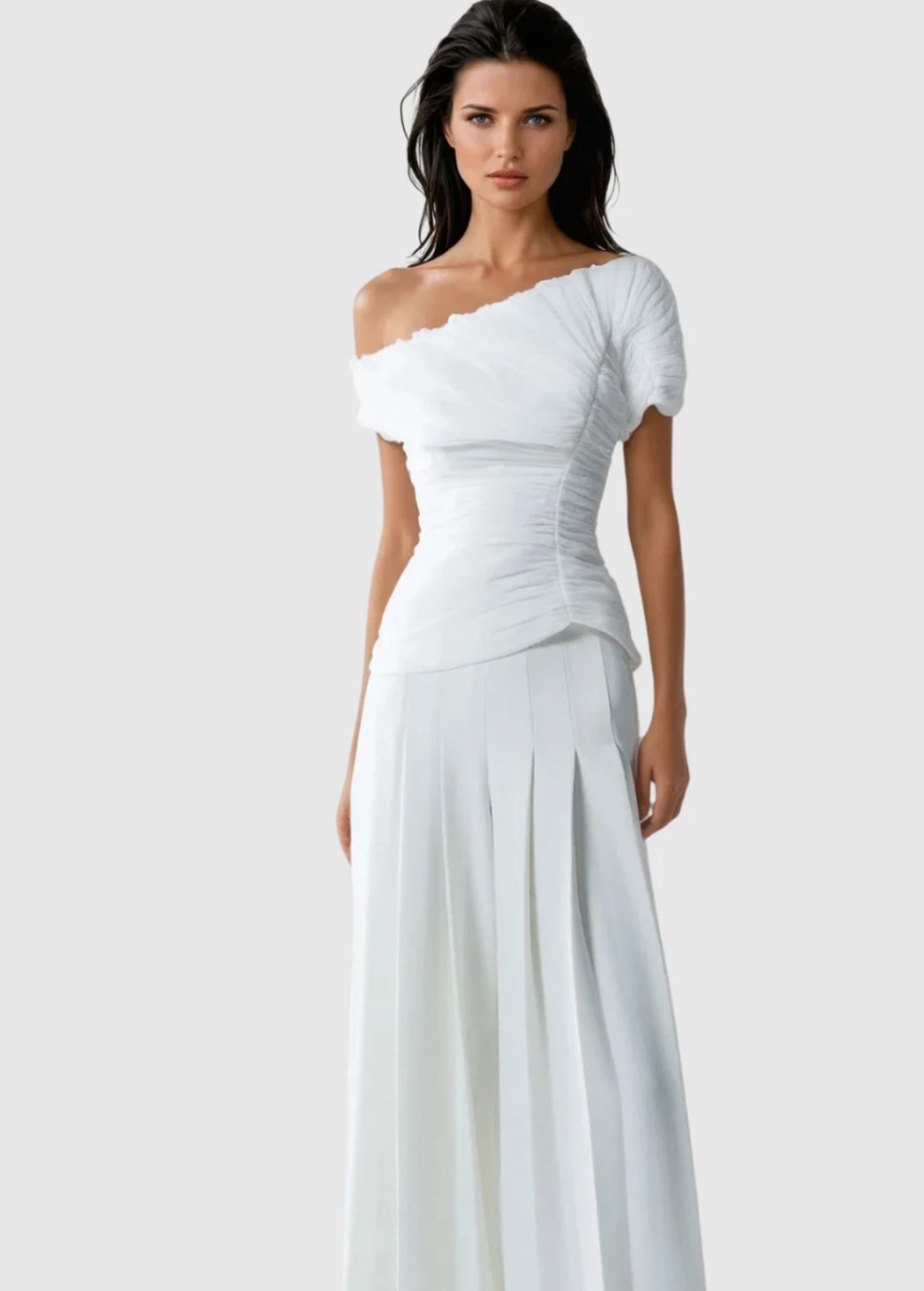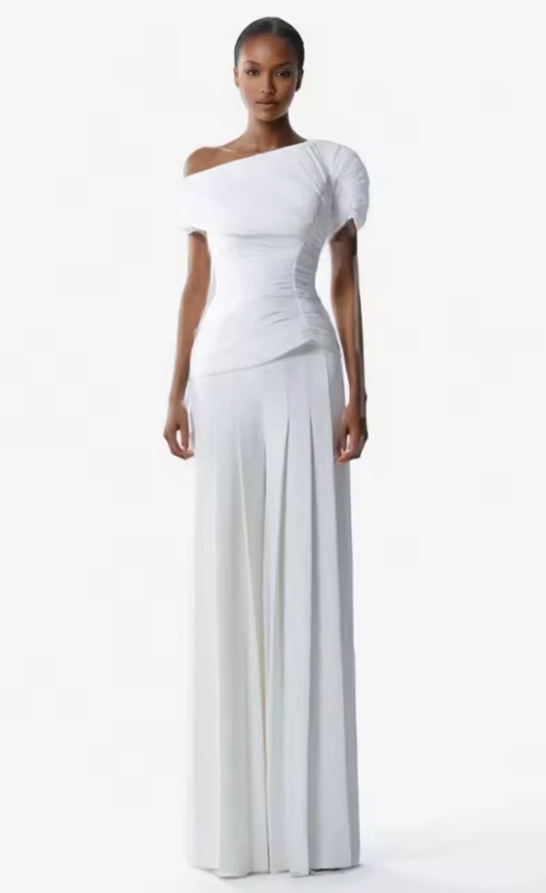 This set features an asymmetrical ruched top and stunning wide-leg white trousers.