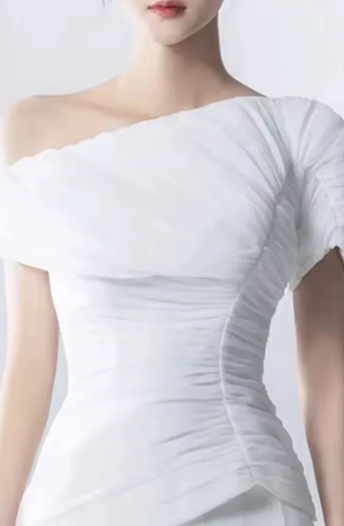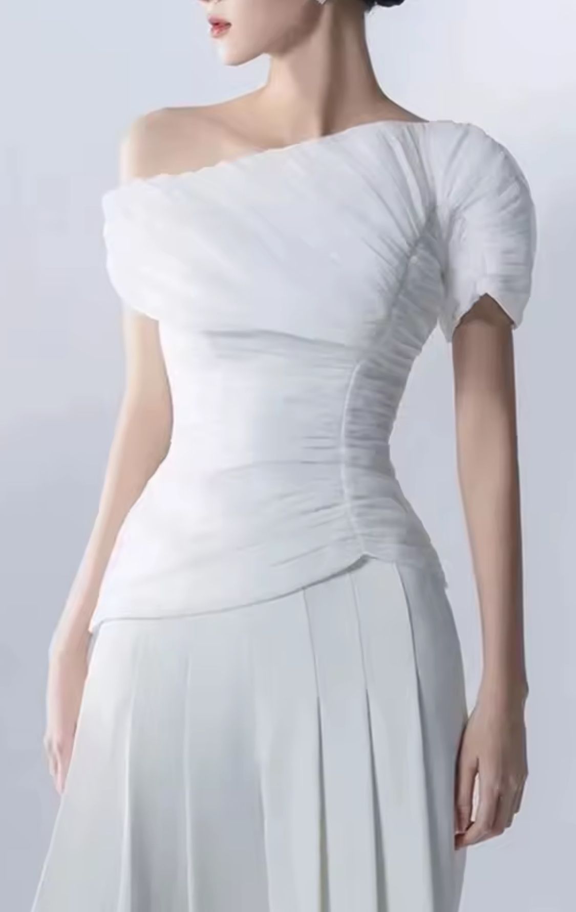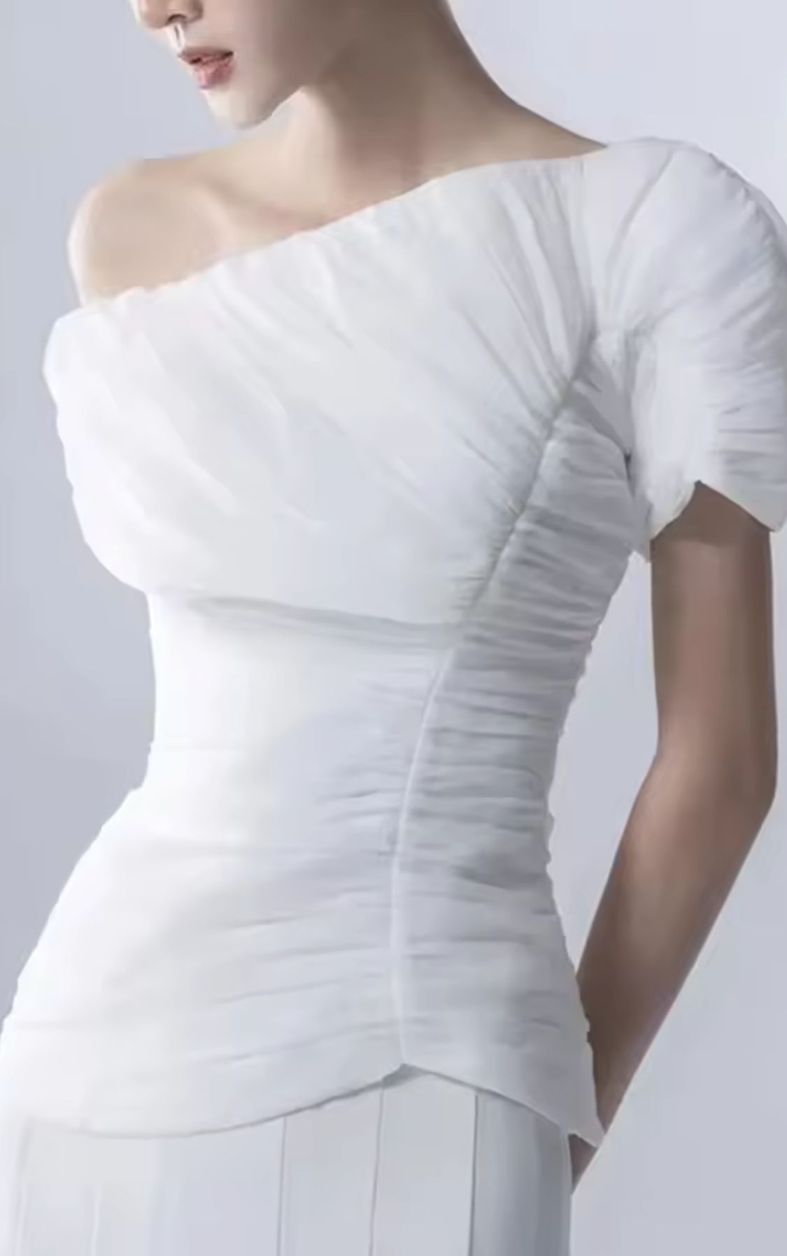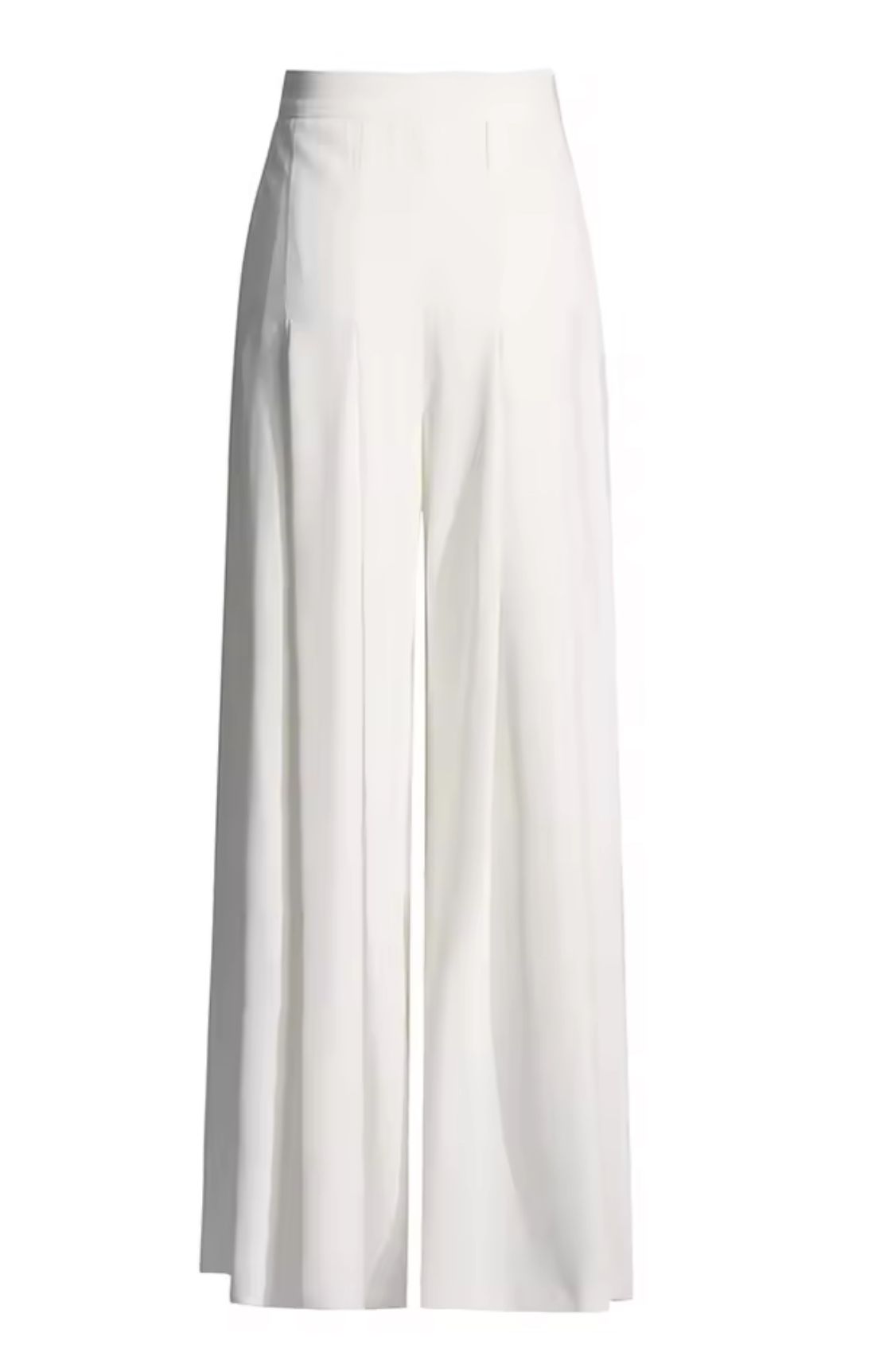 This set features an asymmetrical ruched top and stunning wide-leg white trousers.