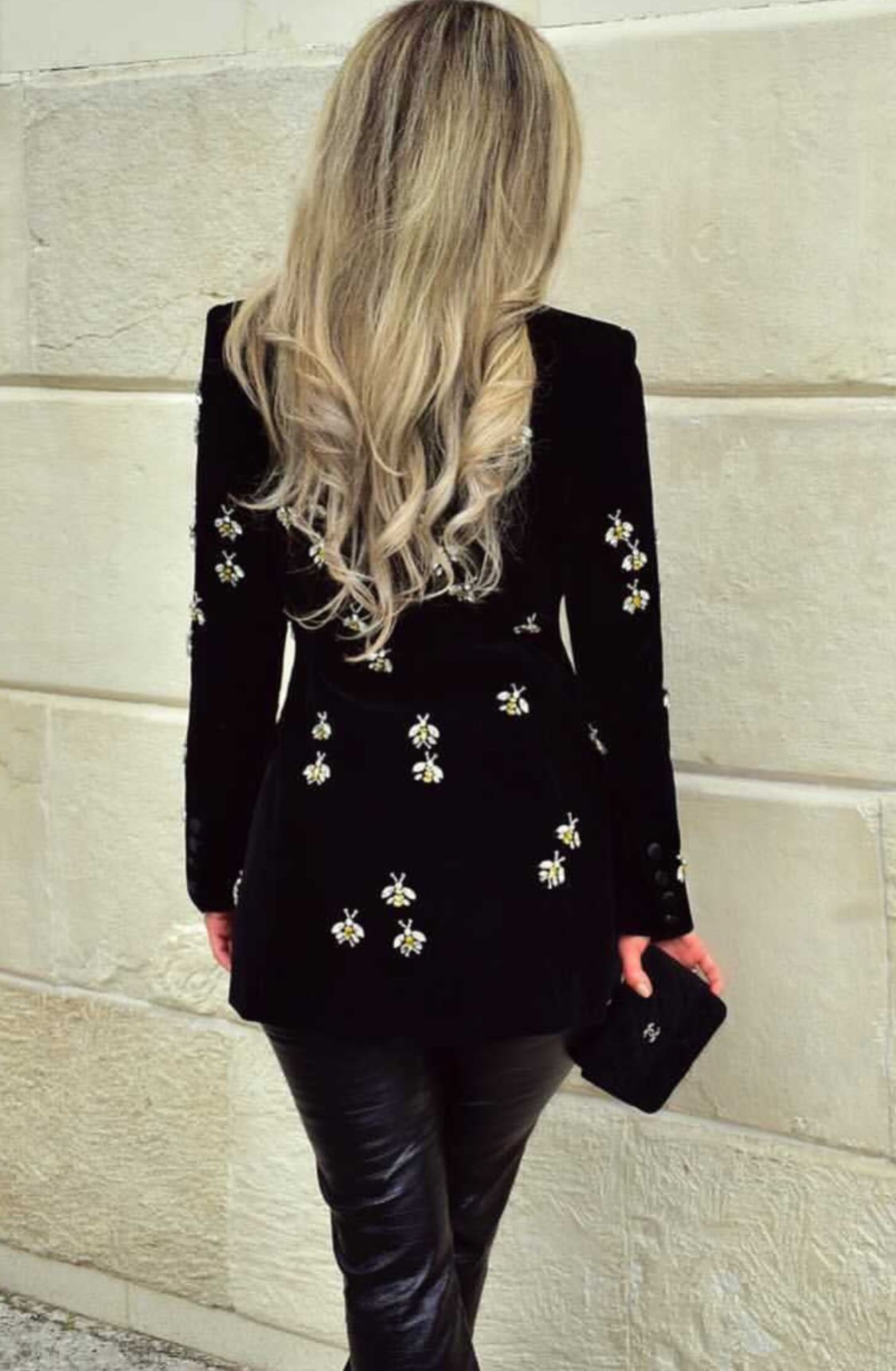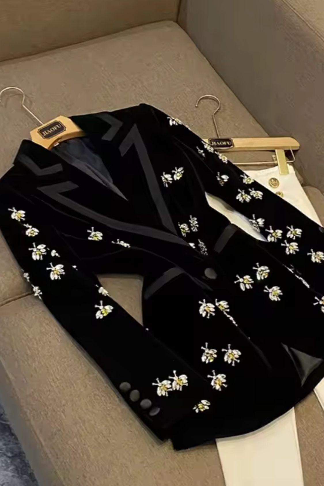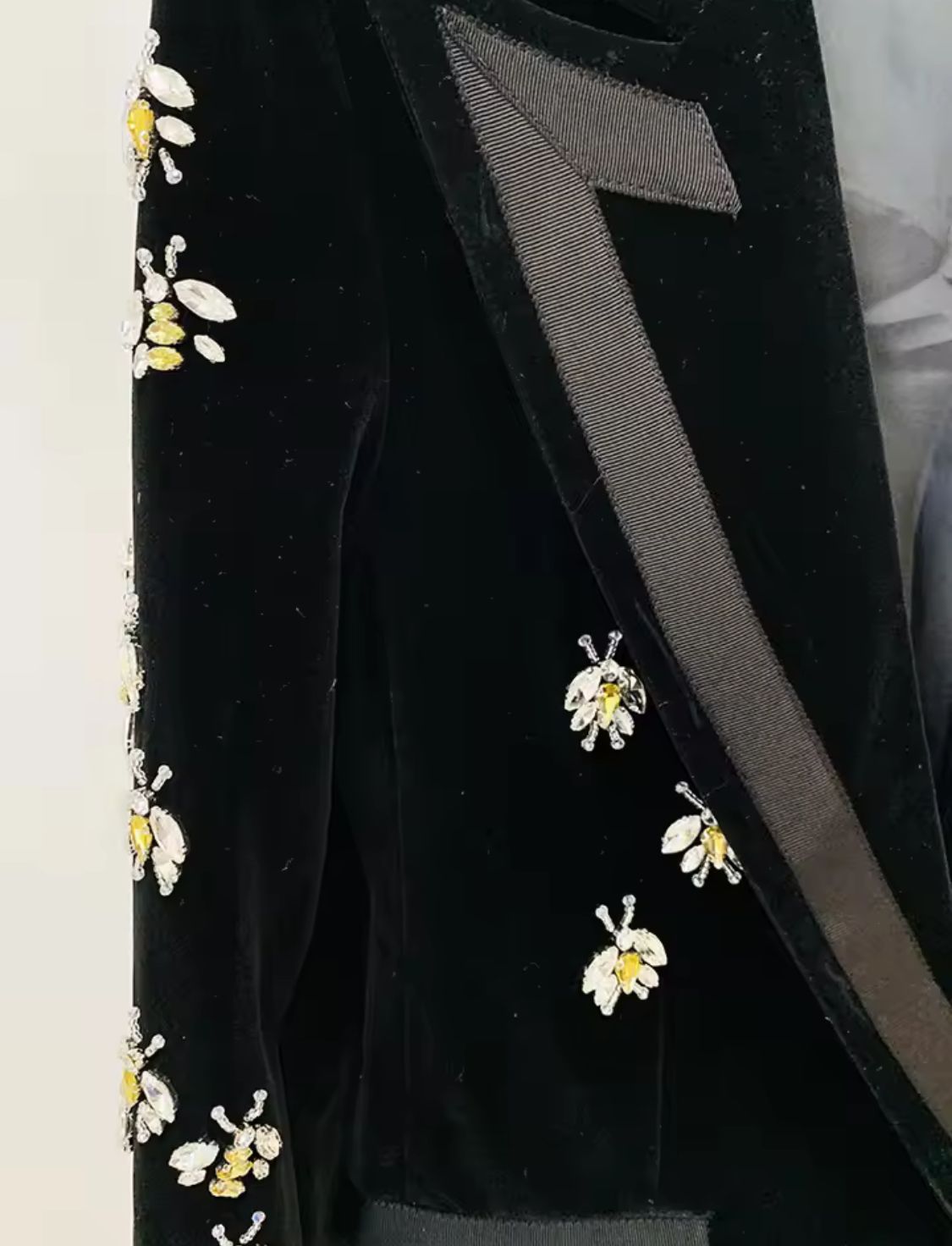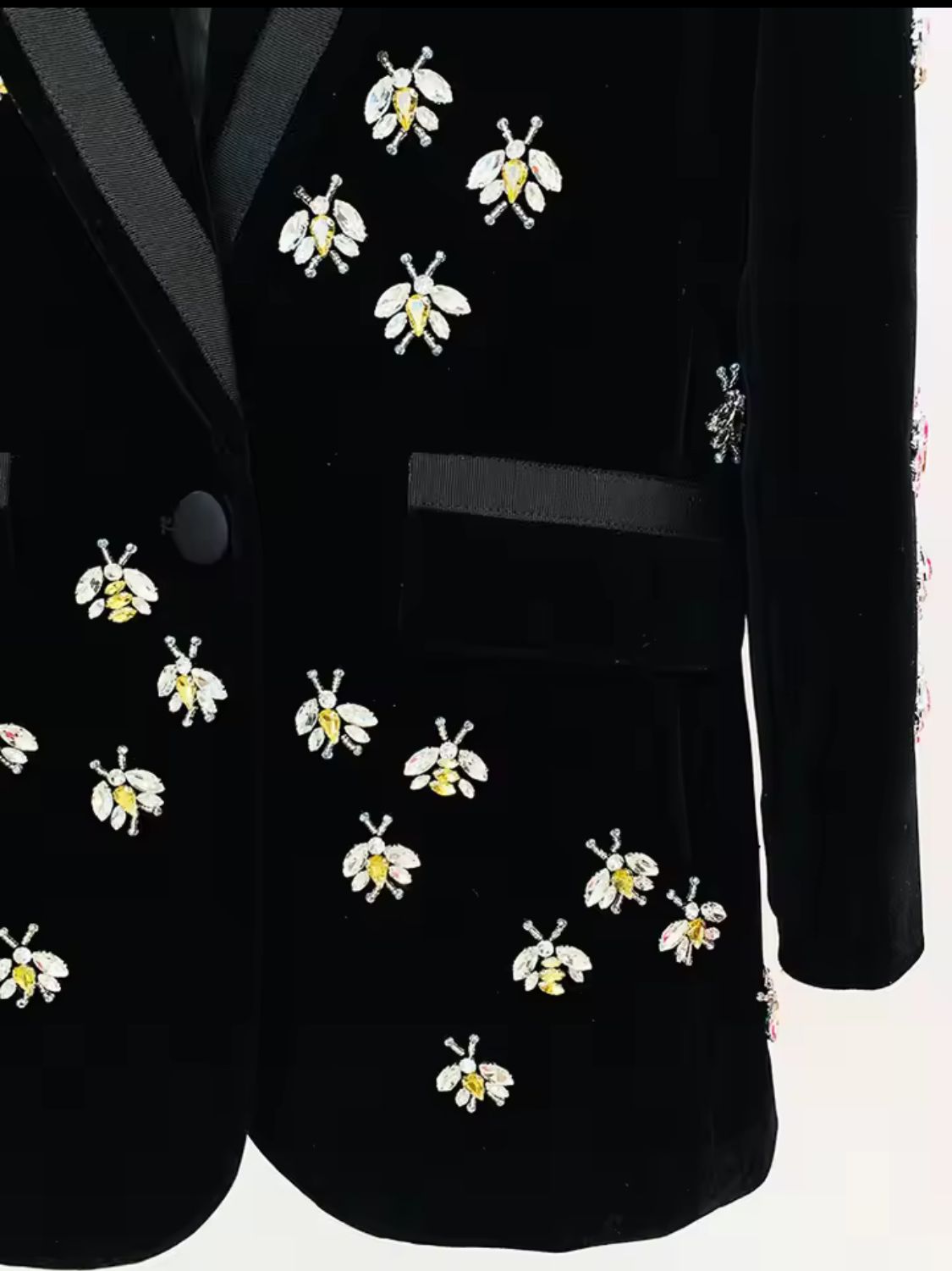 Fitted black velvet blazer with bee-shaped rhinestones