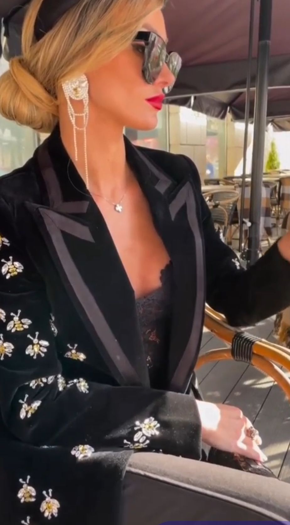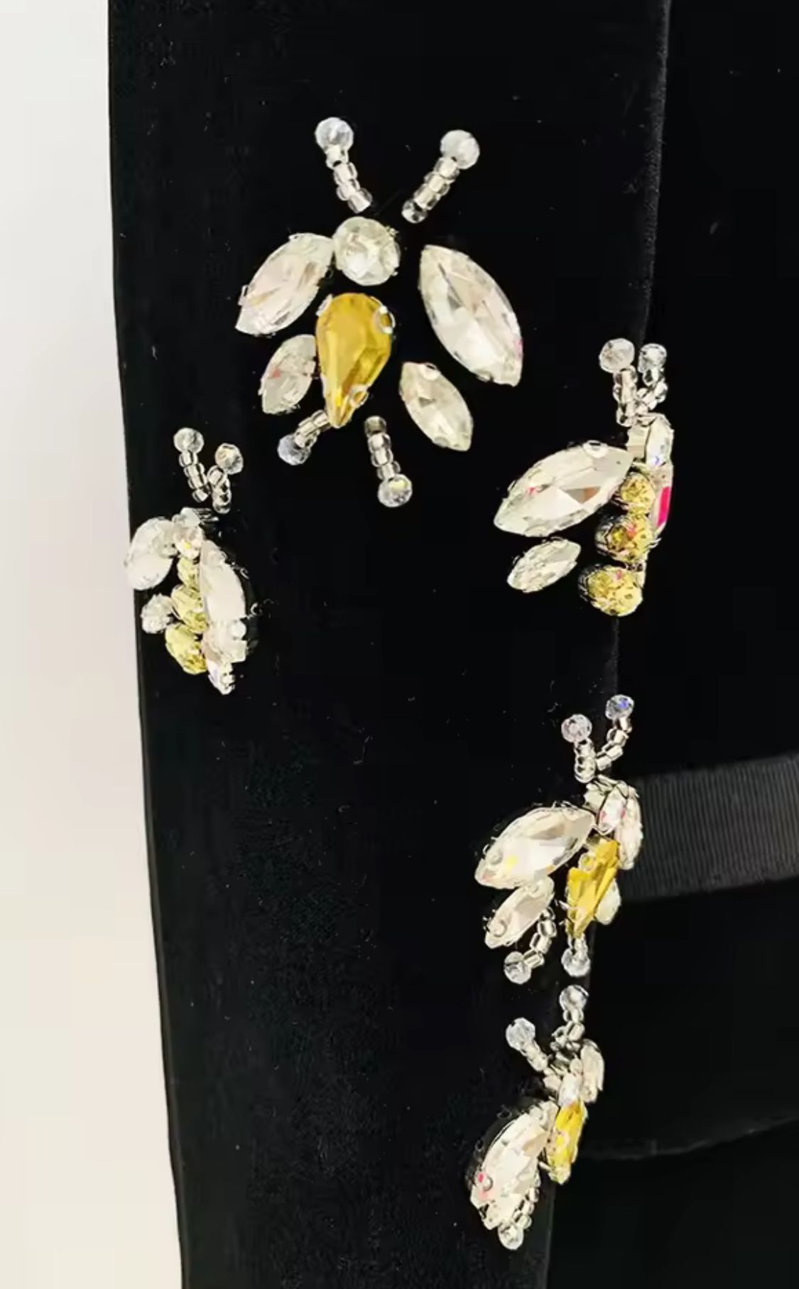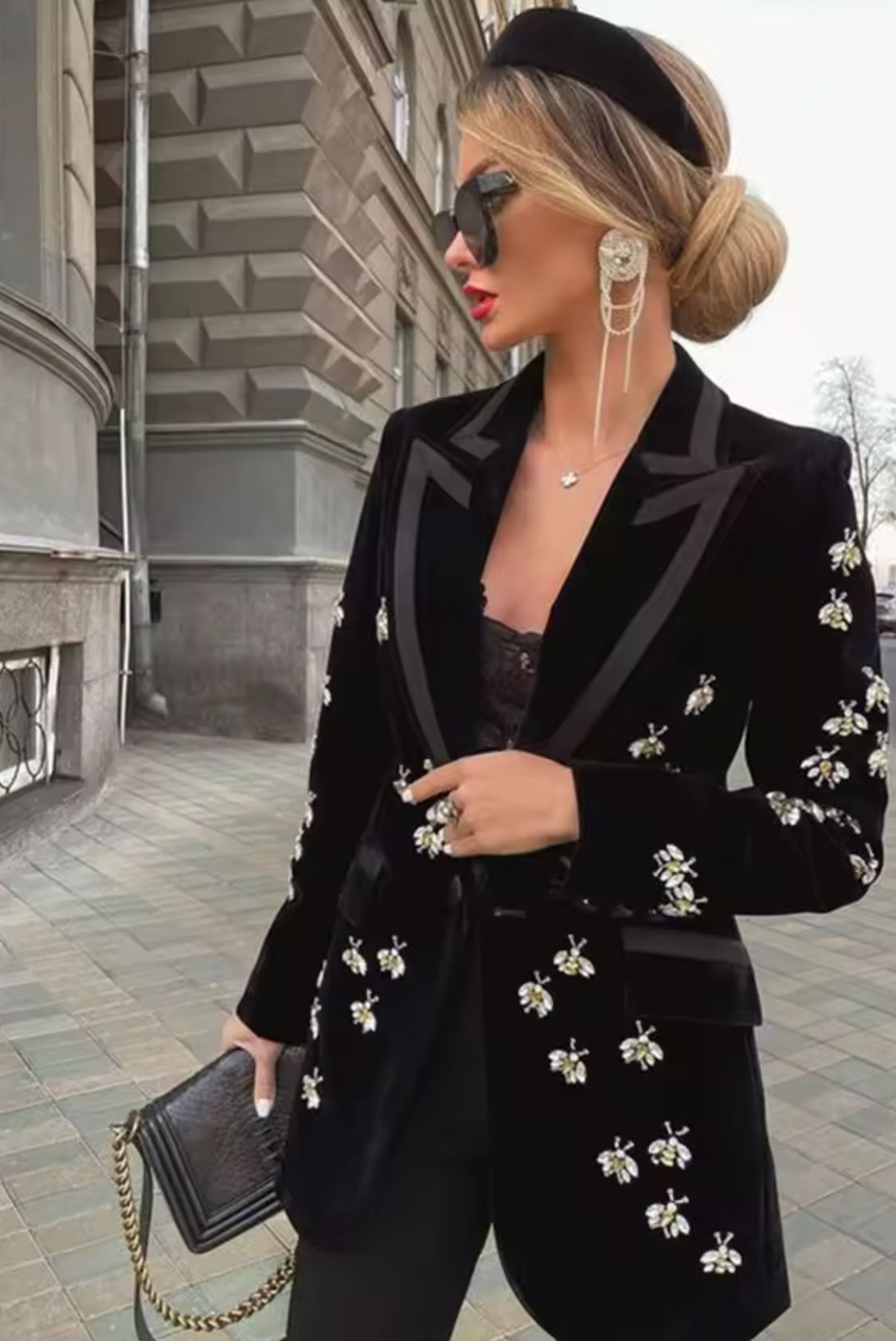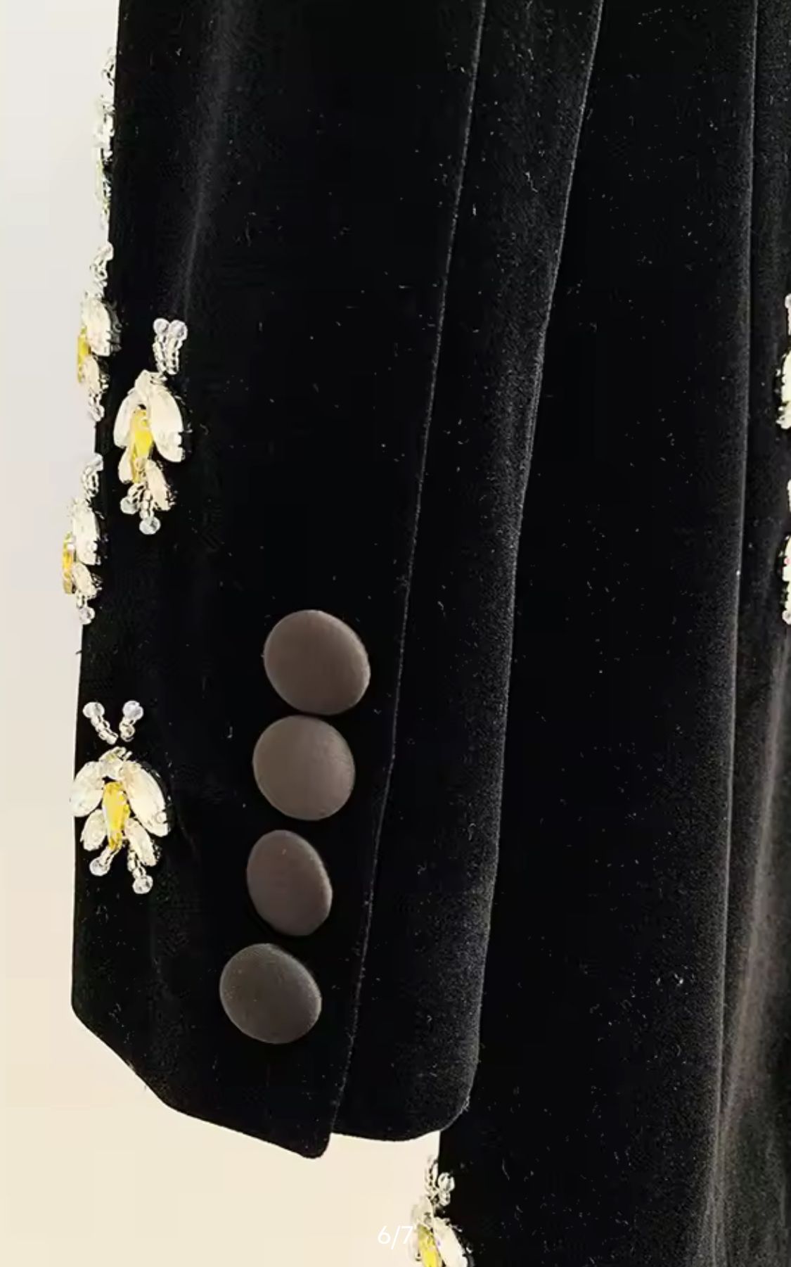 Fitted black velvet blazer with bee-shaped rhinestones