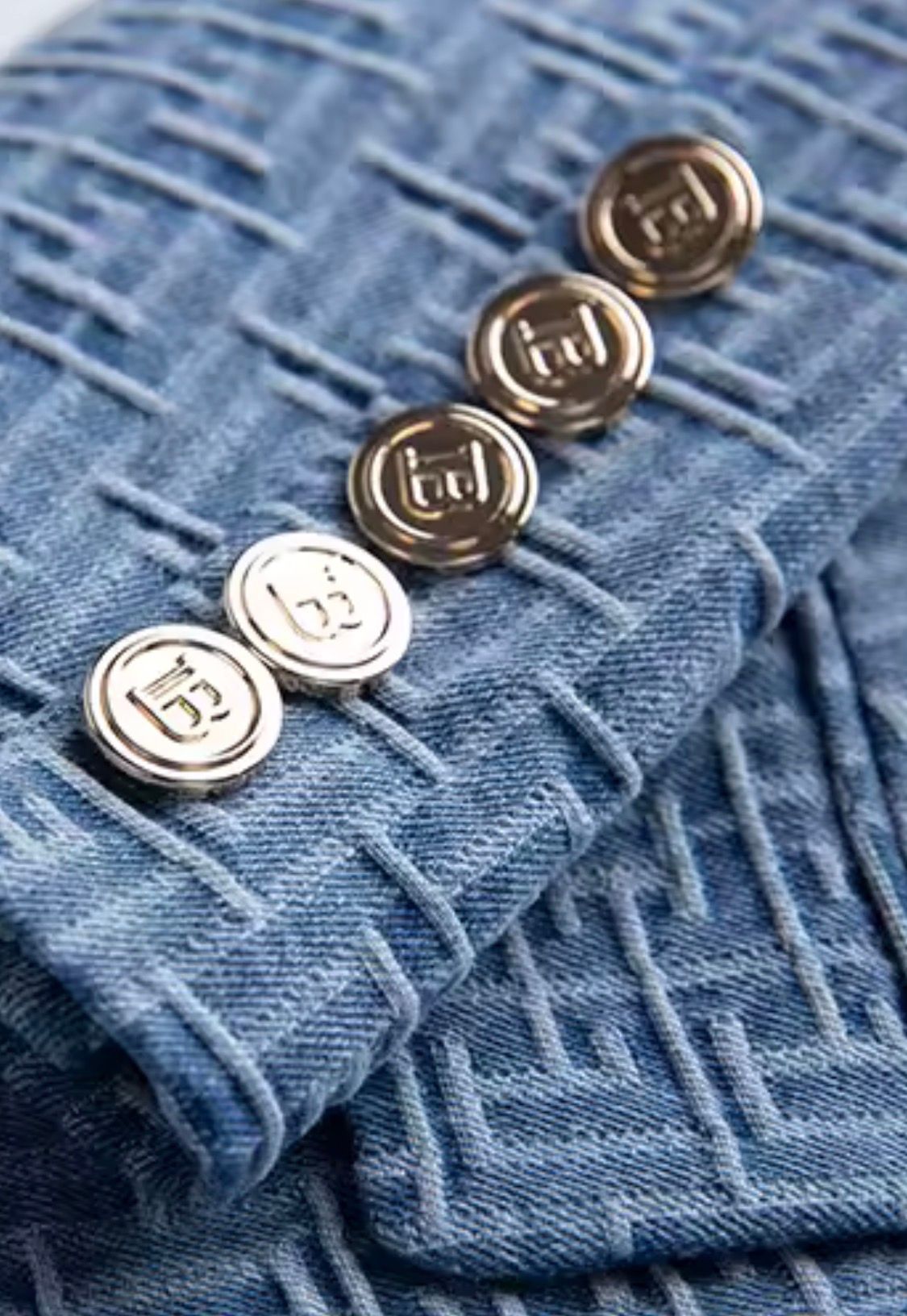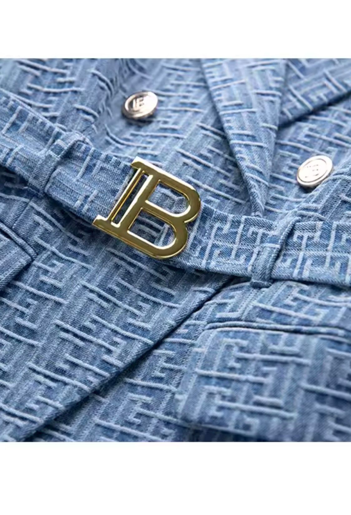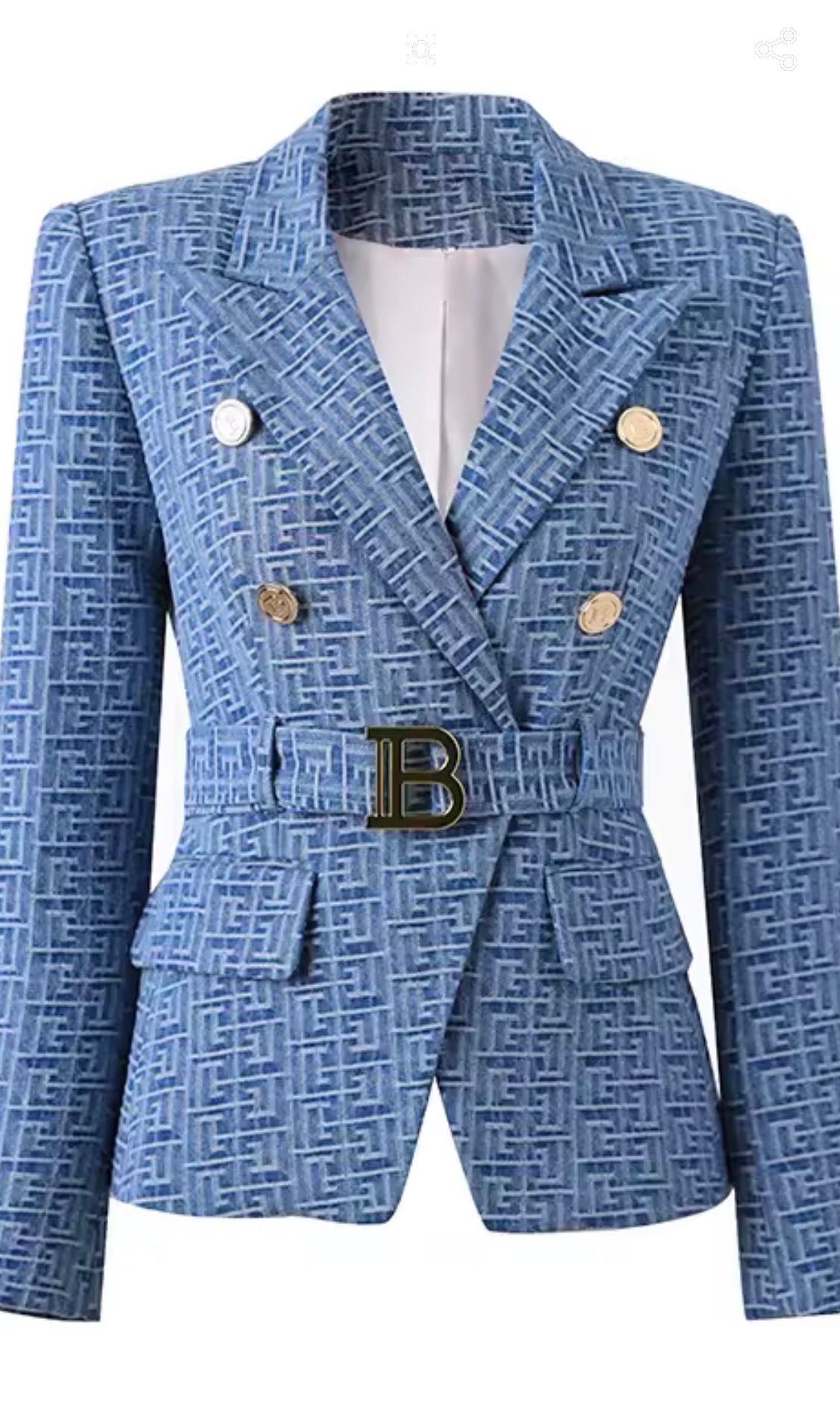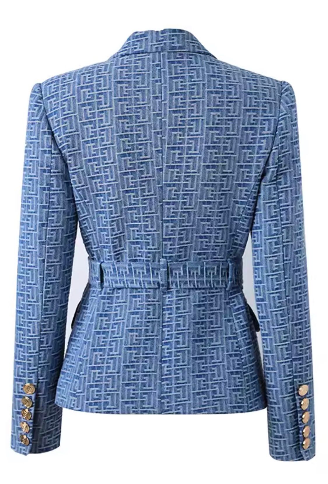 Fitted, non-stretch blue jacquard blazer with metallic gold buttons and belt