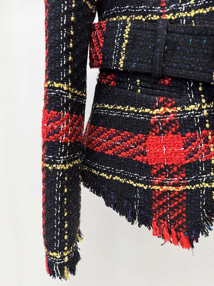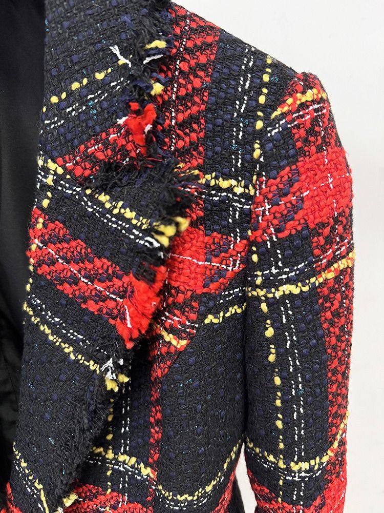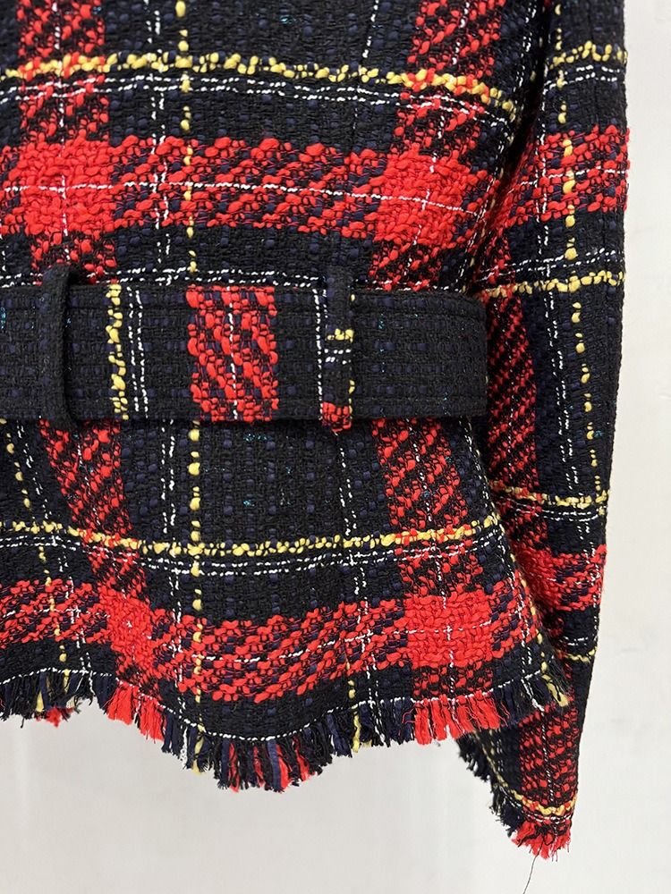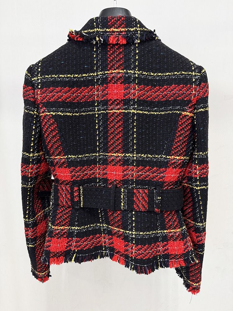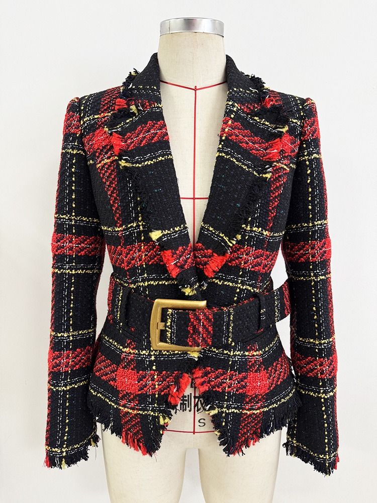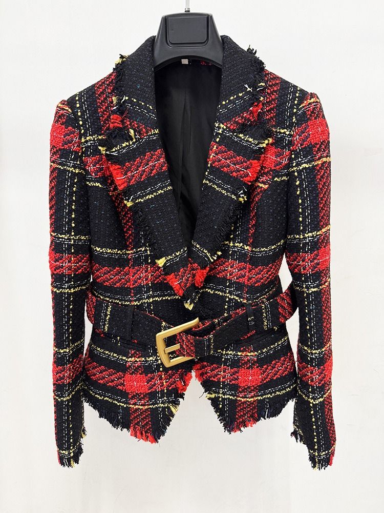 Americana de tejido tweed entallada con cinturón dorado de cuadros en tonos rojos y azul marino