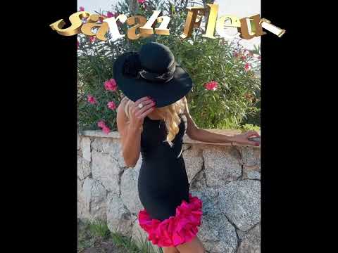 An elegant and sophisticated dress in black with an incredible ruffle at the bottom of the skirt area in satin fabric in fuchsia.