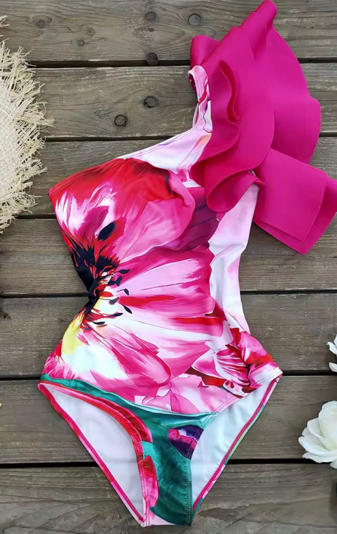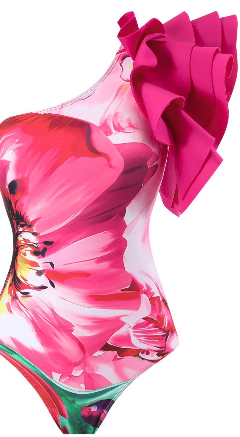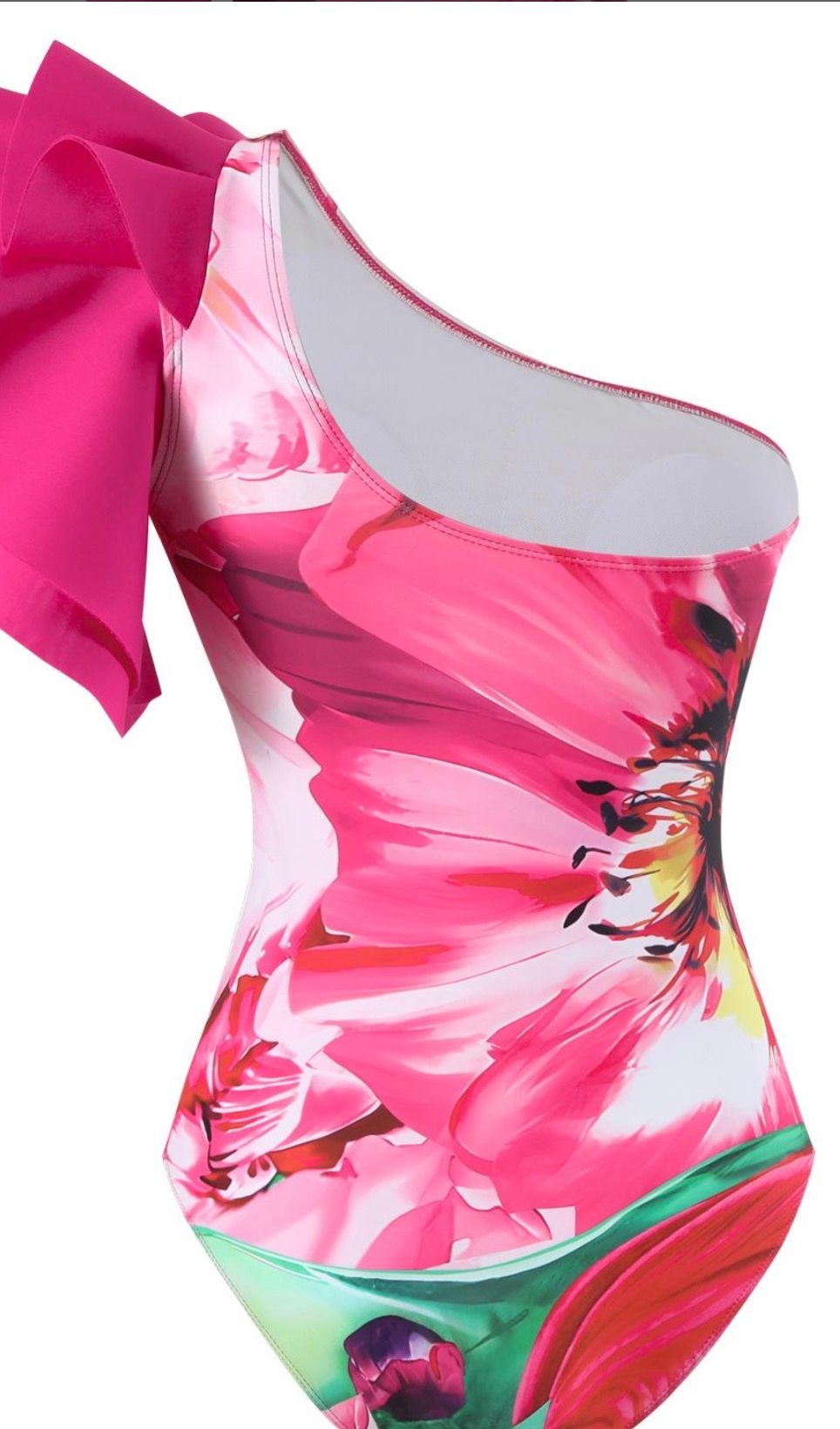 The asymmetrical swimsuit is made of high-quality spantex stretch fabric.
