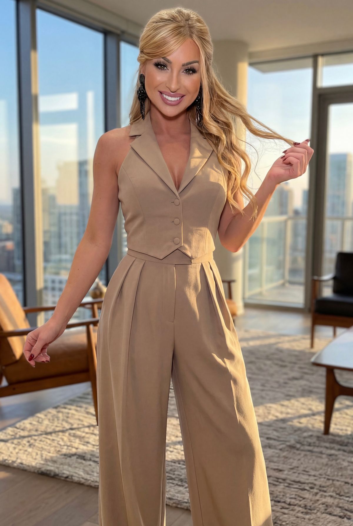 More informationLooking for a business-like outfit for your office meetings, one that makes you feel incredibly empowered, glamorous, and with that chic touch that defines you? We have the solution with this fabulous set. It's a stunning vest top with a visible gold zipper at the back. It features off-the-shoulder styling with a beautiful lapel and faux button detailing at the front. The fabric is non-stretch. The high-waisted, wide-leg trousers will flatter your figure and elongate your legs. They also have side pockets. The darts at the sides add volume to the hips, creating a smaller waist and a more streamlined silhouette. For more information about sizes, please contact me via WhatsApp: +34 623 449 119