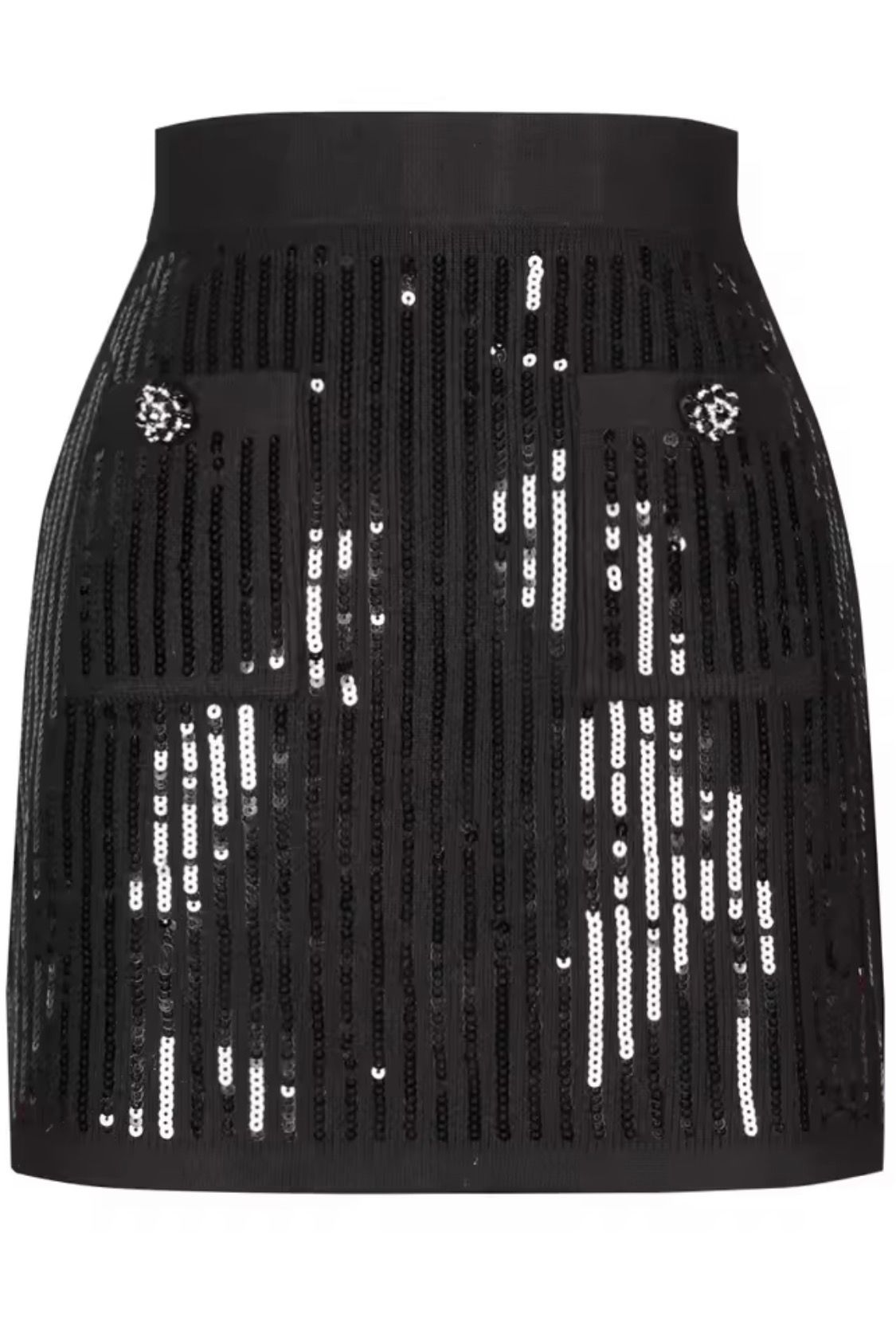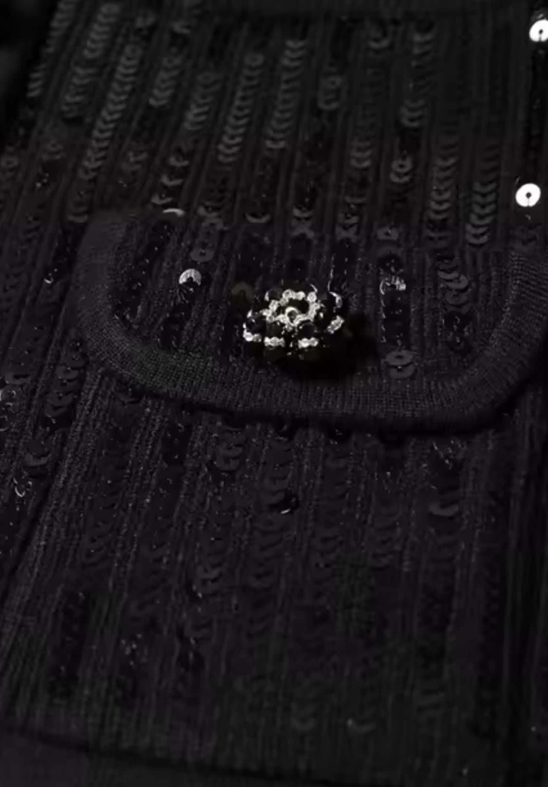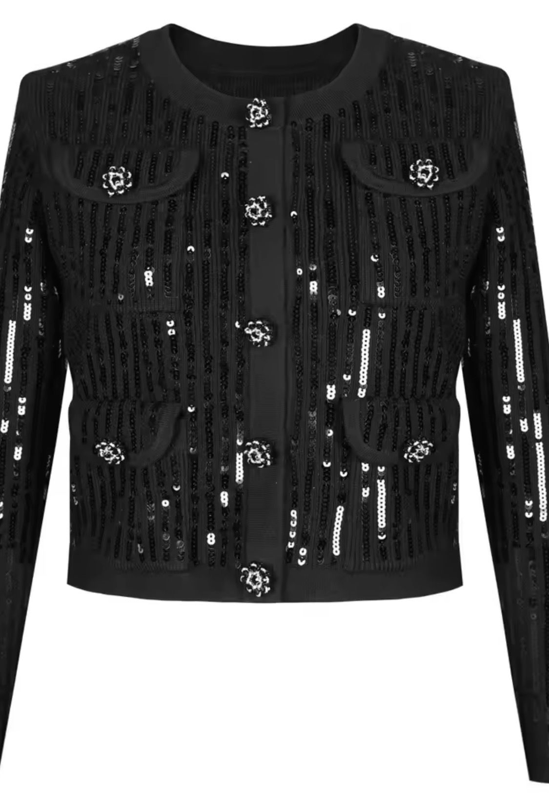 This cardigan features shoulder pads and high-quality rhinestone buttons.