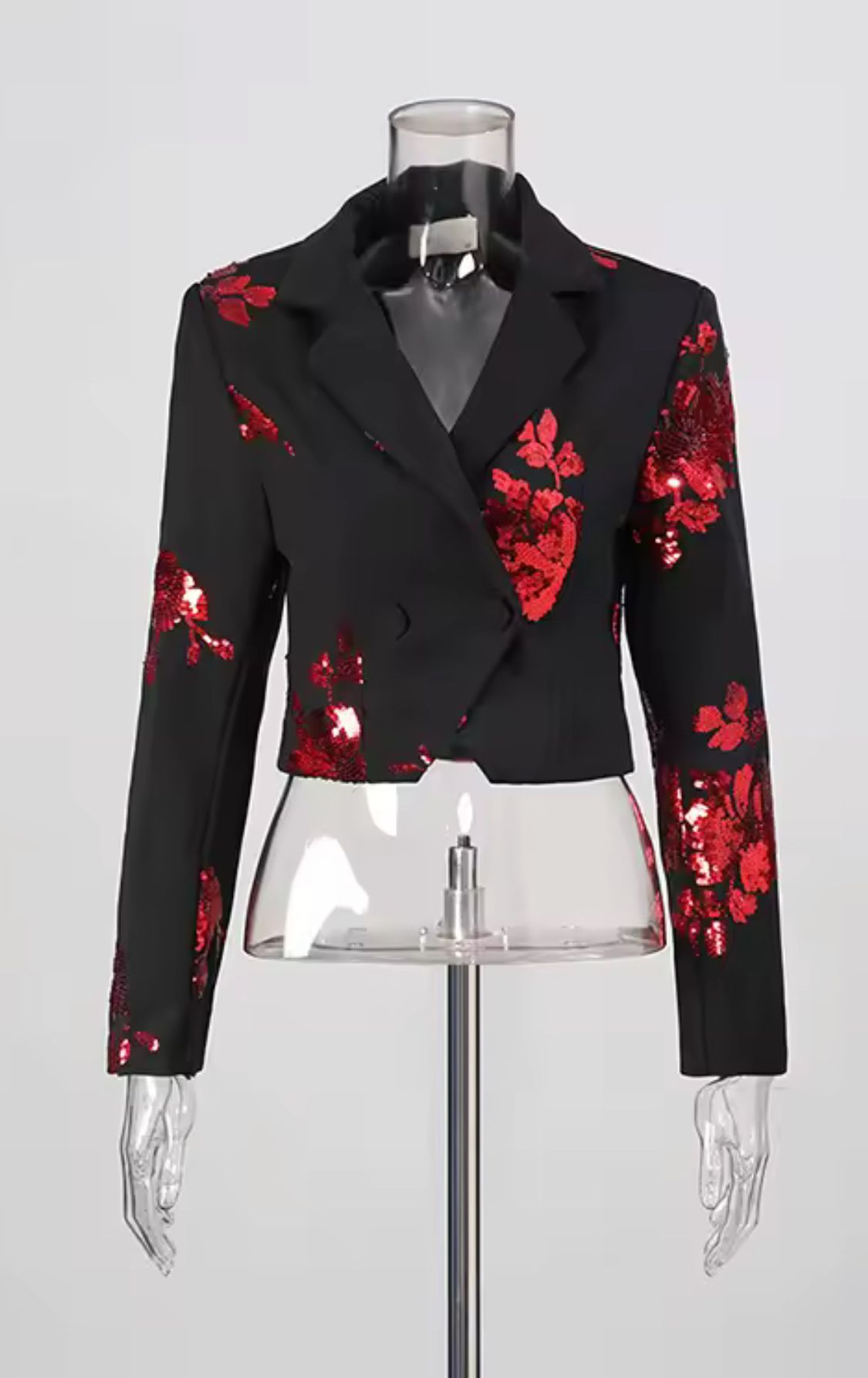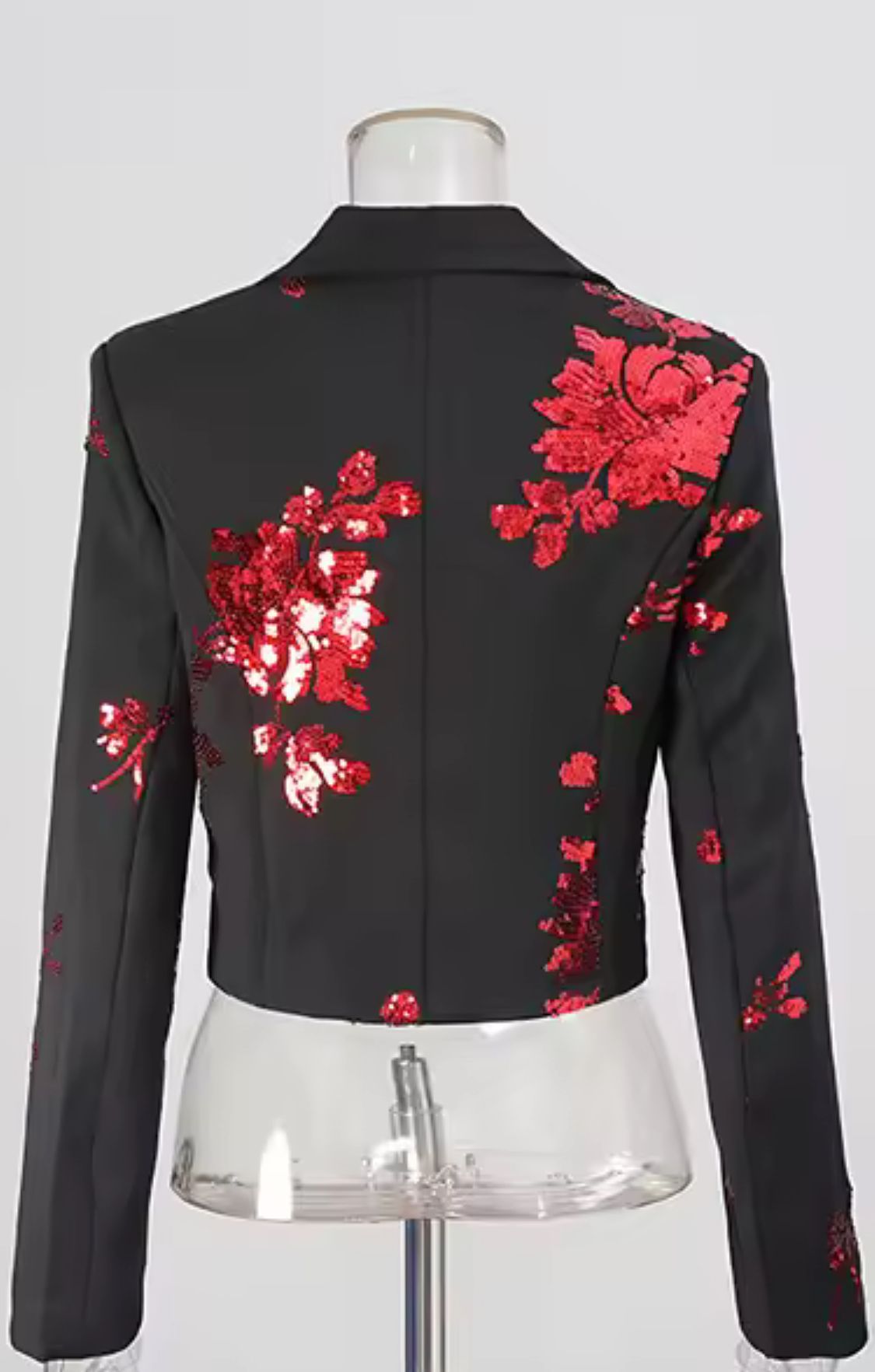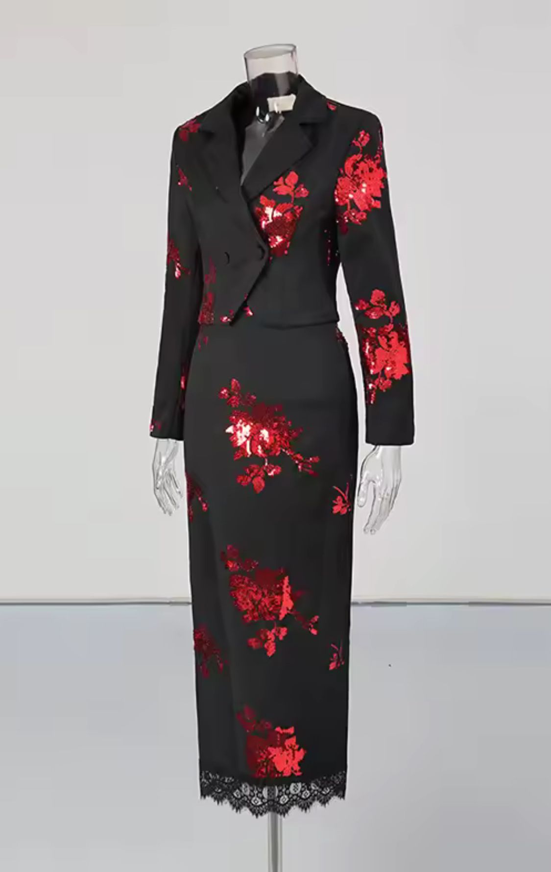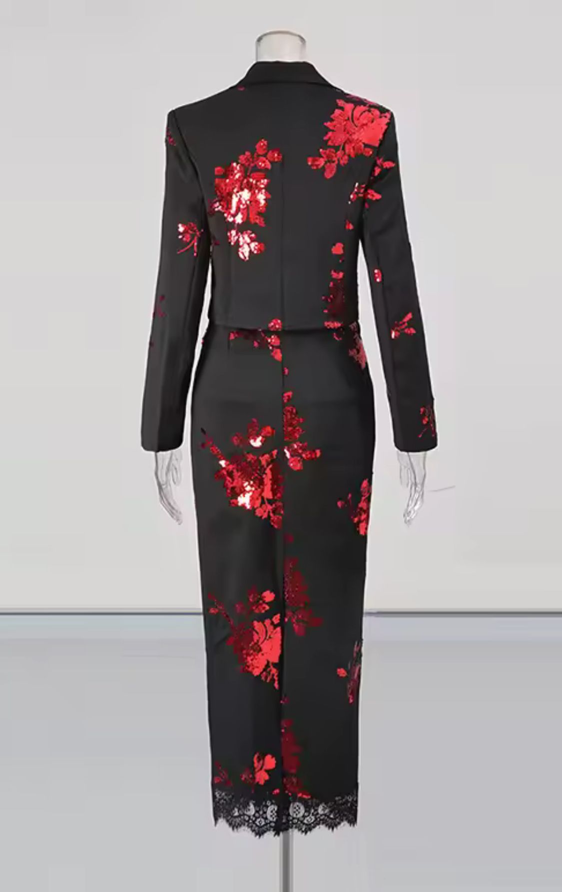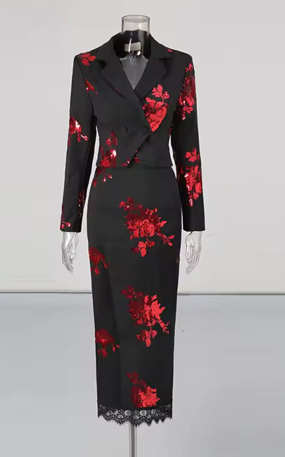Black blazer and matching skirt set with red floral sequin print