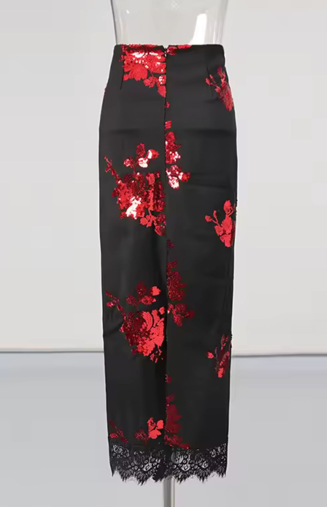 The straight pencil skirt features delicate black lace and a back leg slit.