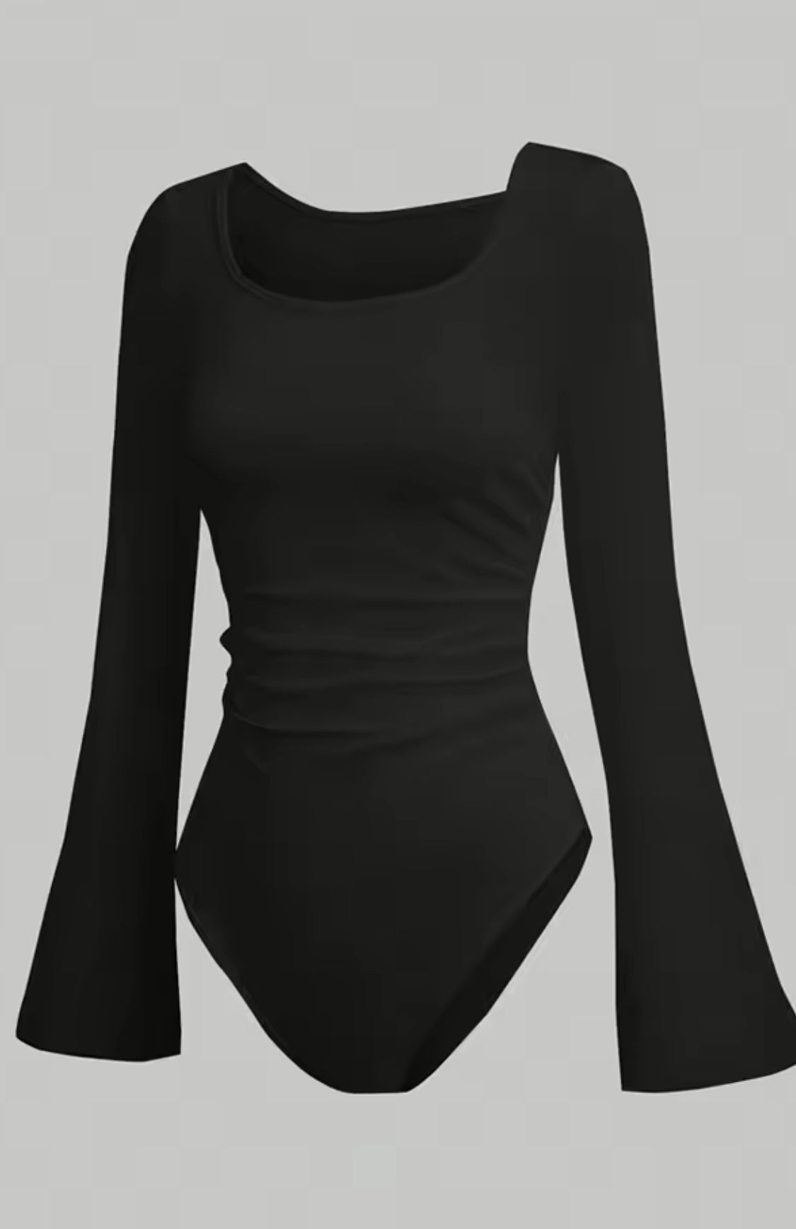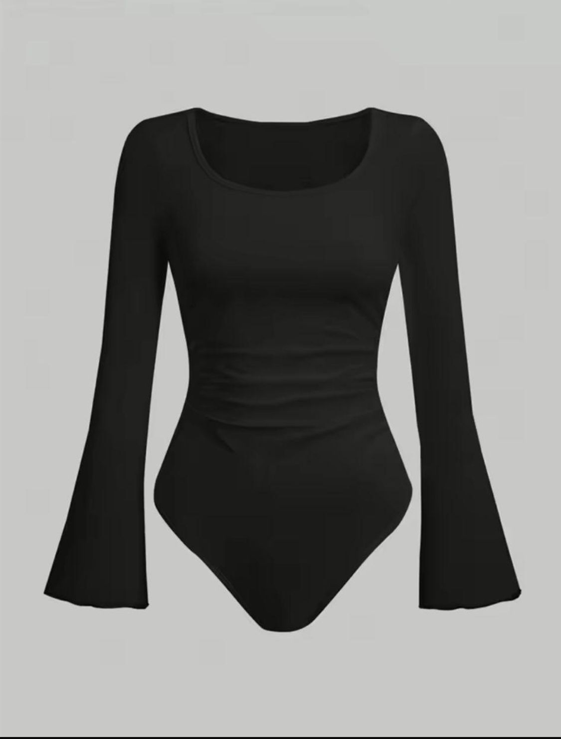 Long-sleeved stretch bodysuit with round neck and flared sleeves in black