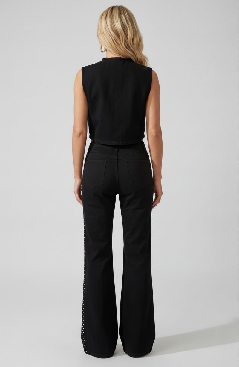 Conjunto de pantalón y chaleco negro con corazones y pedrería plateada en forma de corazón