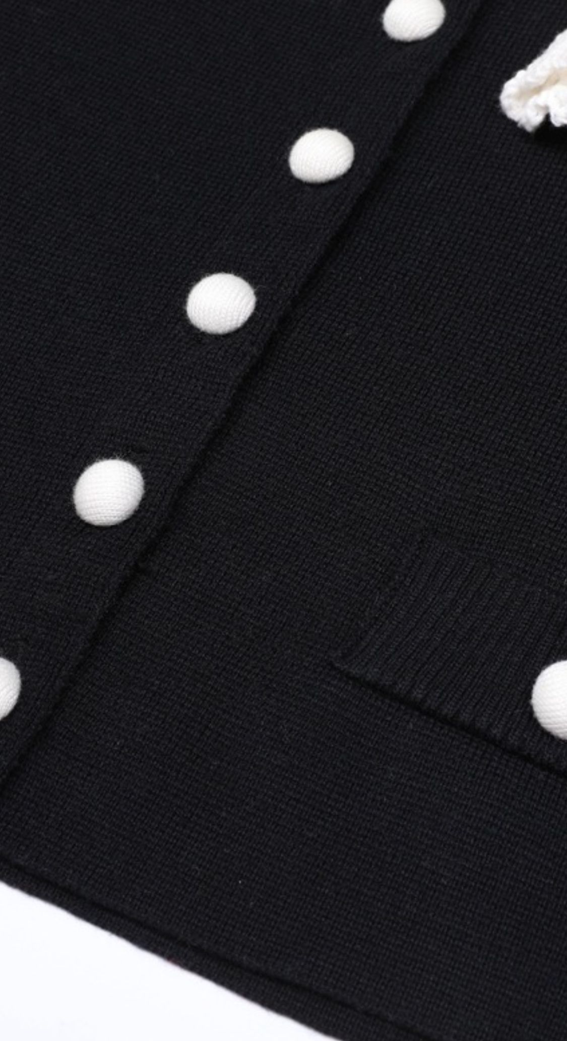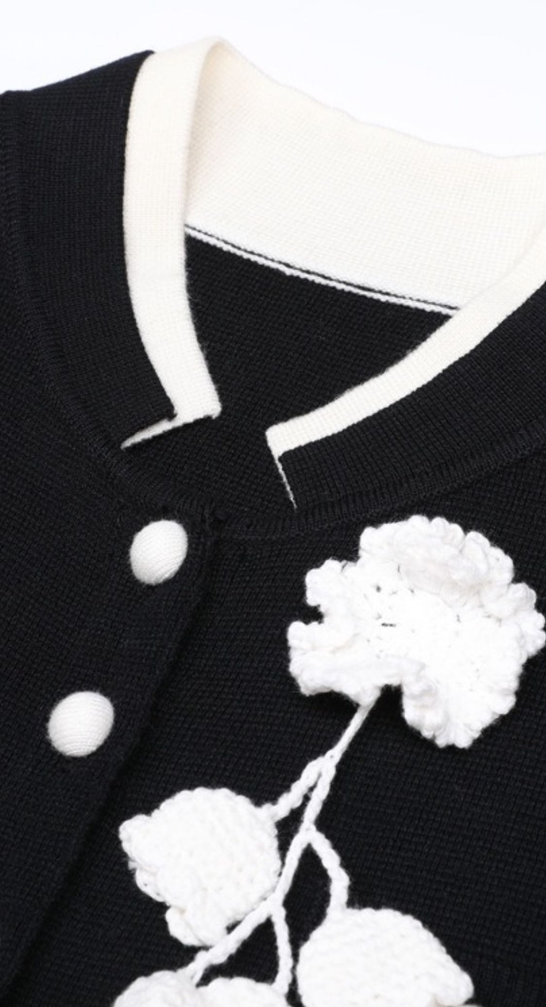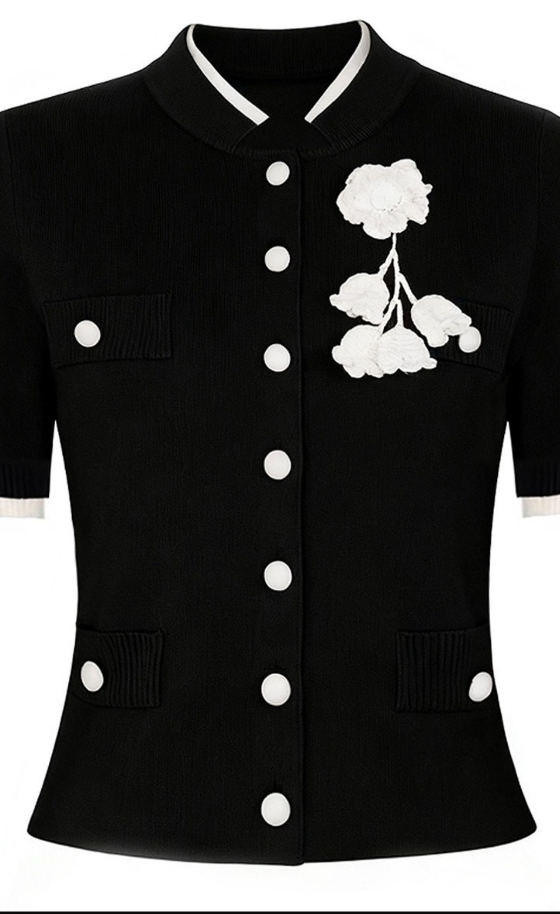 Chaqueta cardigán con botones frontales, falsos bolsillos decorativos con flor blanca en ganchillo.