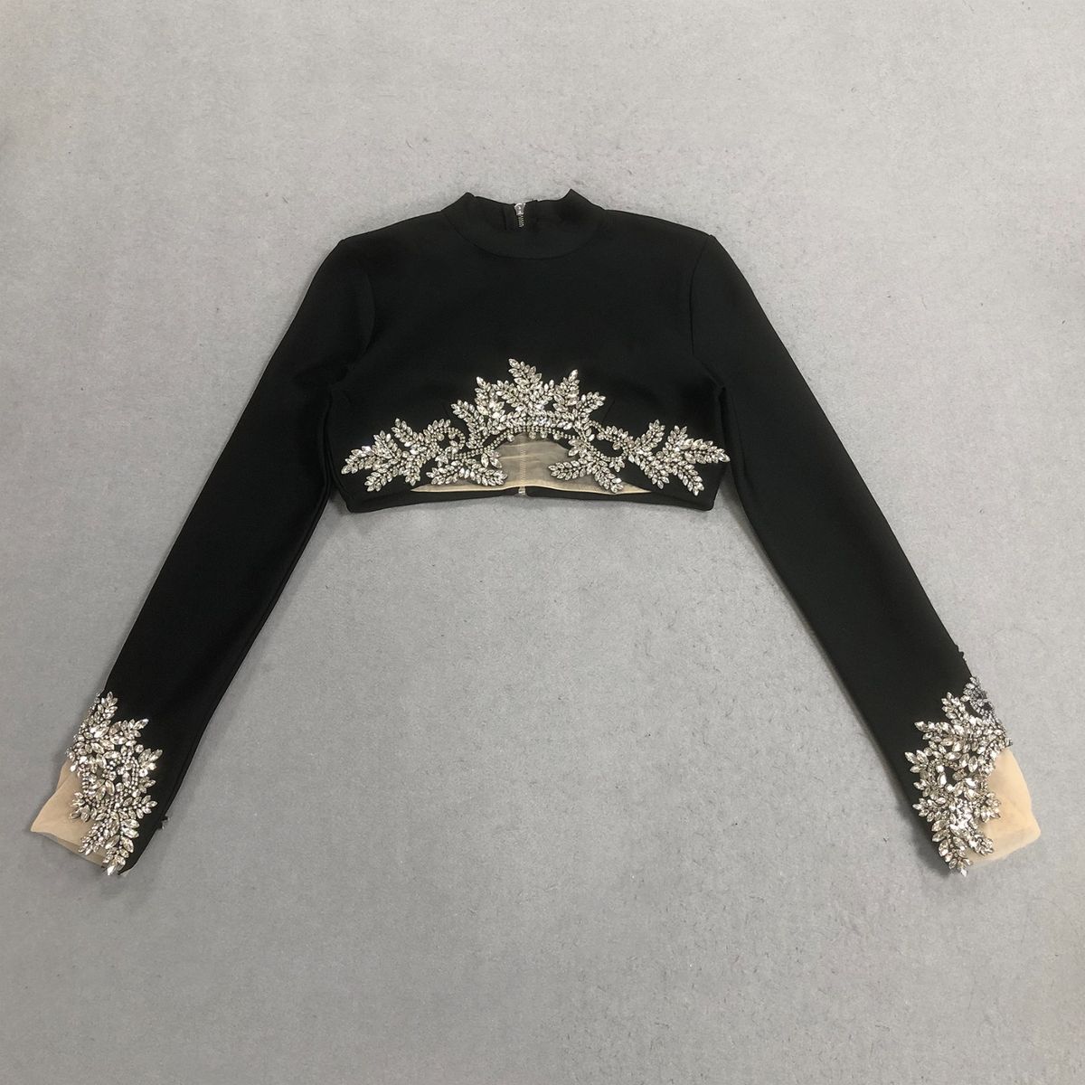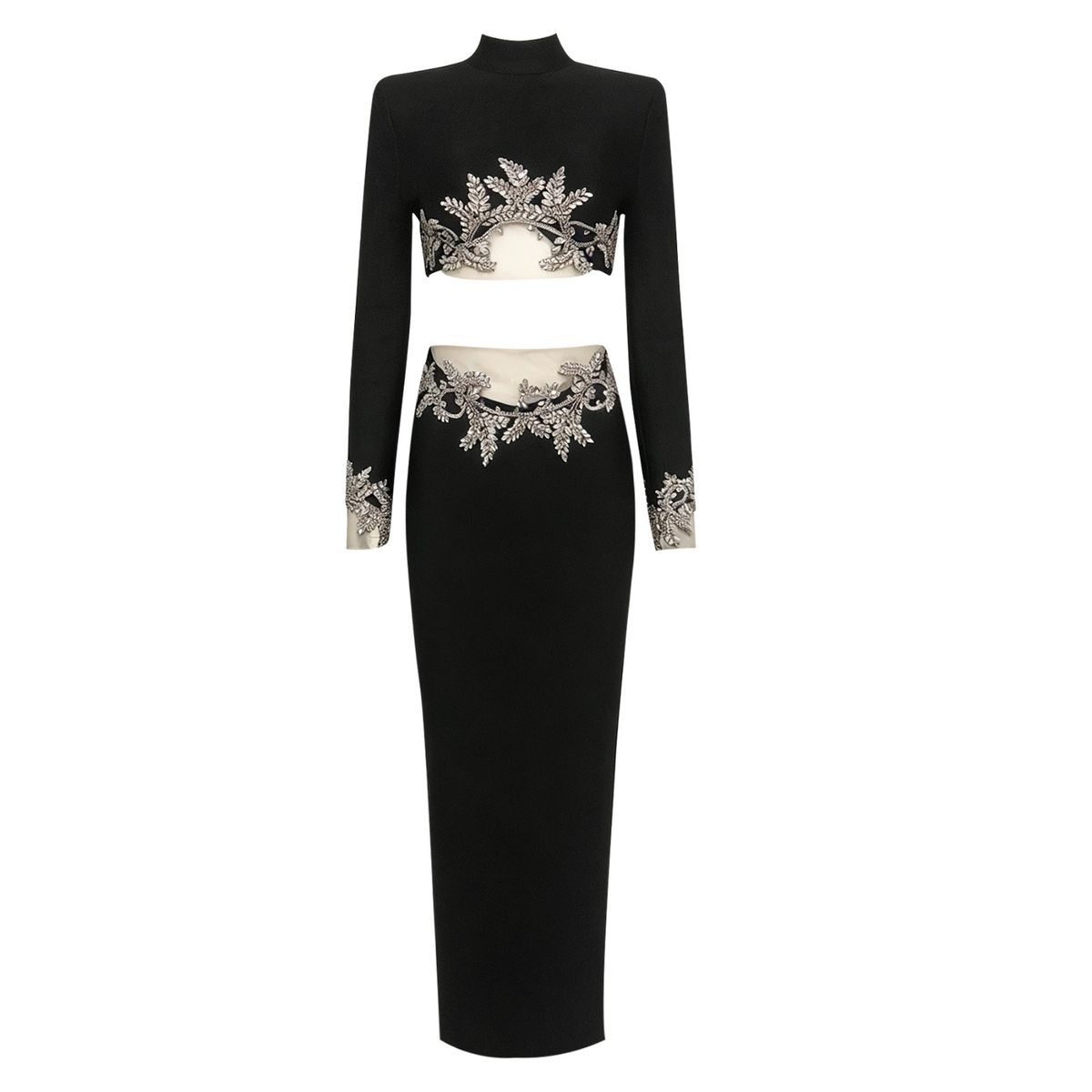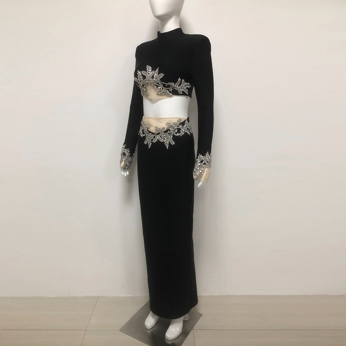 Conjunto elástico de tejido bandage de crop top y falda larga a juego en negro con pedrería