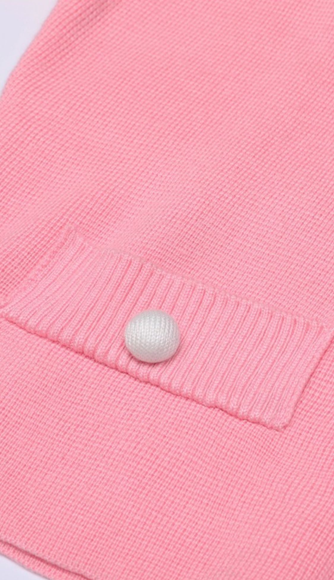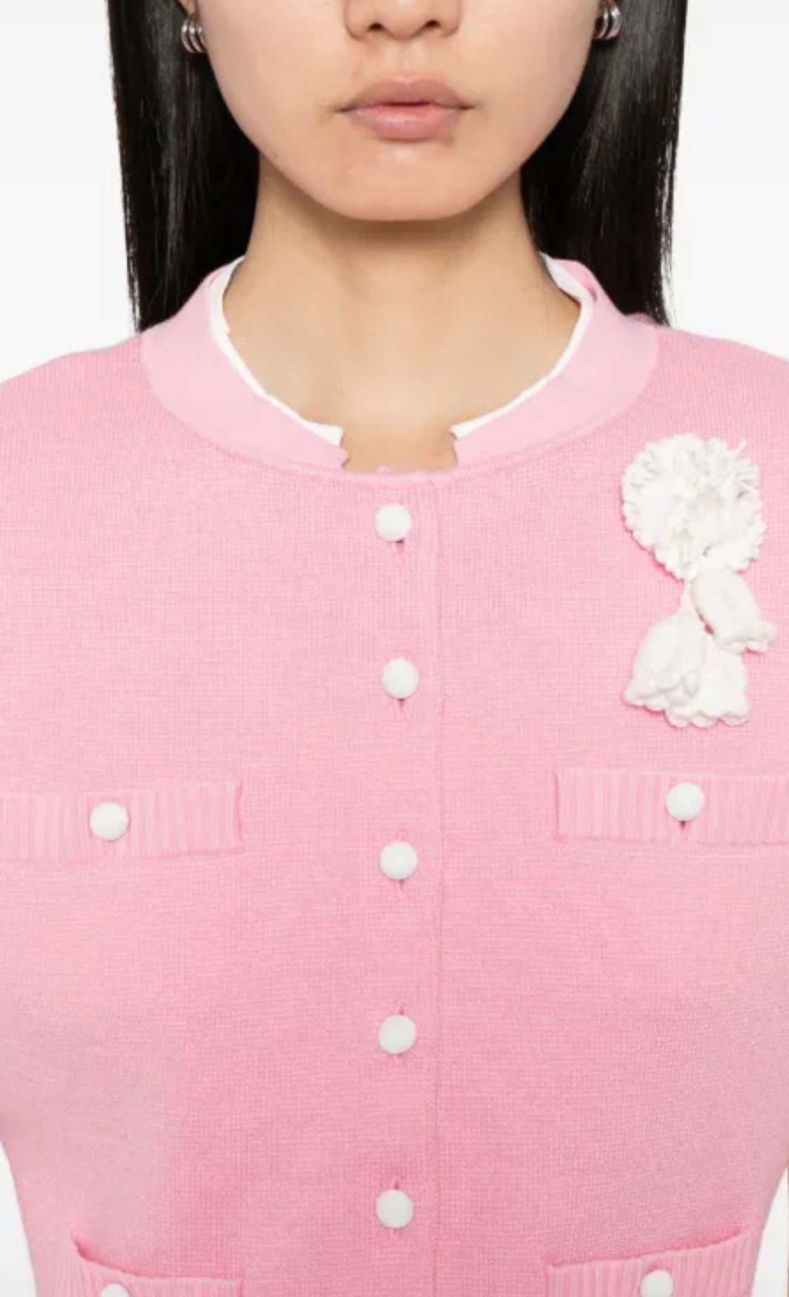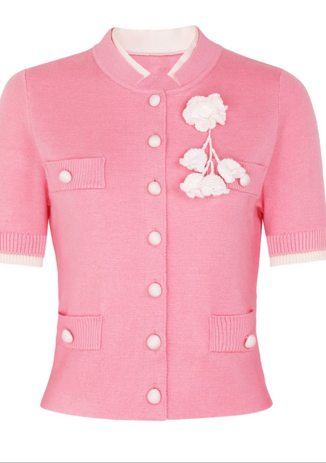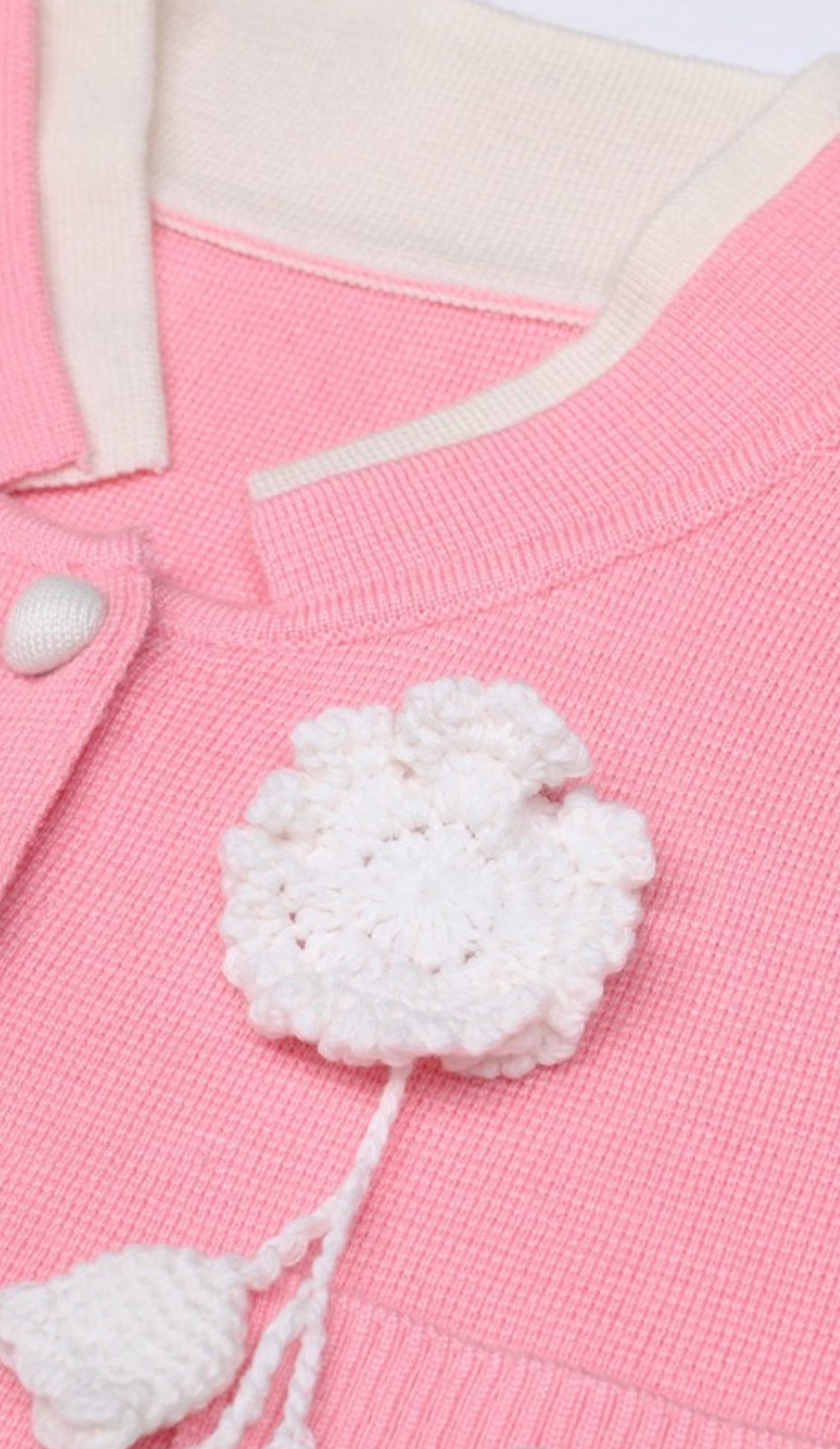 Cardigan jacket with front buttons and decorative faux pockets with a white crocheted flower.