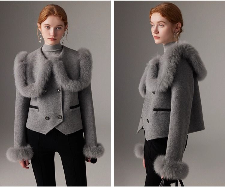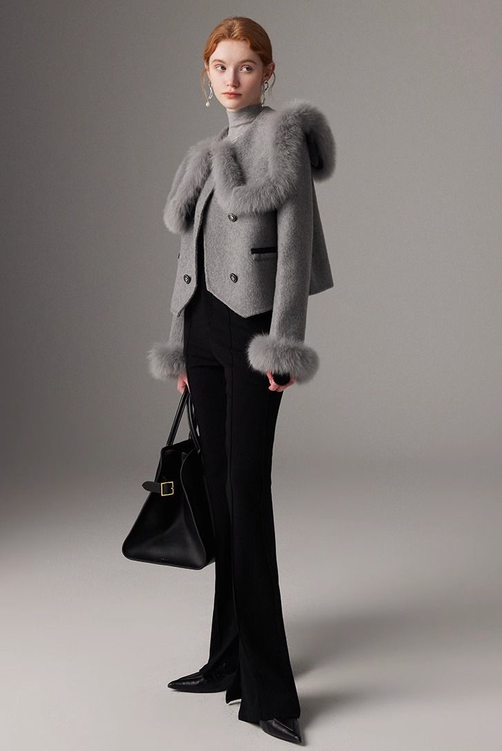 Short wool coat with fur trim on the cuffs, front and back in grey
