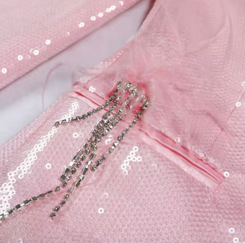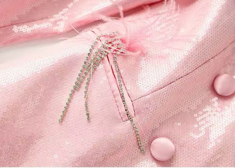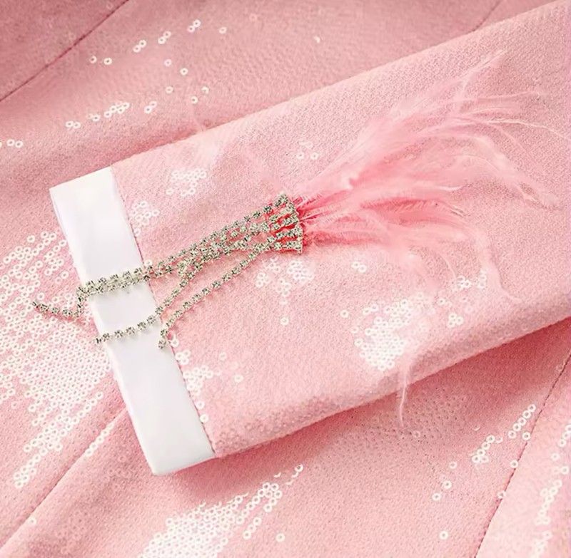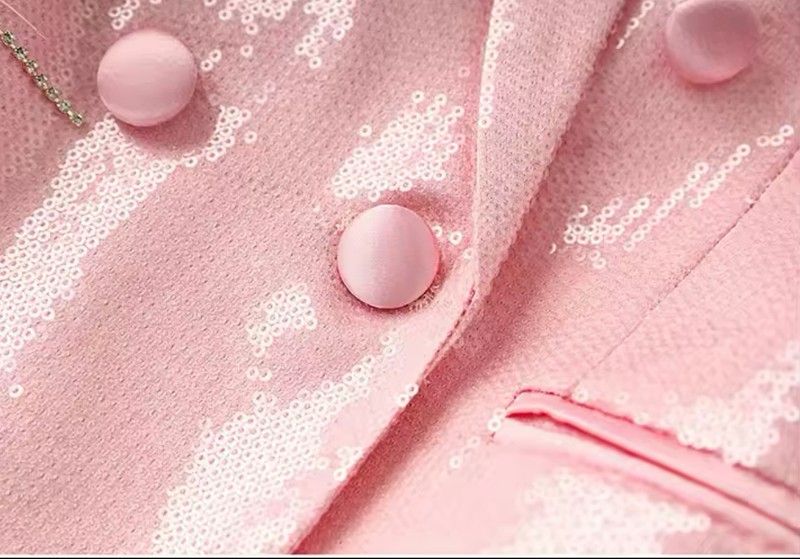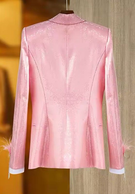 A blazer that redefines luxury. Its vibrant pink, mesmerizing sequins, and exquisite beading capture every eye.