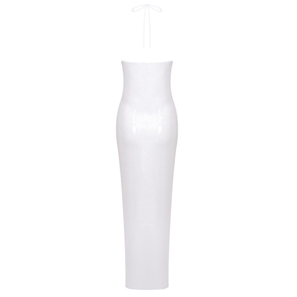A stunning long sequined gown with a wet-look effect, made of stretch fabric.