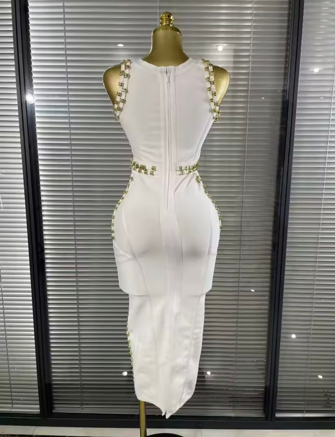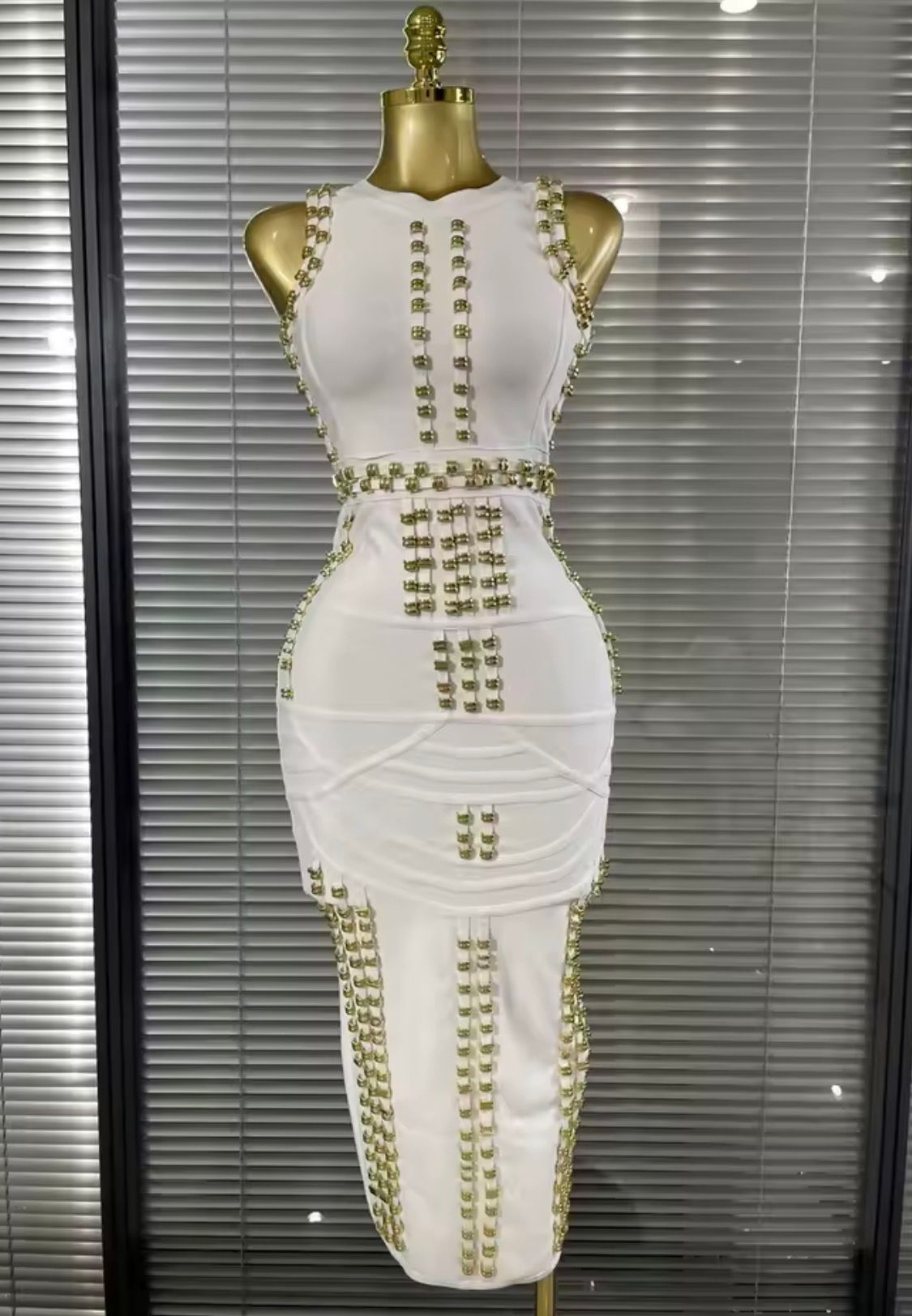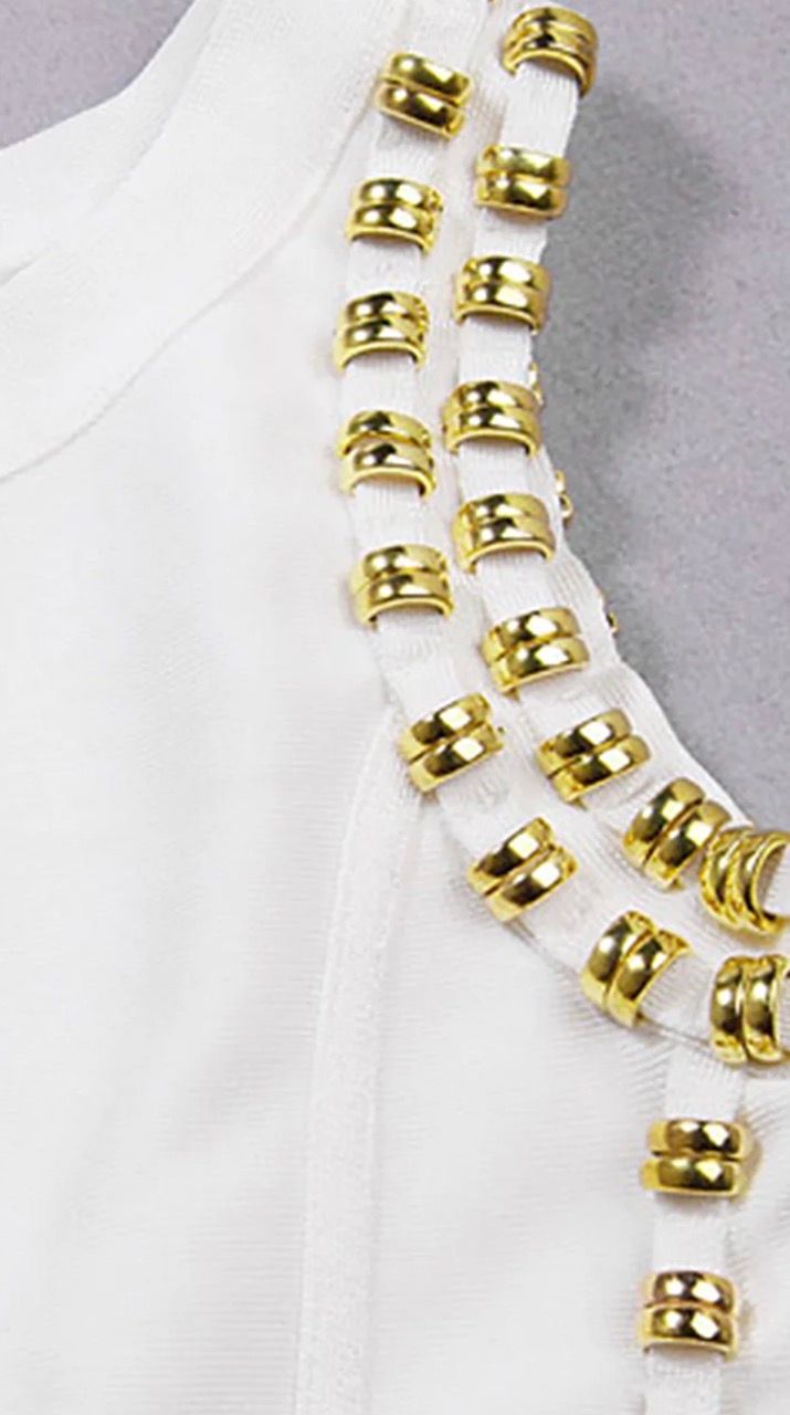 Long, stretchy bandage dress in white with gold studs