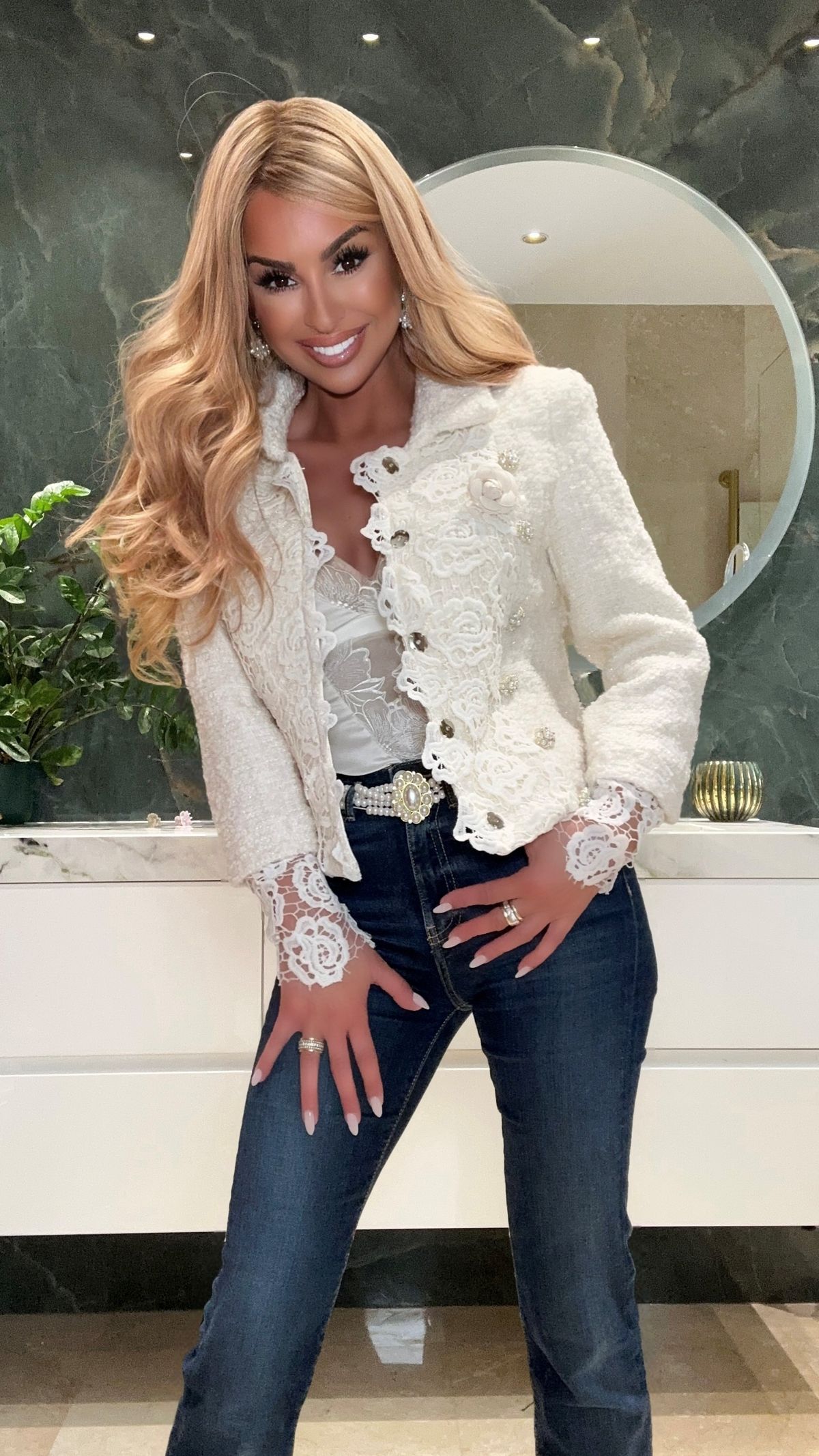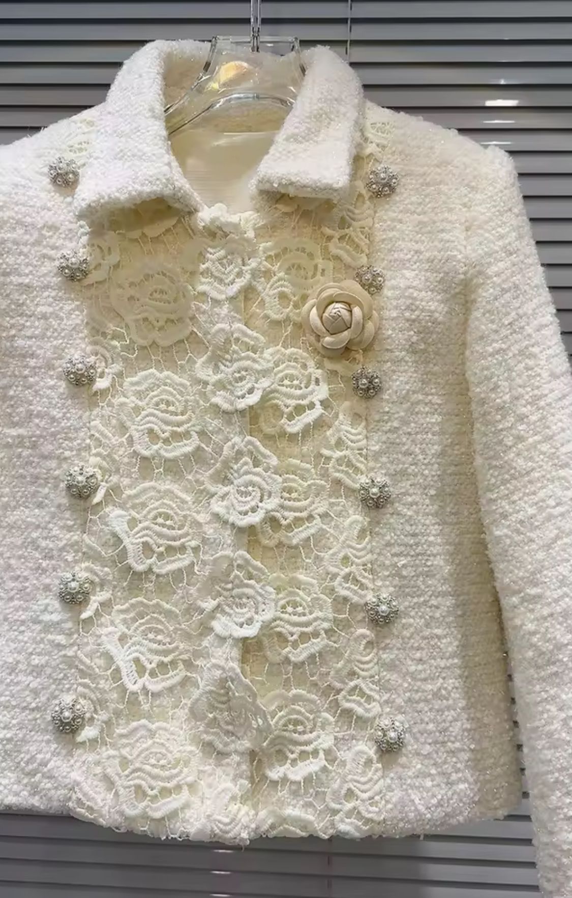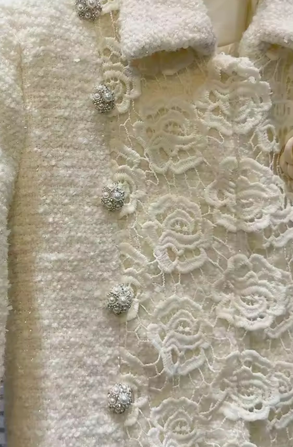 Ivory white tweed jacket with lace trim on the cuffs