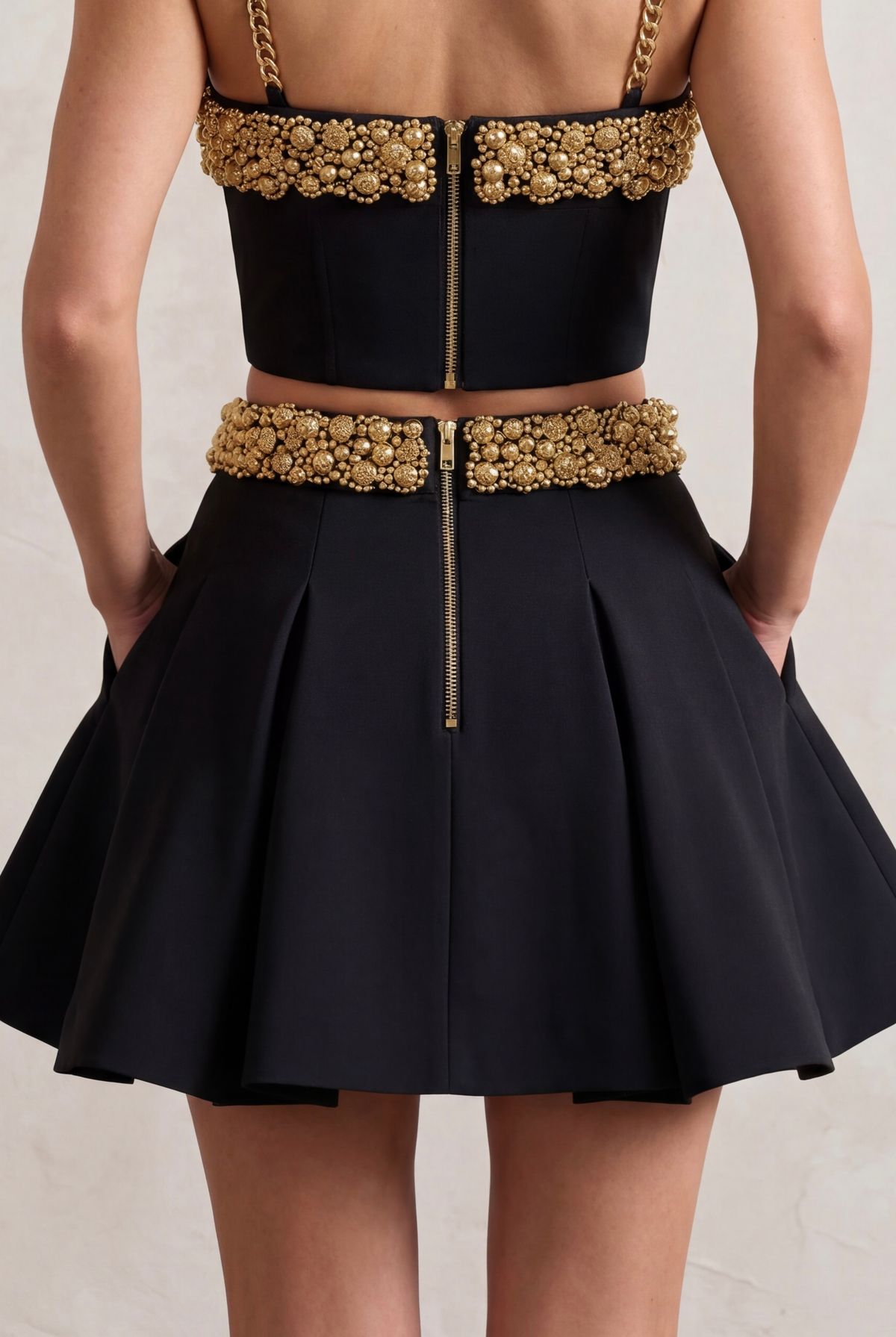 Black crop top and matching culottes set with gold metallic coin embellishments
