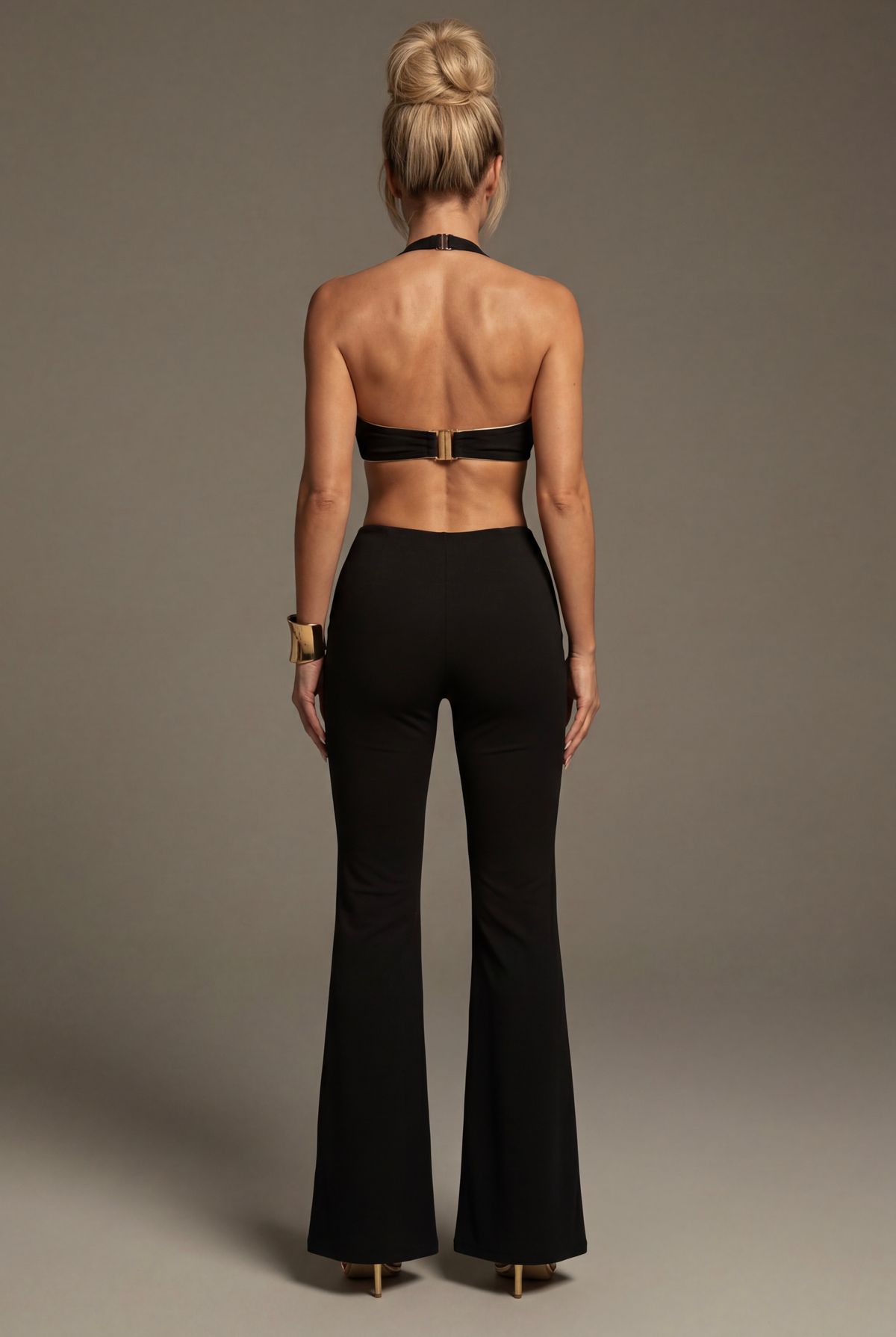 A spectacular black stretch jumpsuit with gold details.
