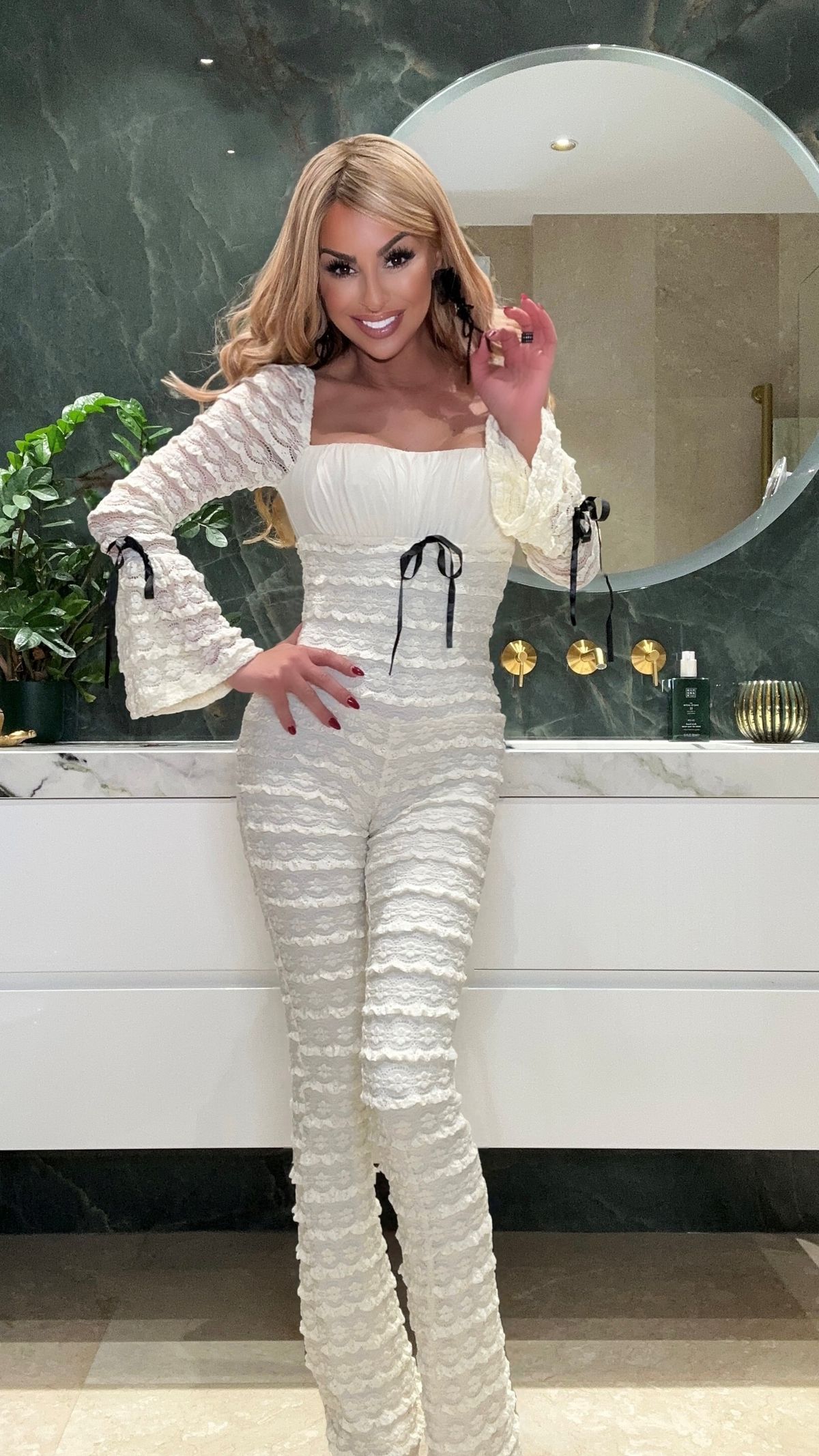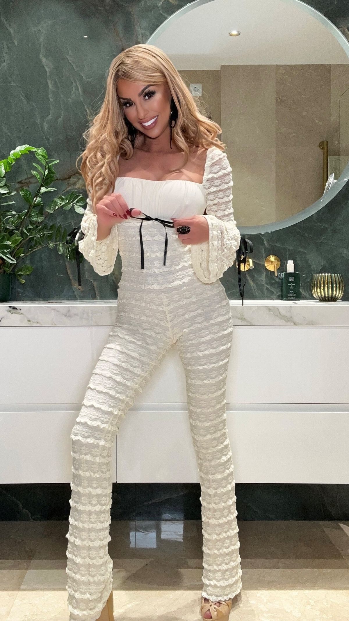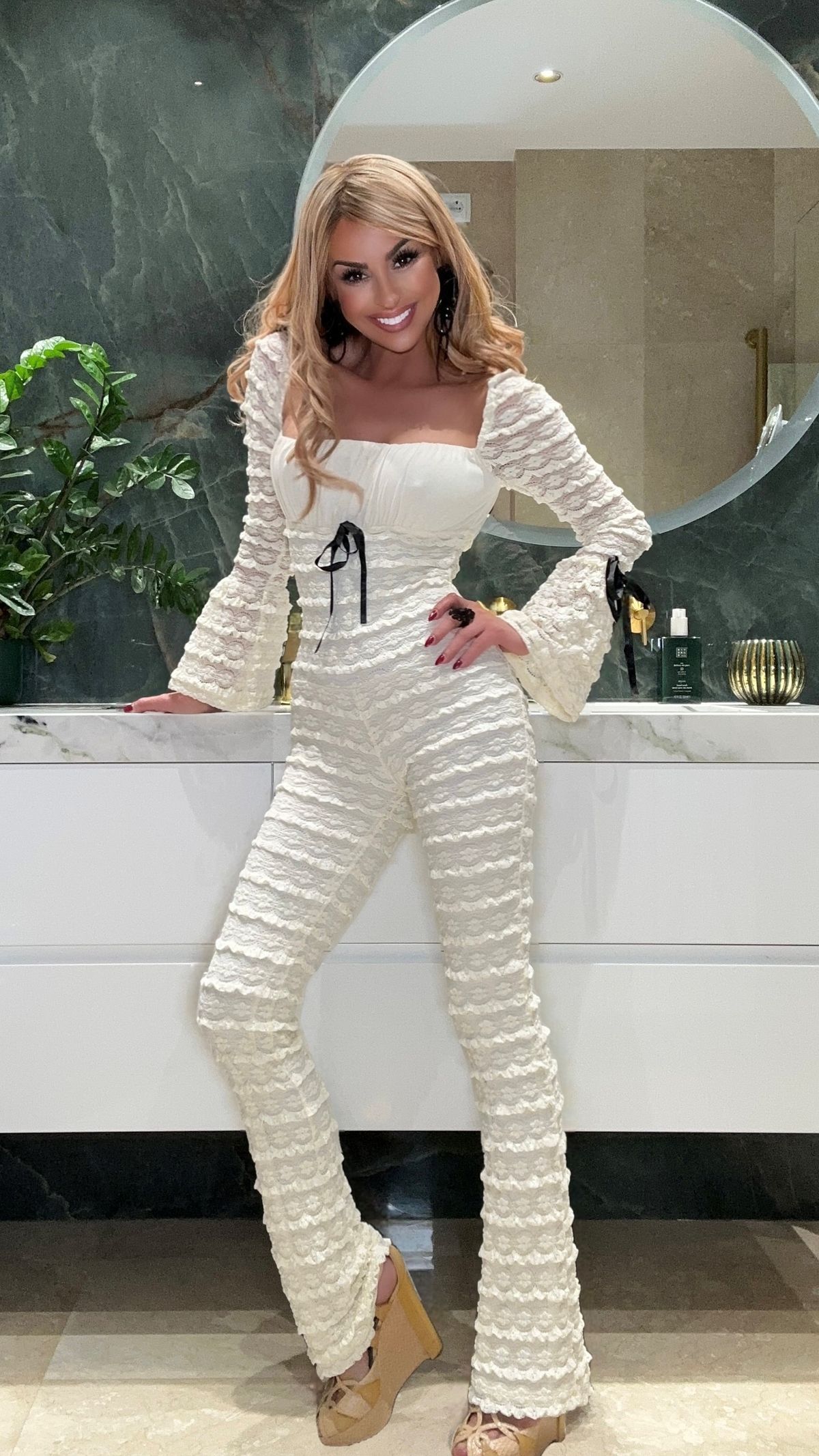 Beige lace stretch jumpsuit with black bows