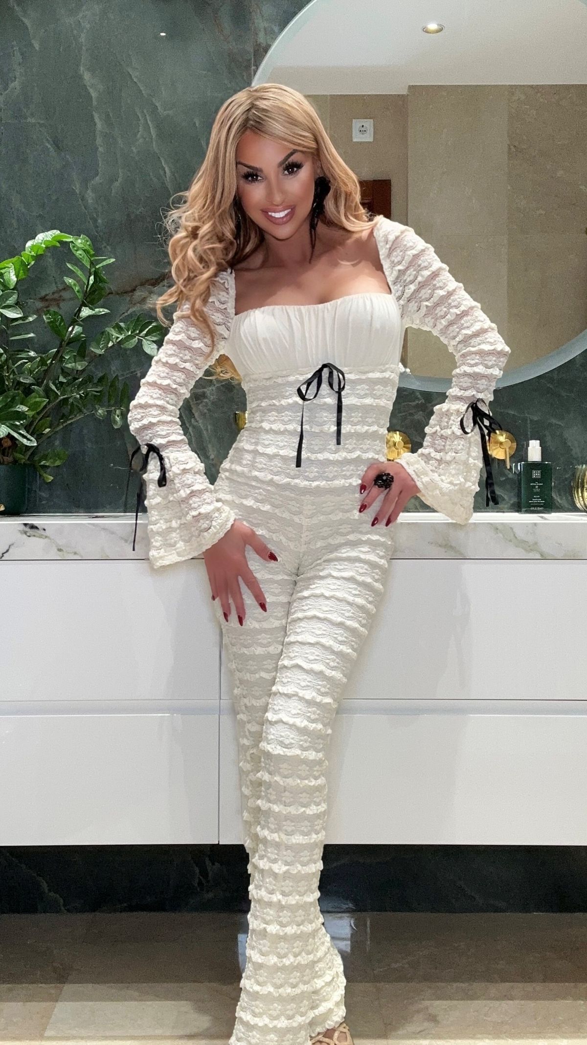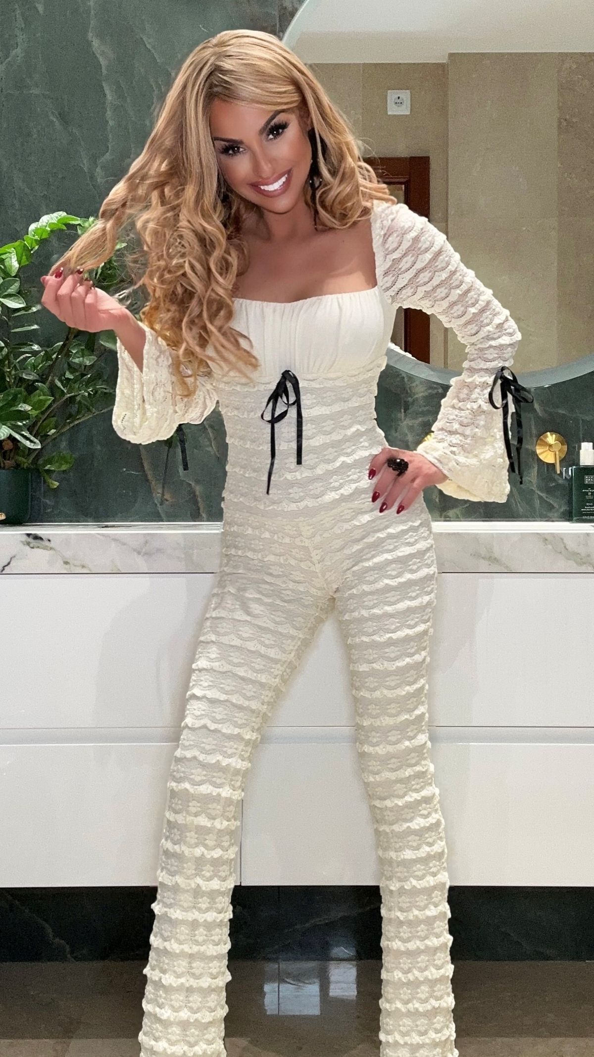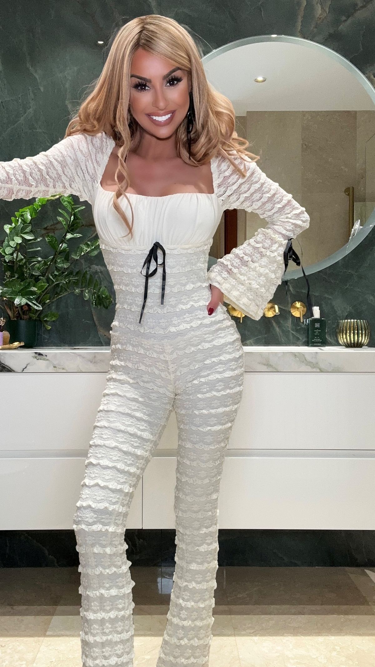 Beige lace stretch jumpsuit with black bows