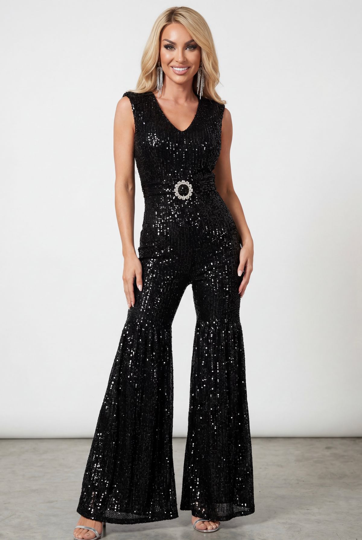 Un moderno y atrevido mono elástico de lentejuelas en un vibrante negro.