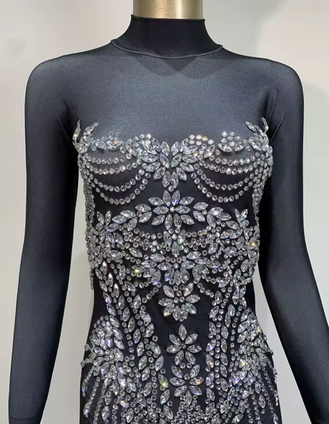 Maravillosa pedrería de alta calidad decora el torso de manera hiper llamativa.