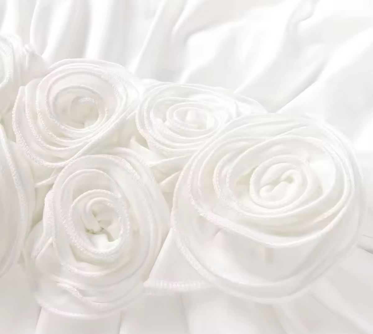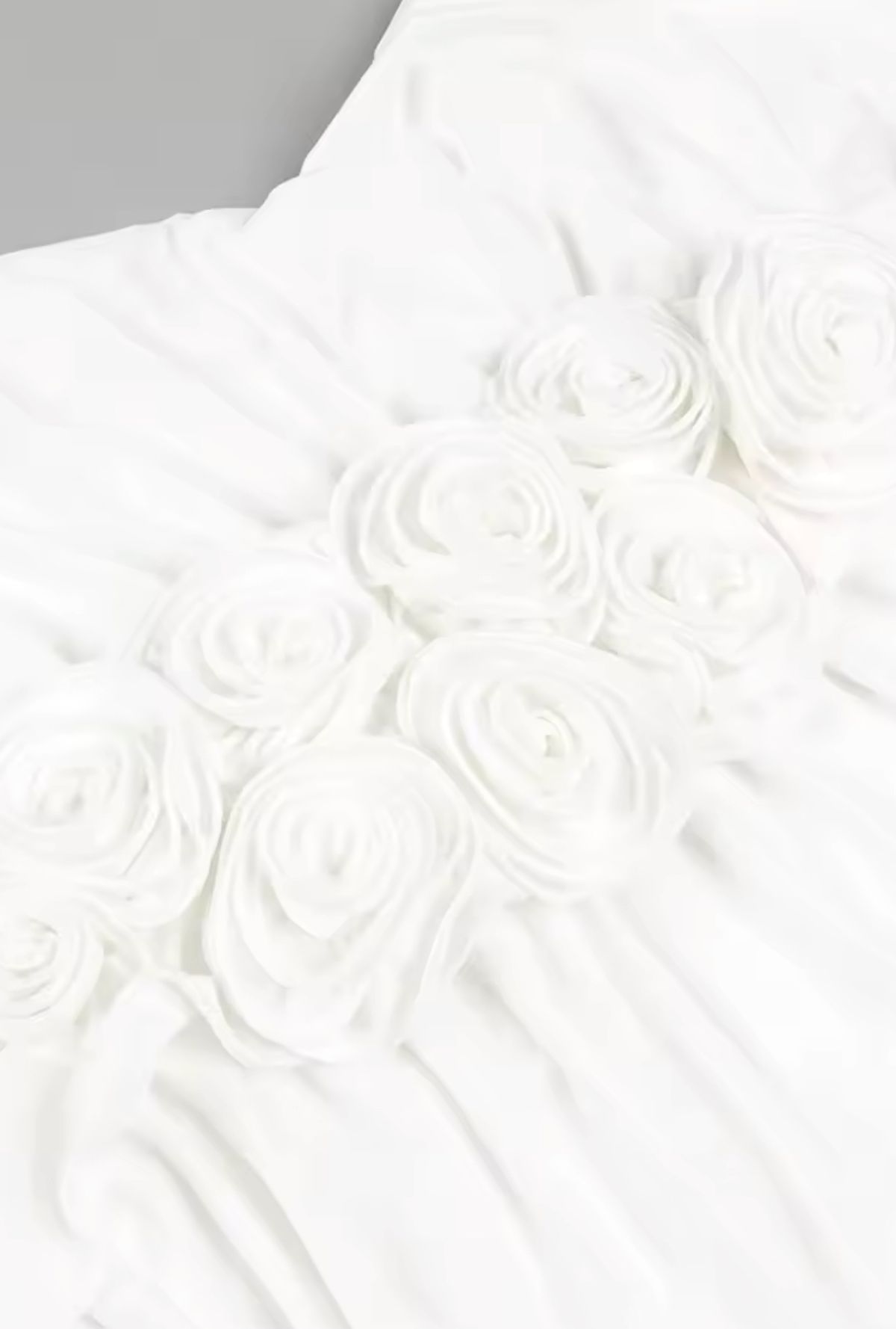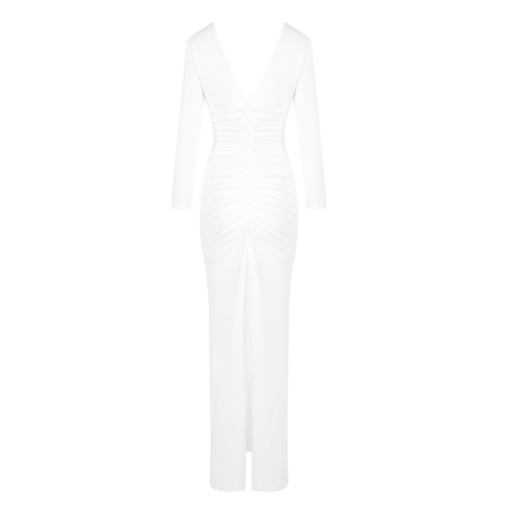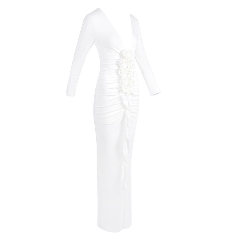 Long white stretch dress with long sleeves and a V-neckline with decorative flowers