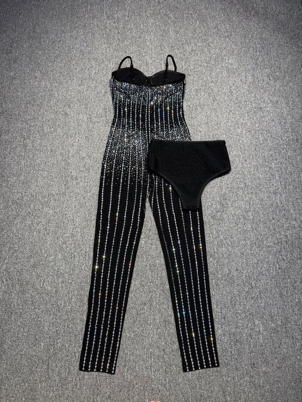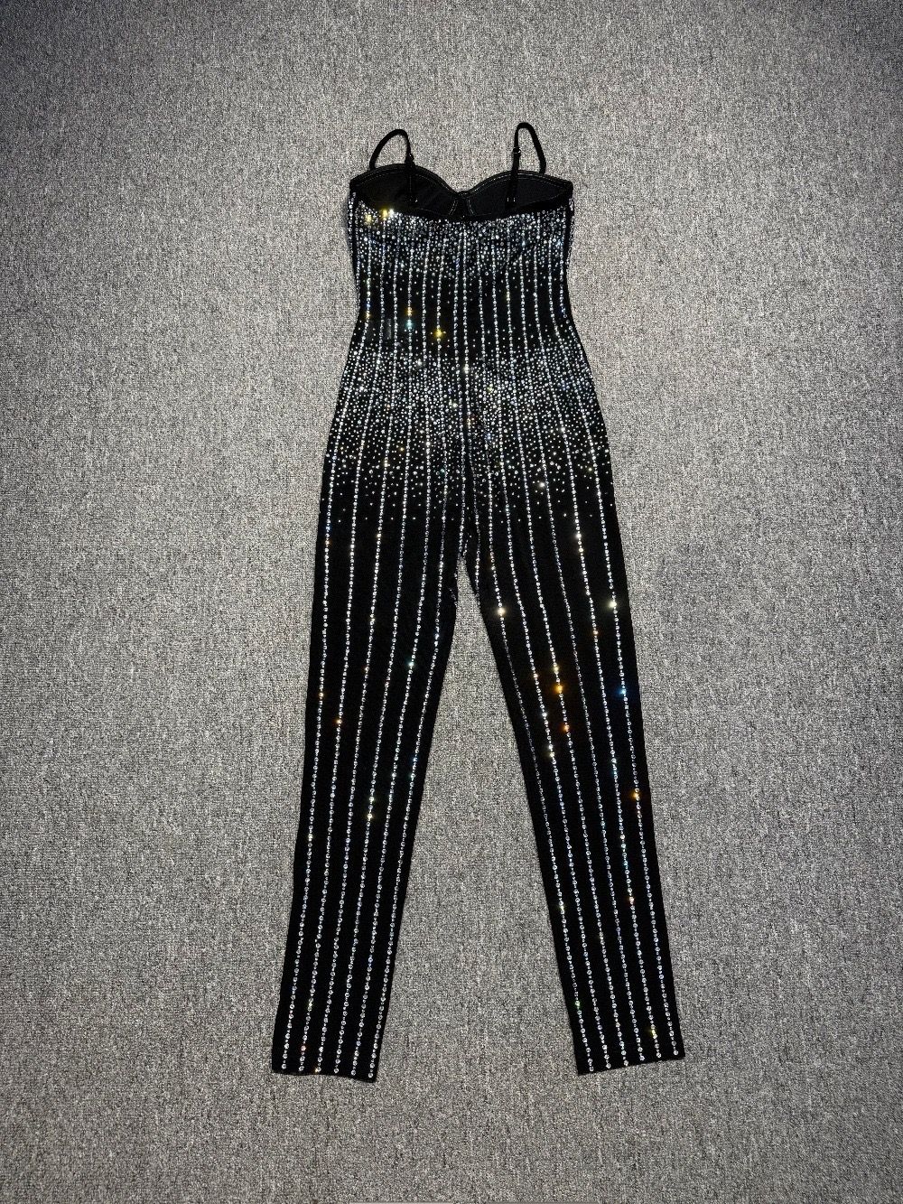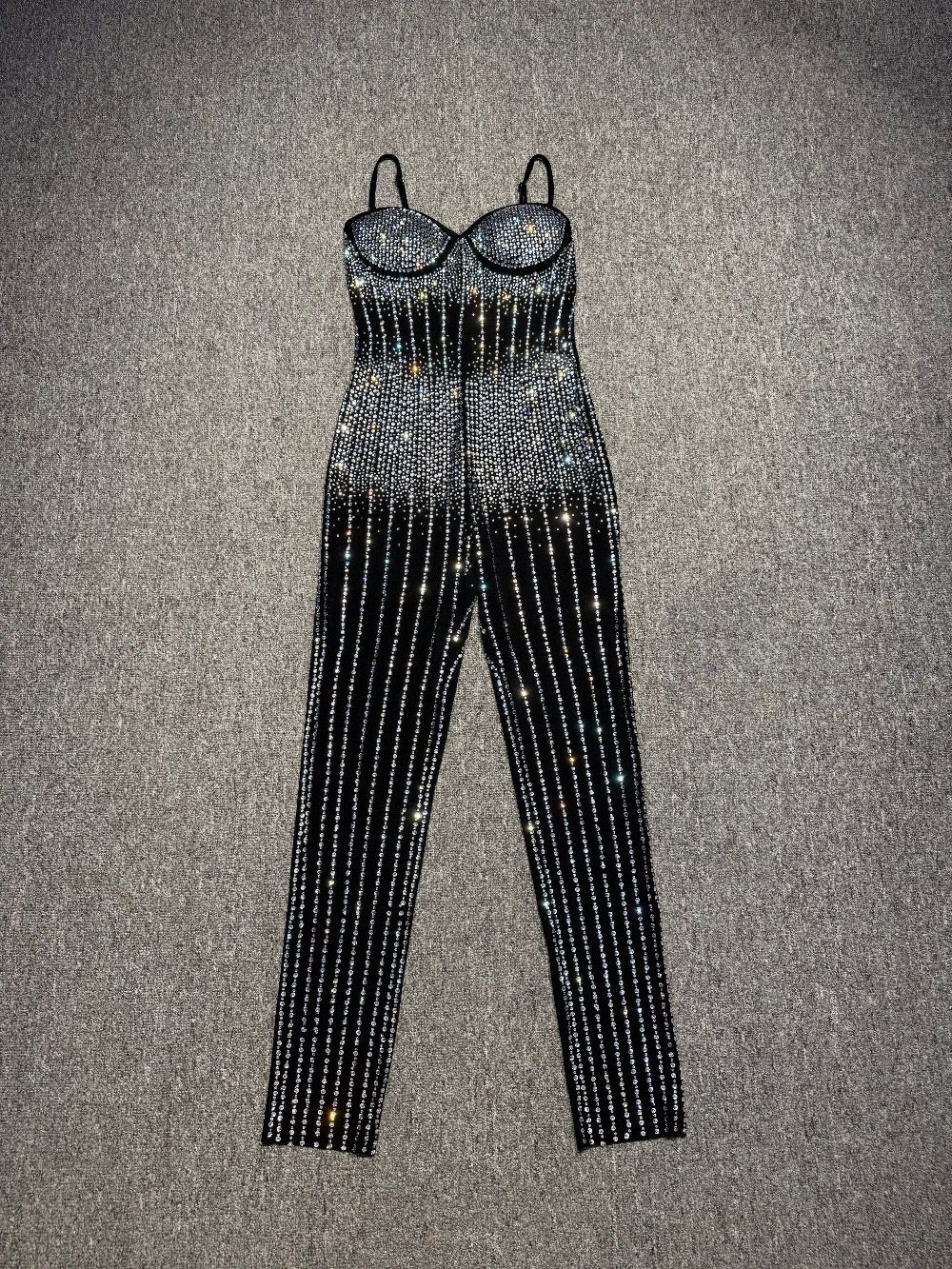 A spectacular black rhinestone-embellished stretch jumpsuit.