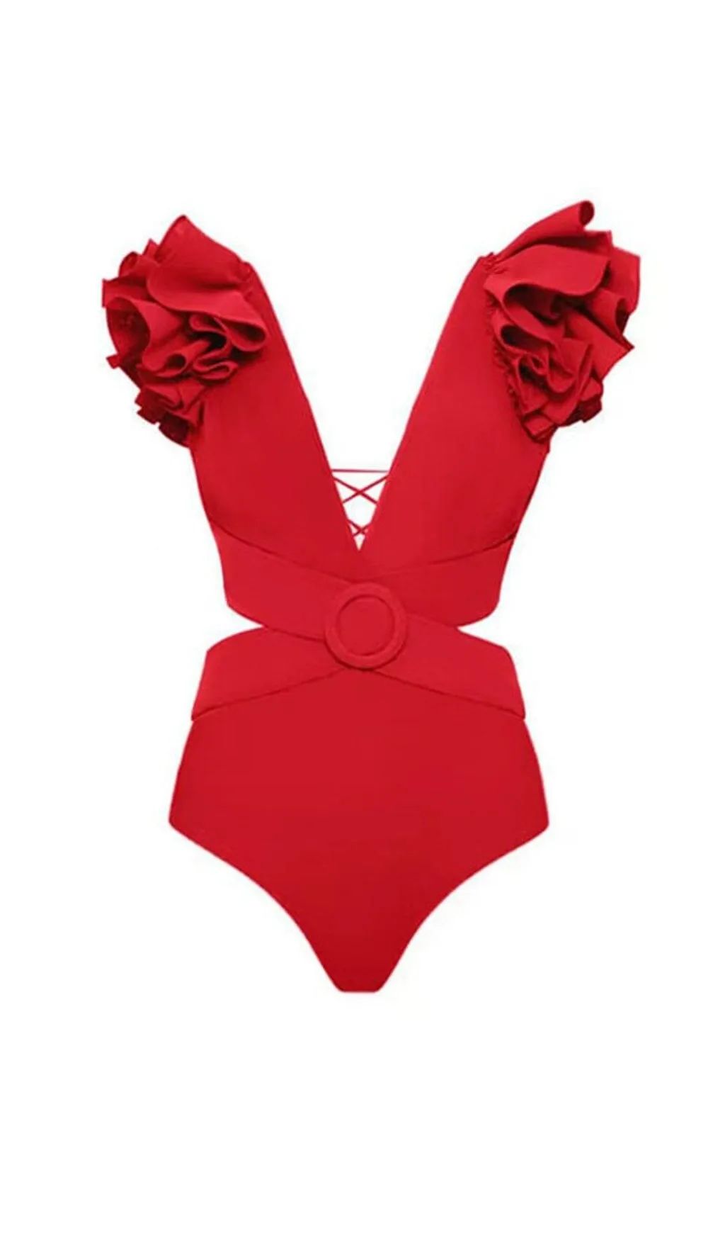 The swimsuit has a deep V-neck with ruffles at the shoulders.
