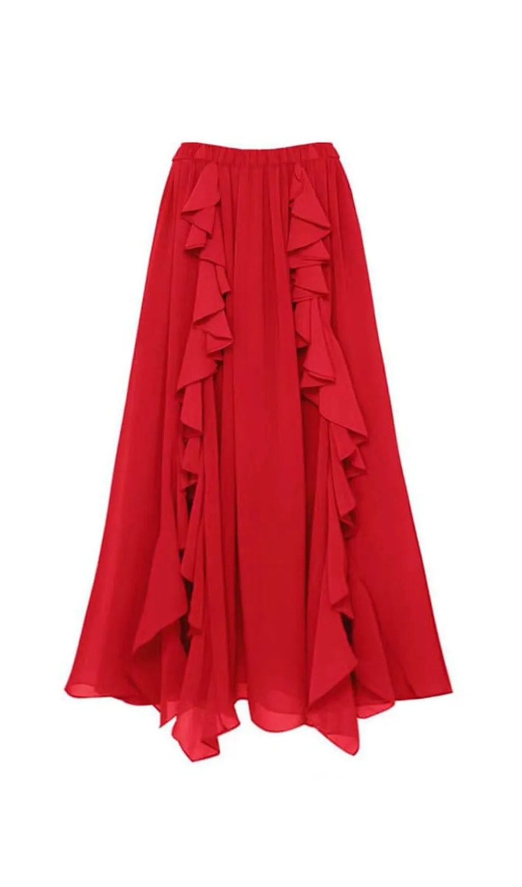 A matching swimsuit bodysuit and long skirt set in passionate red.