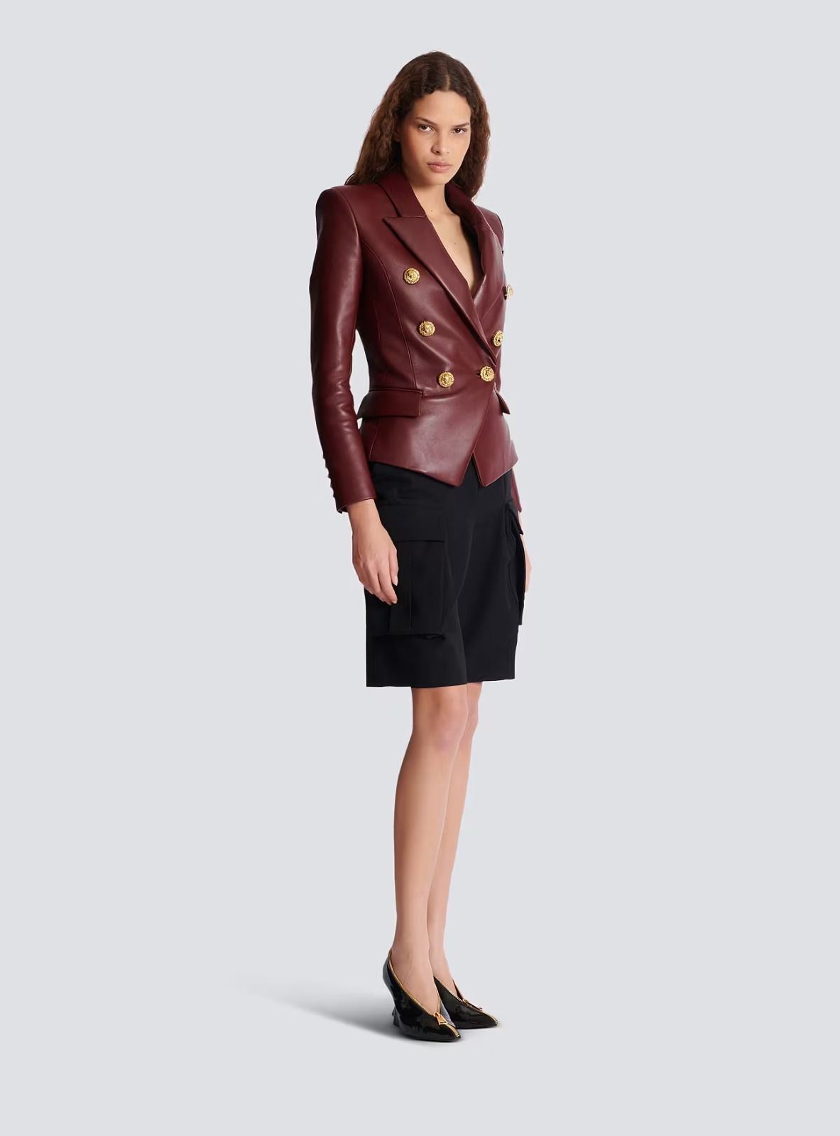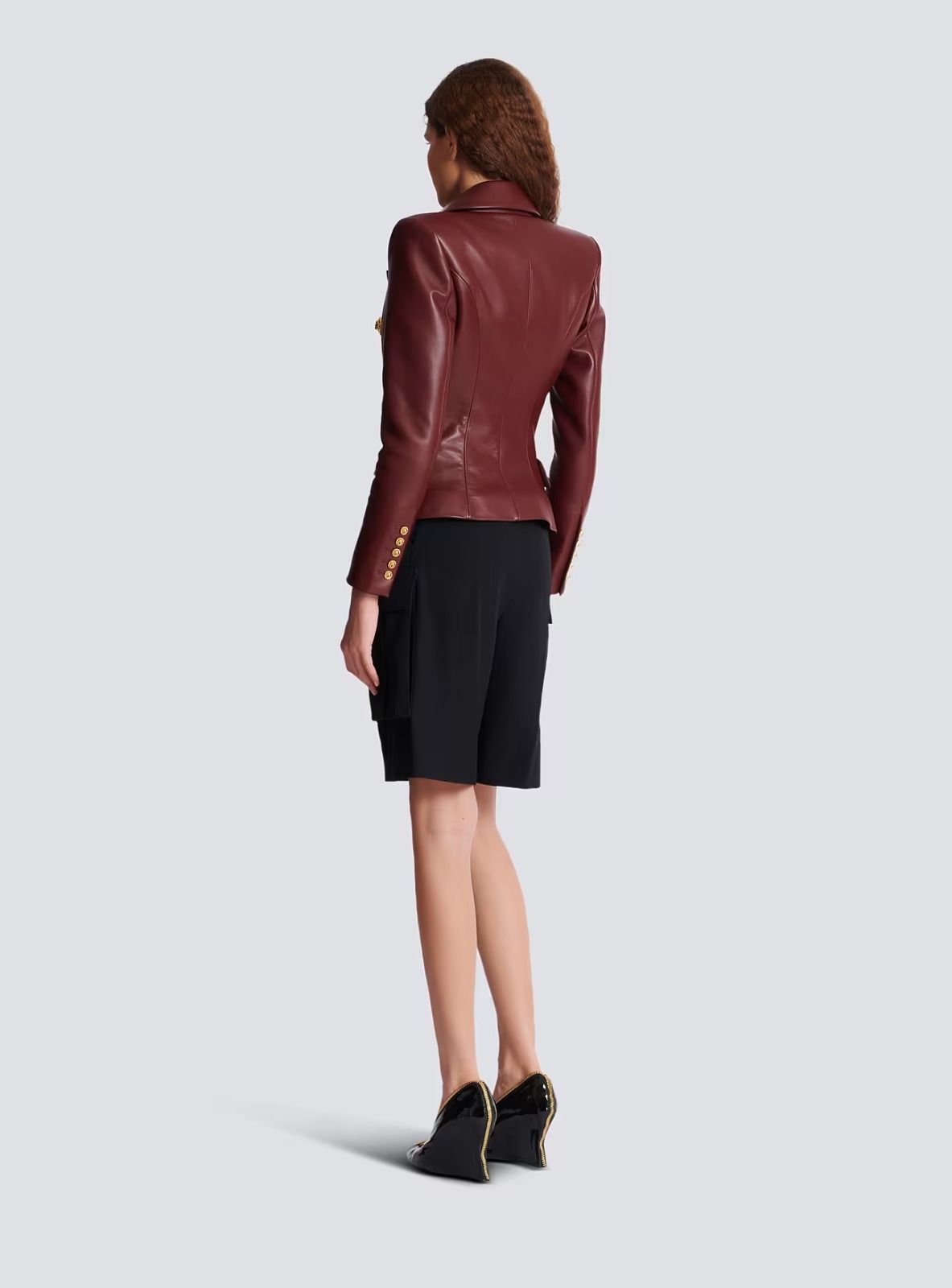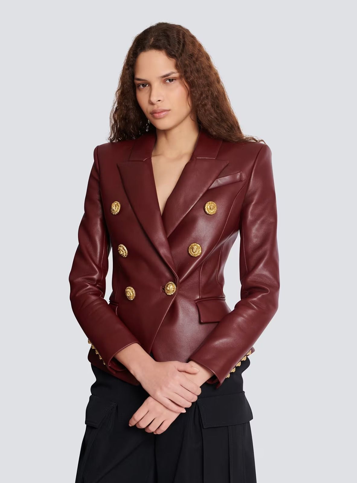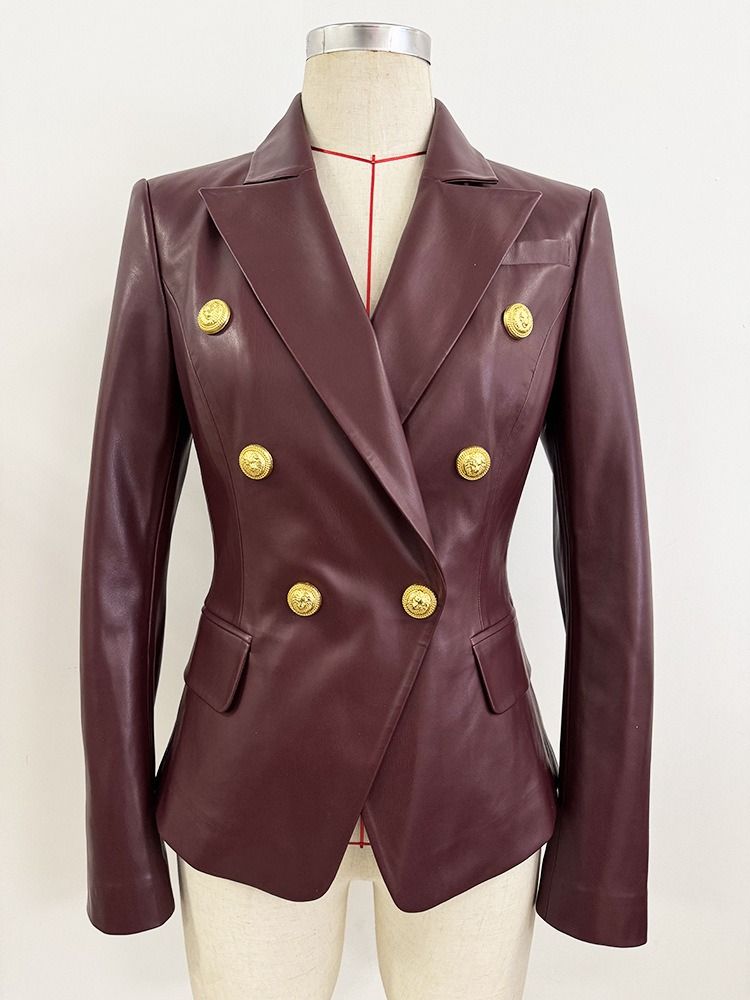 Fitted faux leather blazer with gold buttons in burgundy