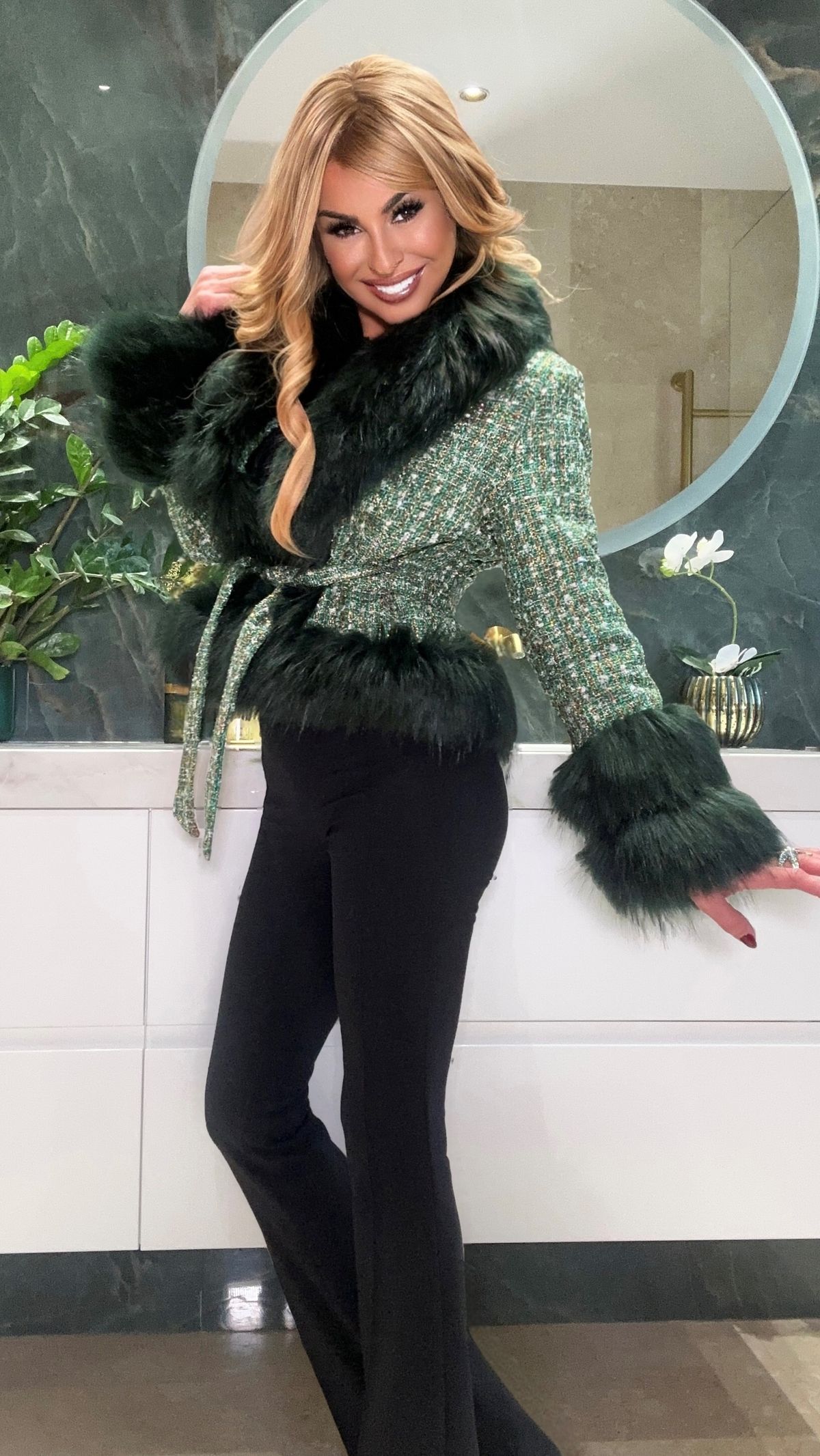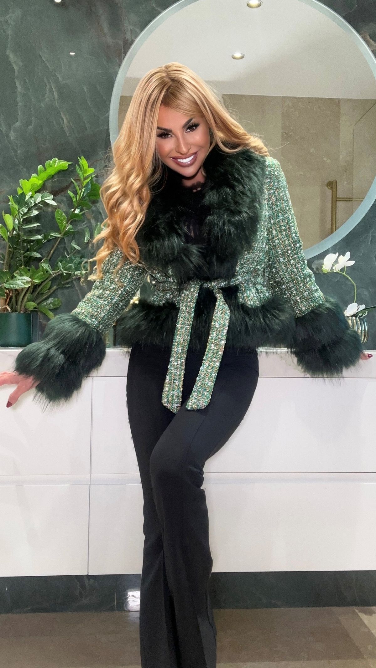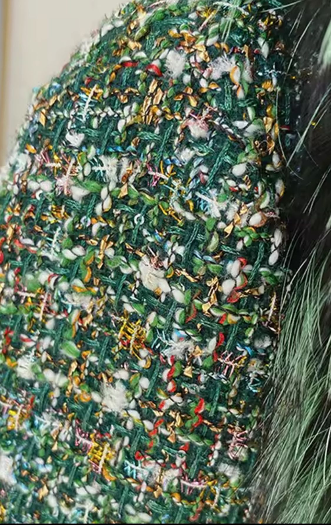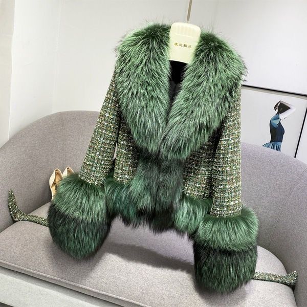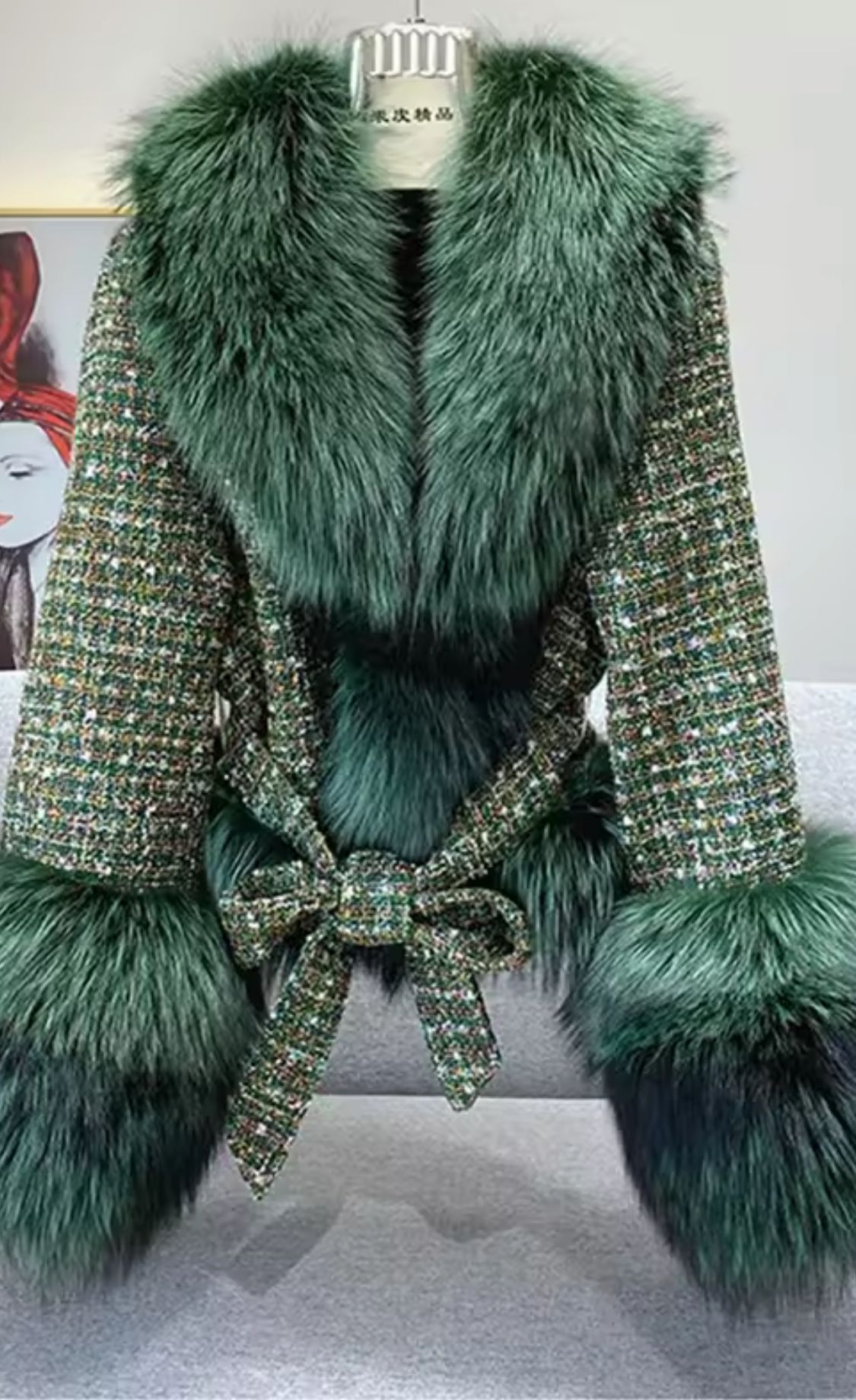 Furry coat in green tweed fabric with fur trim on the cuffs and collar