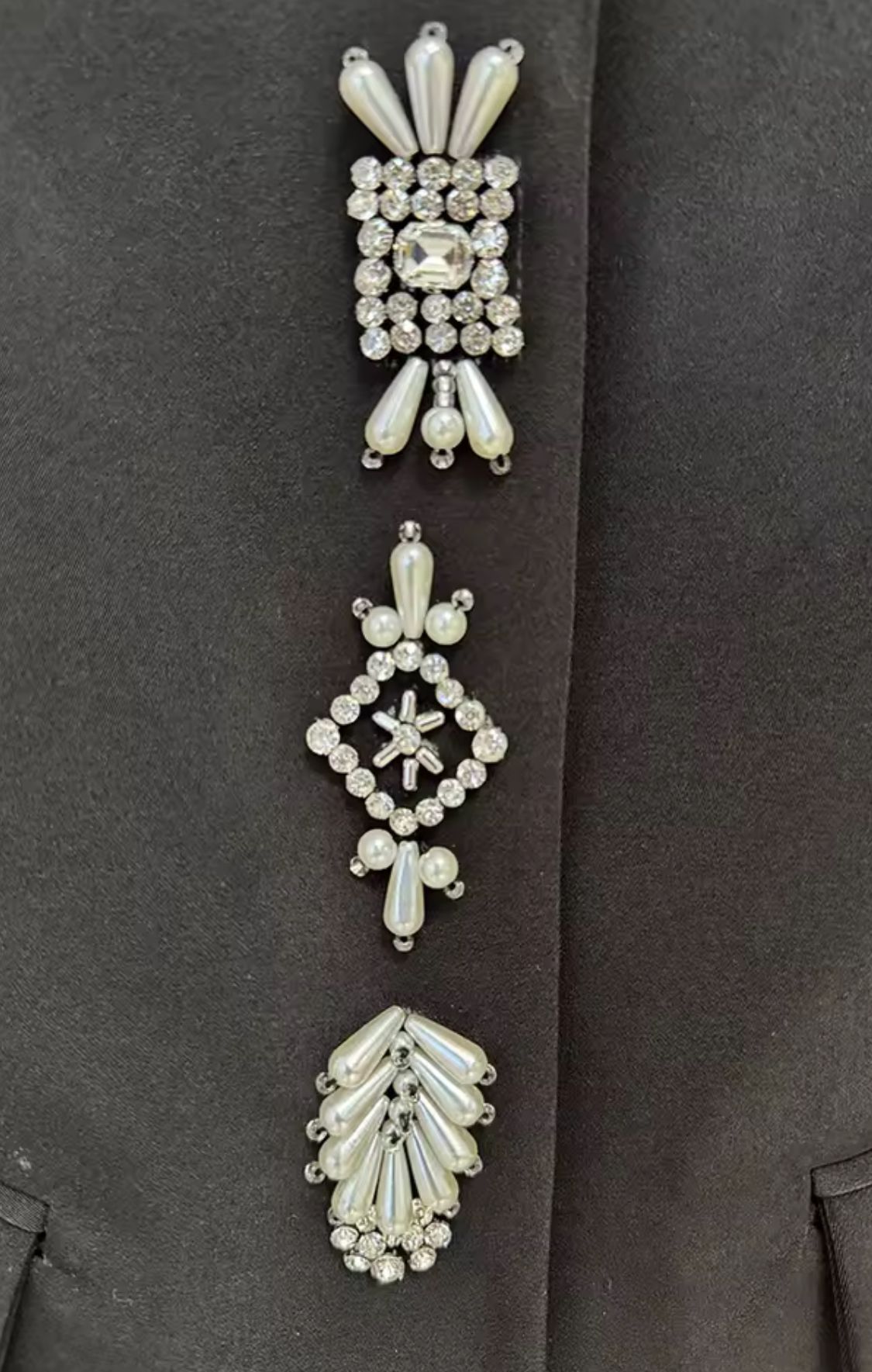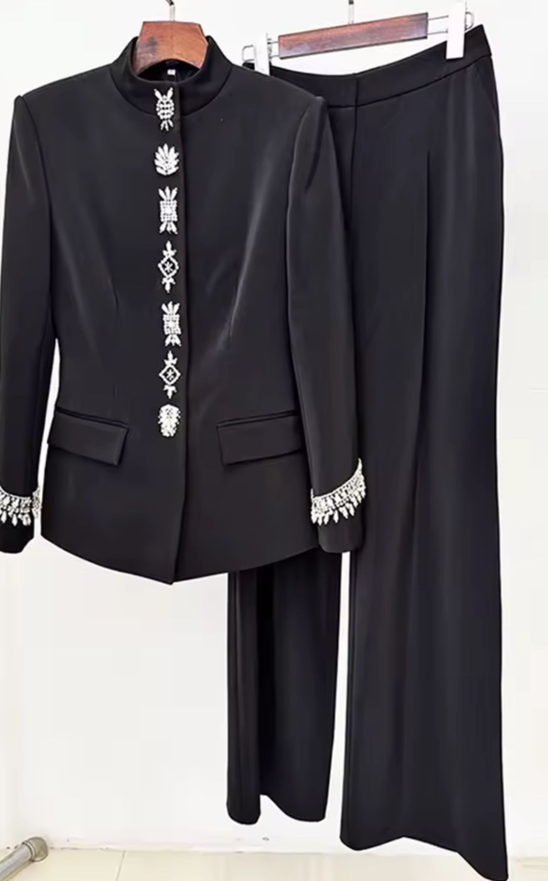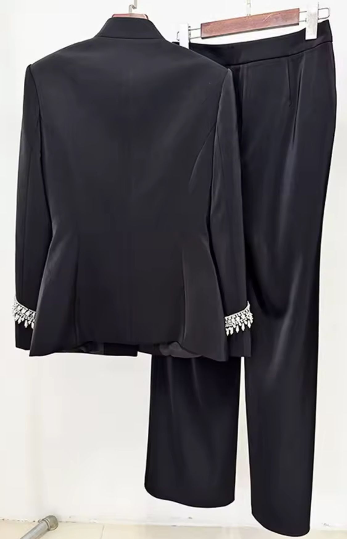 Precioso traje de americana y pantalón a juego de pedrería en color negro