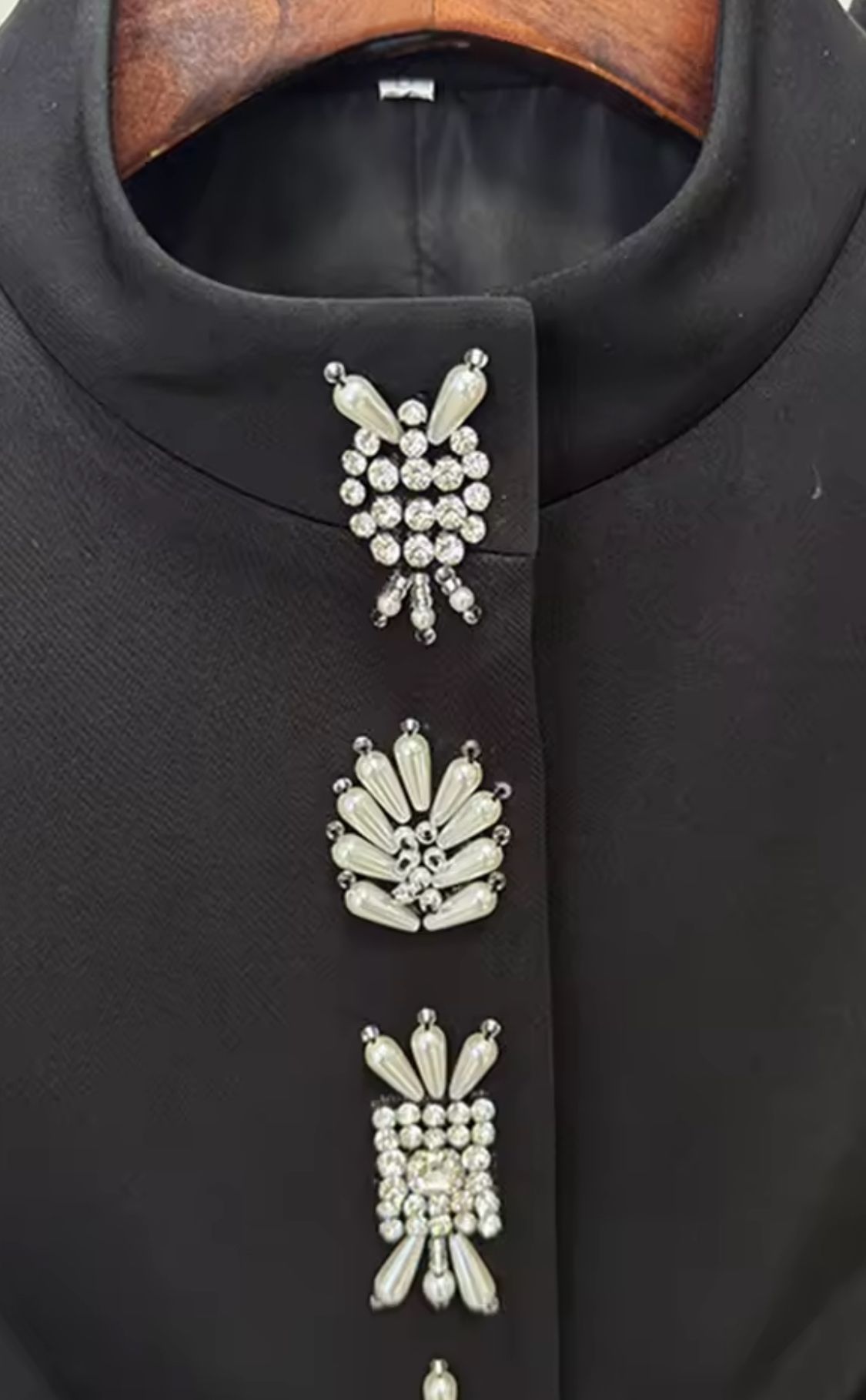 Se trata de una americana lujosa de pedrería en color negro con pedrería en la zona de los puños y en la zona de los botones.