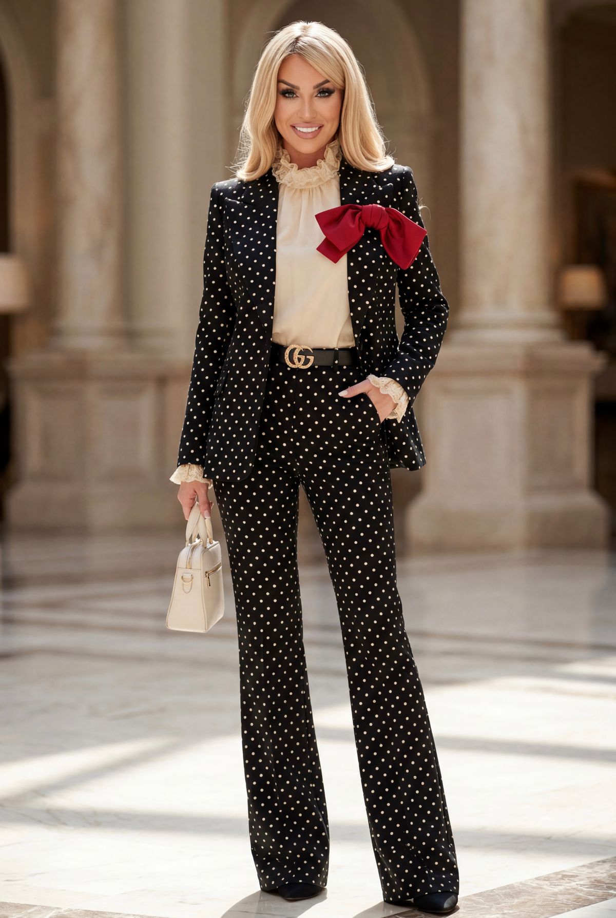 Traje compuesto de americana y pantalón negro de lunares blancos con lazo rojo