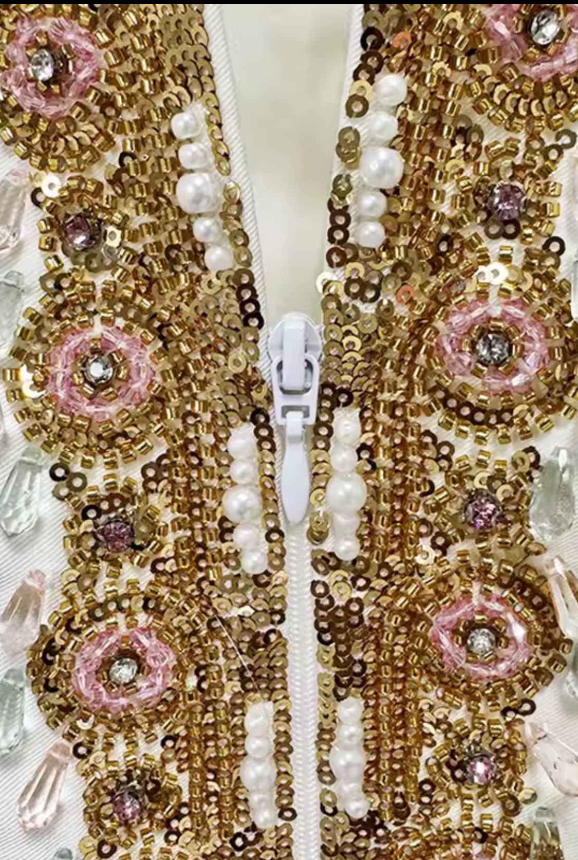 Amor a primera vista con este impresionante traje blanco de pedrería en tonos dorados y rosa.