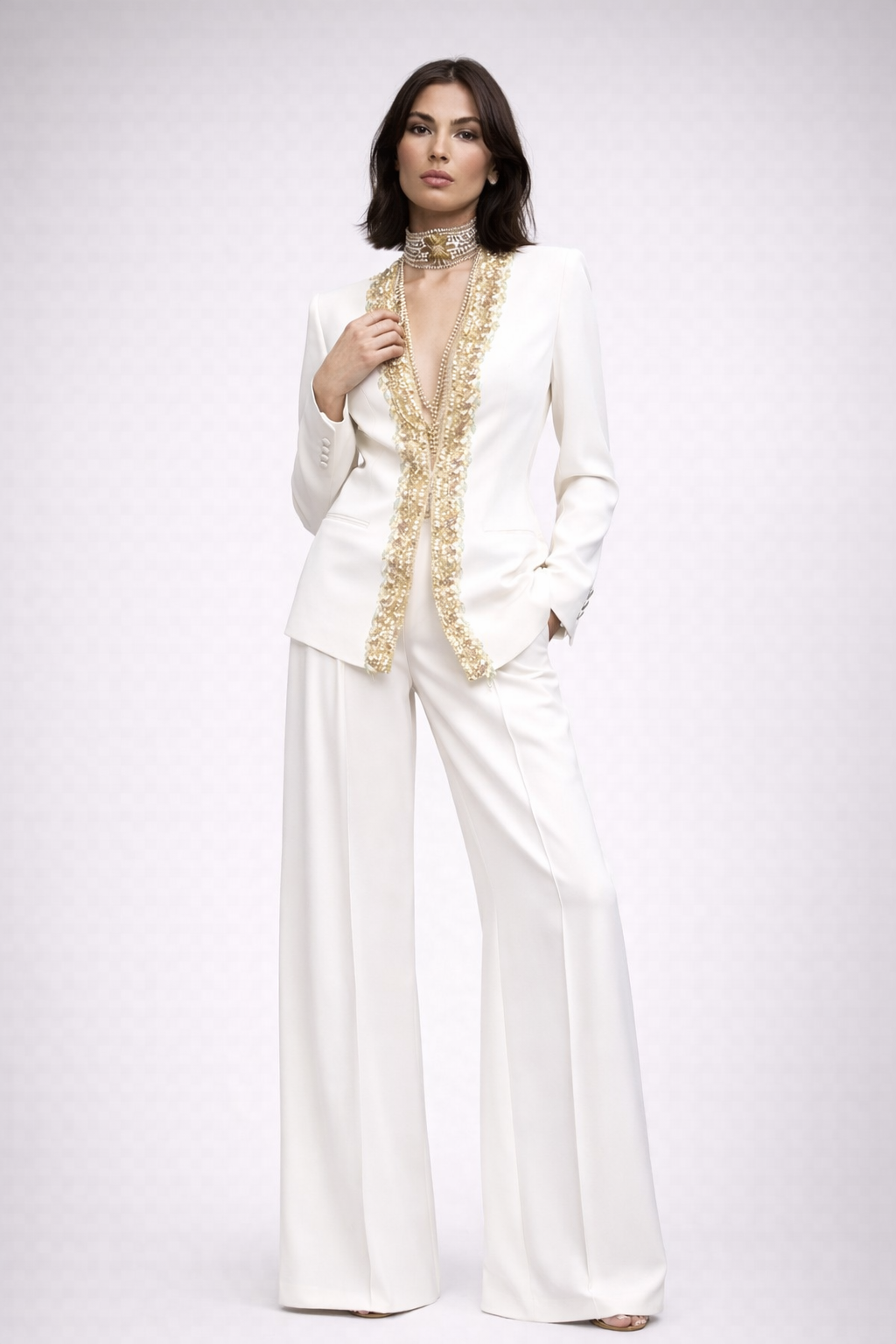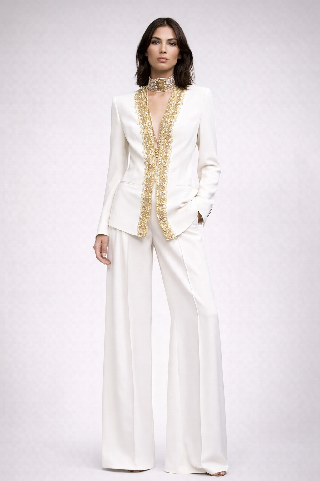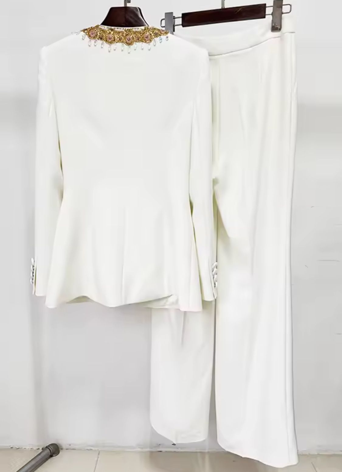 Traje pantalón, compuesto de americana y pantalón de pedrería en blanco combinado con dorado