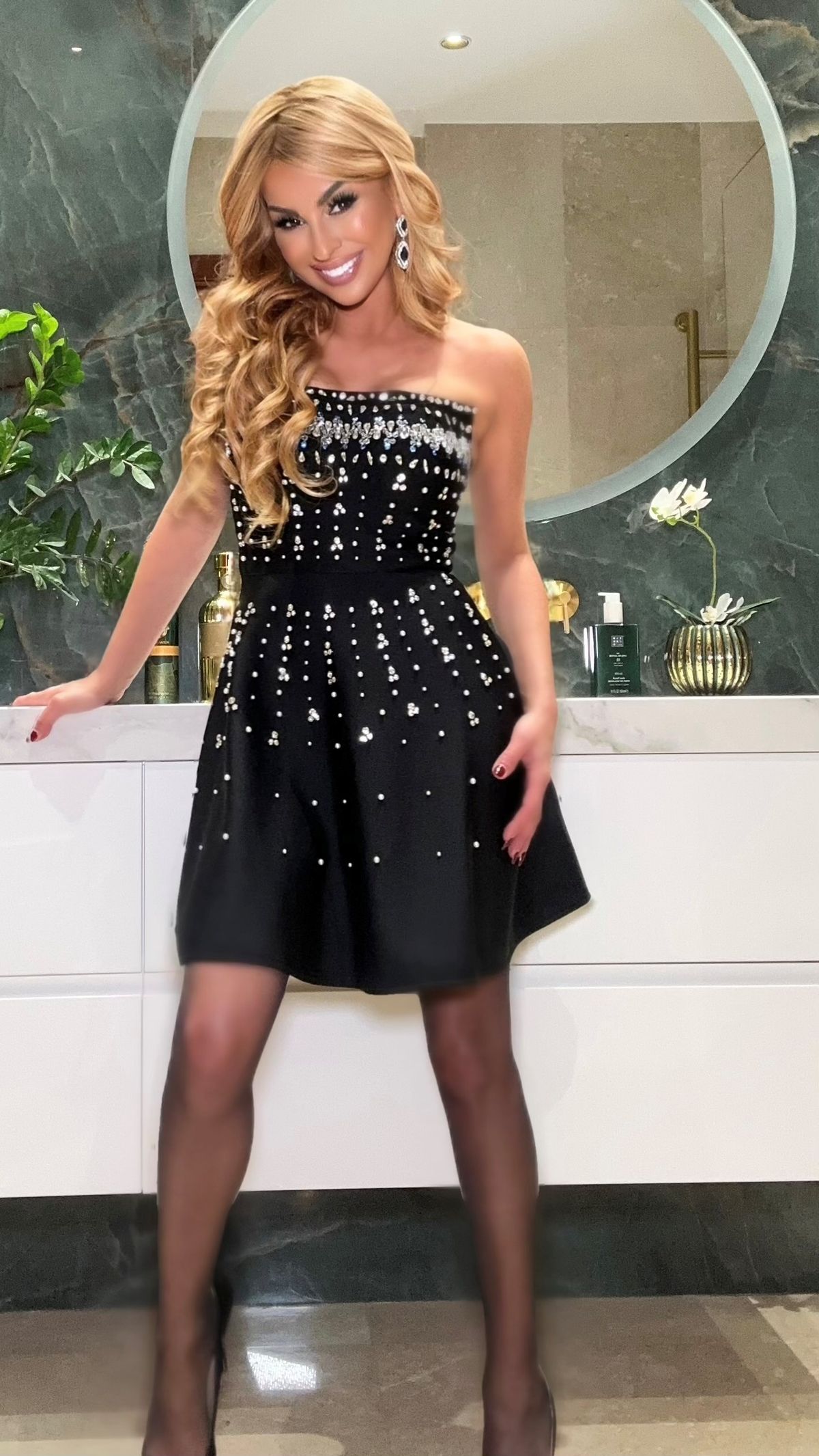 Vestido elástico de tejido bandage con pedrería en escote palabra de honor en color negro