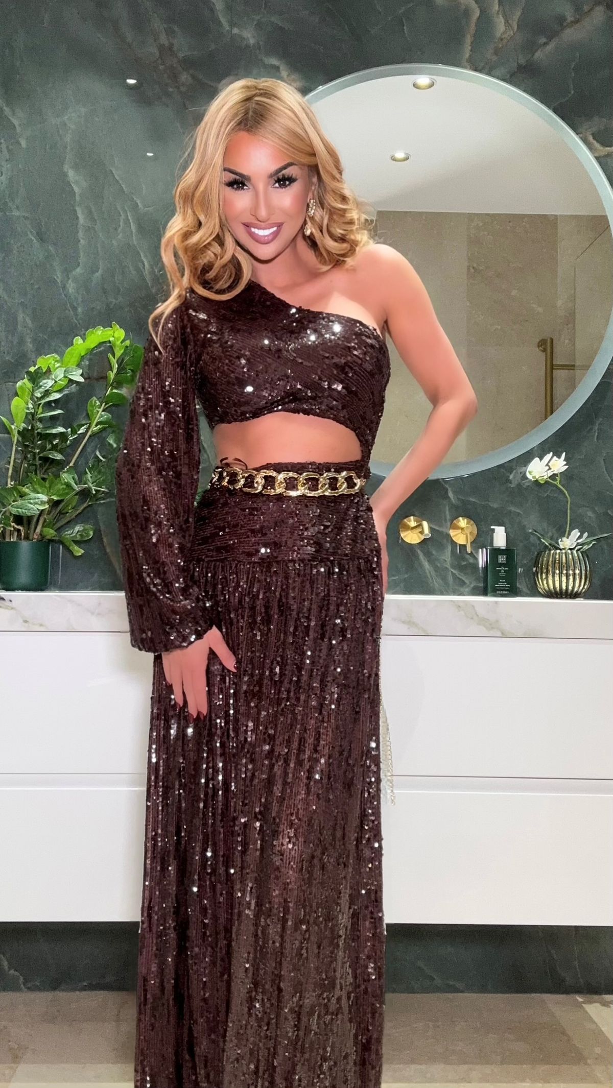 Vestido asimétrico de lentejuelas marrón con detalle de cadena dorada en cintura y fada plisada