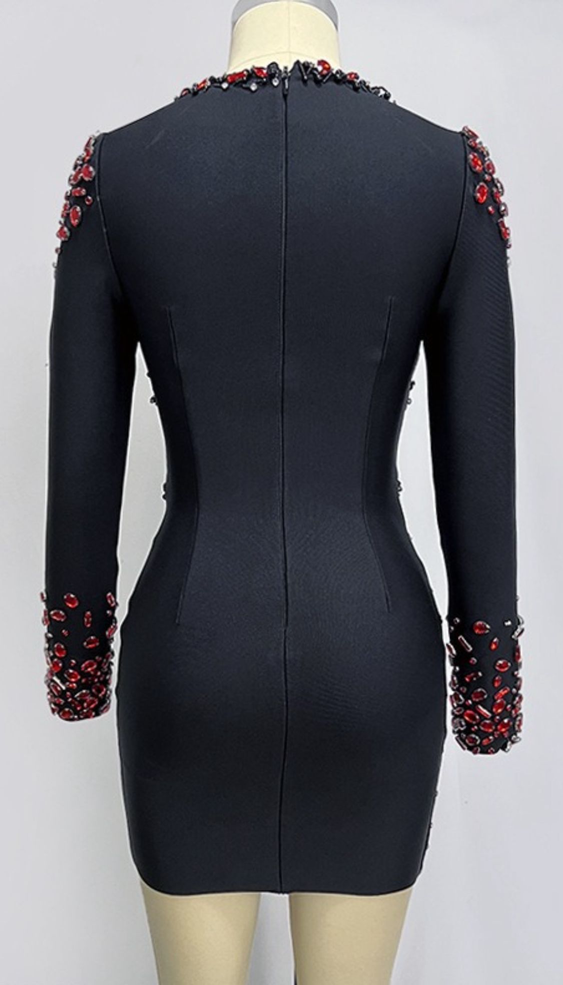 Vestido corto elástico bandage de manga larga negro con pedrería