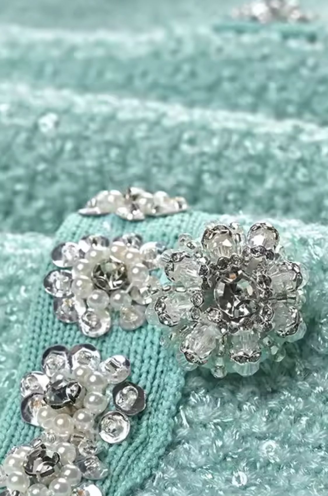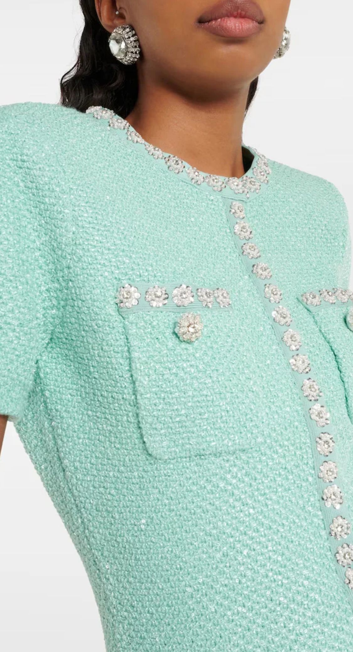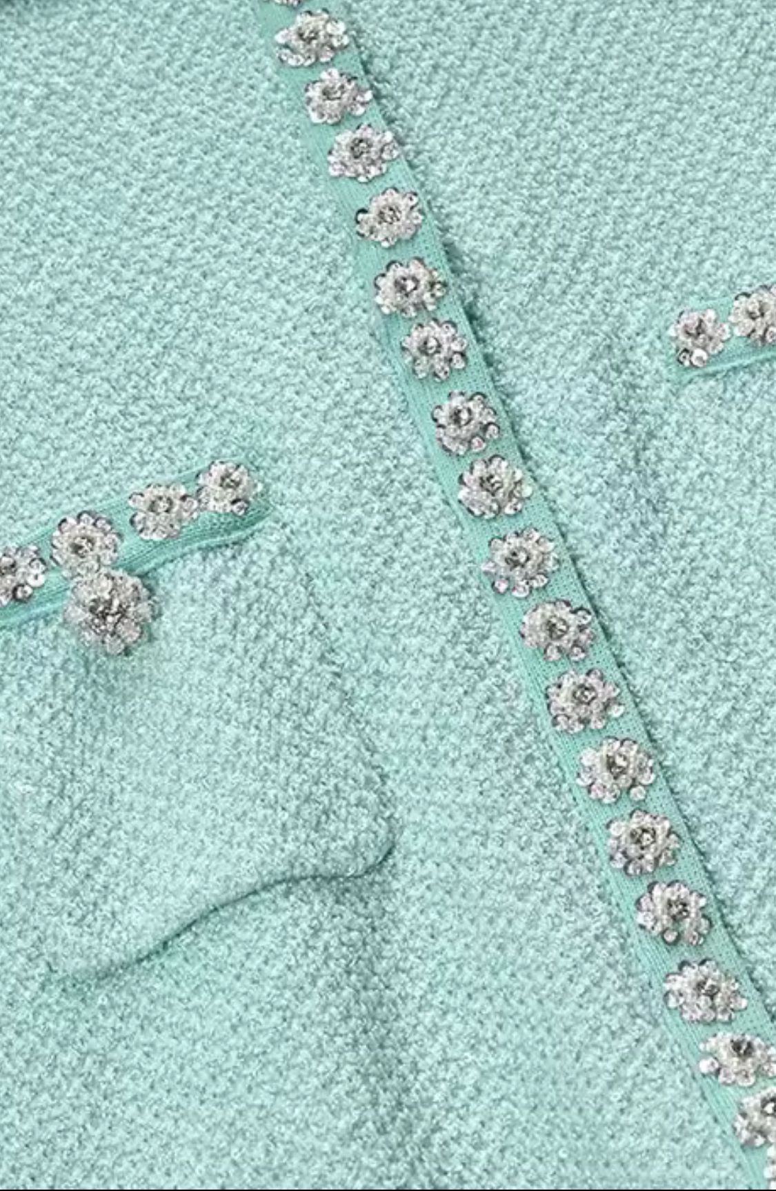 Un hermoso vestido de punto con lentejuelas y pedrería de manga corta en un color verde agua delicioso.