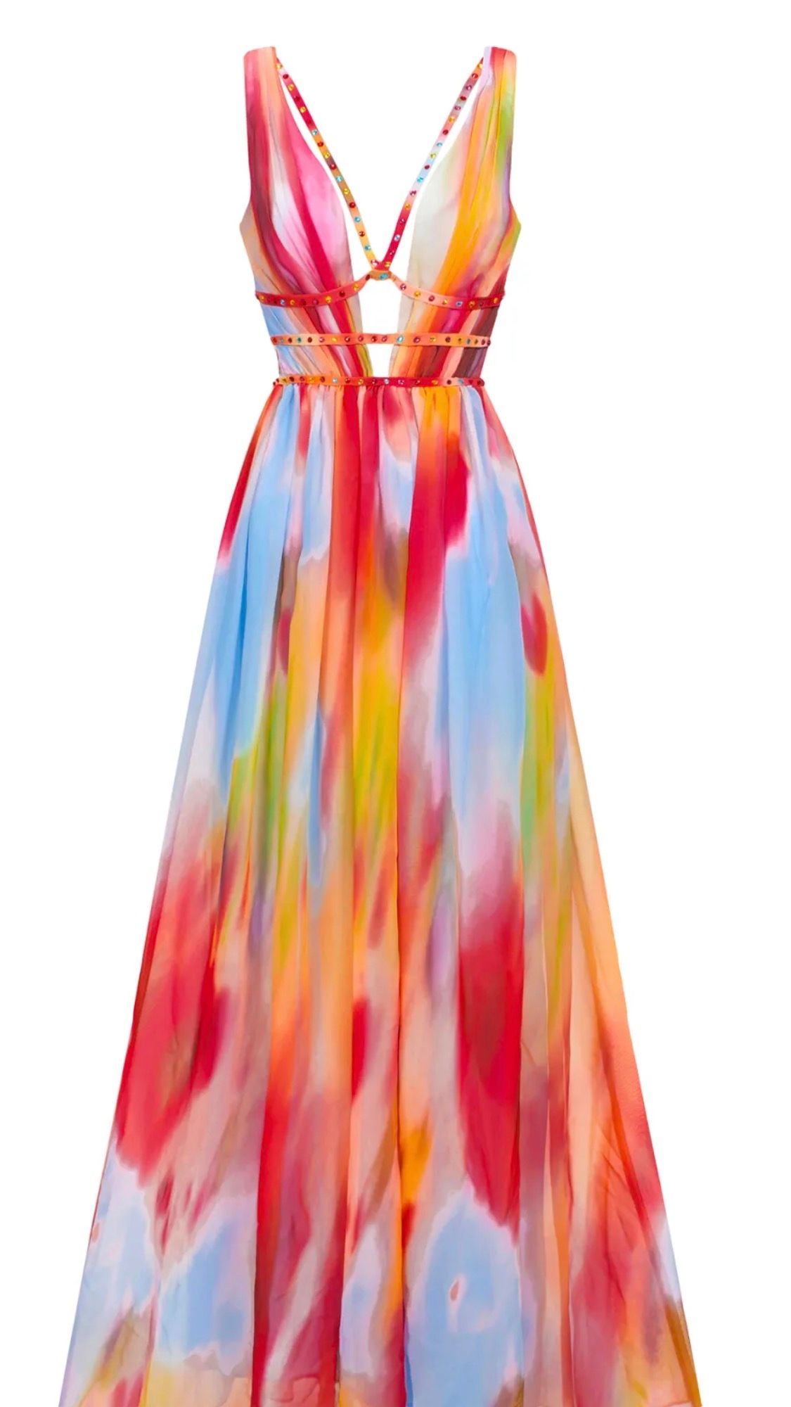 Destaca por su estampado abstracto en tonos cálidos y vibrantes que evocan un atardecer mediterráneo, convirtiéndolo en la elección ideal para eventos especiales, cenas frente al mar o galas de verano.
