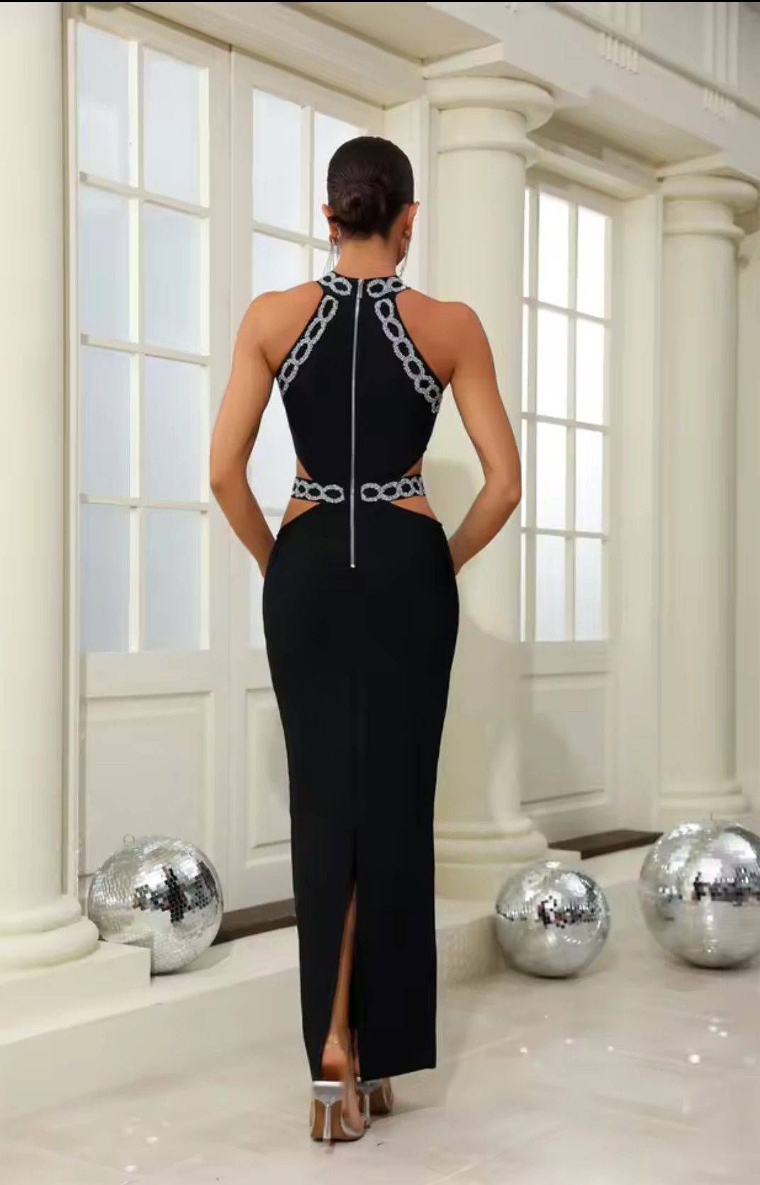 Vestido largo elástico de tejido bandage negro con pedrería flor