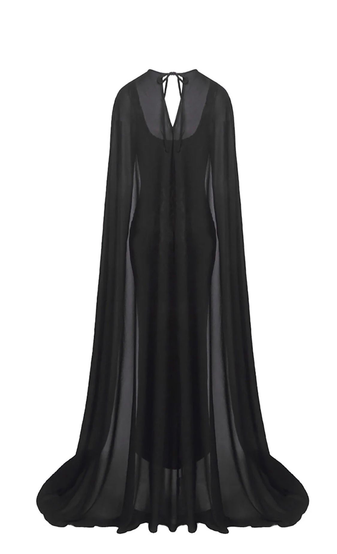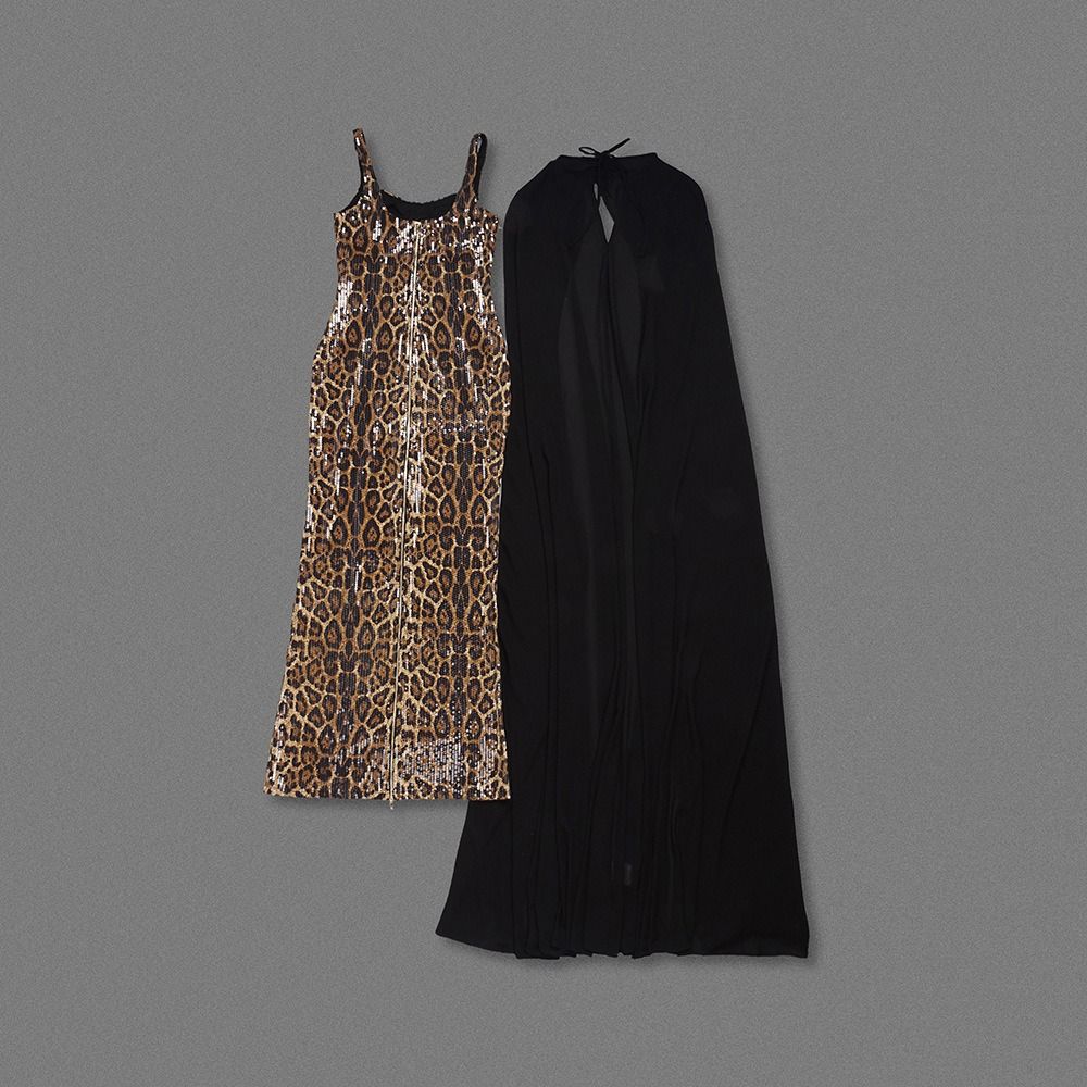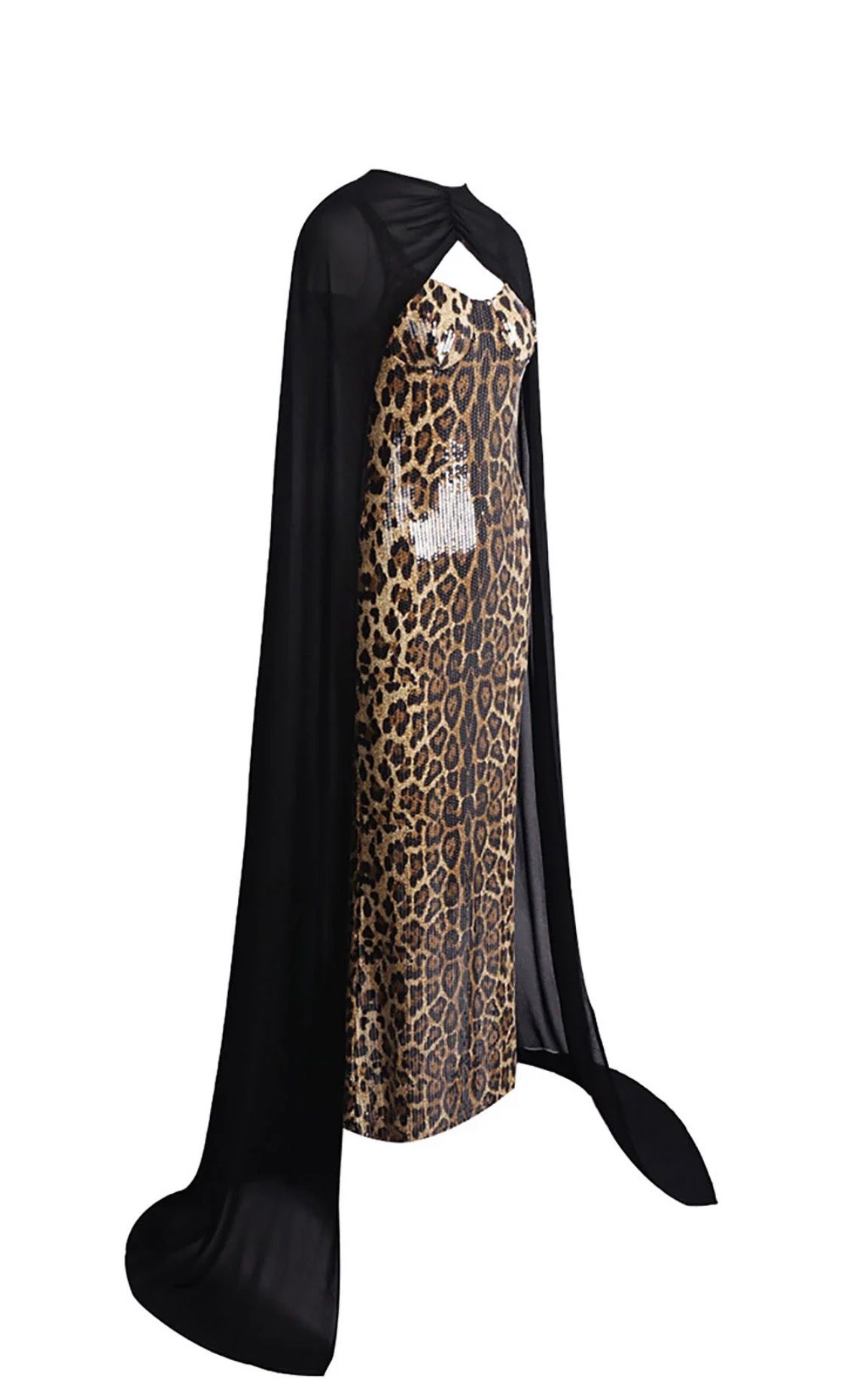 Vestido largo de lentejuelas de estampado print animal ligeramente elástico con capa negra incluida