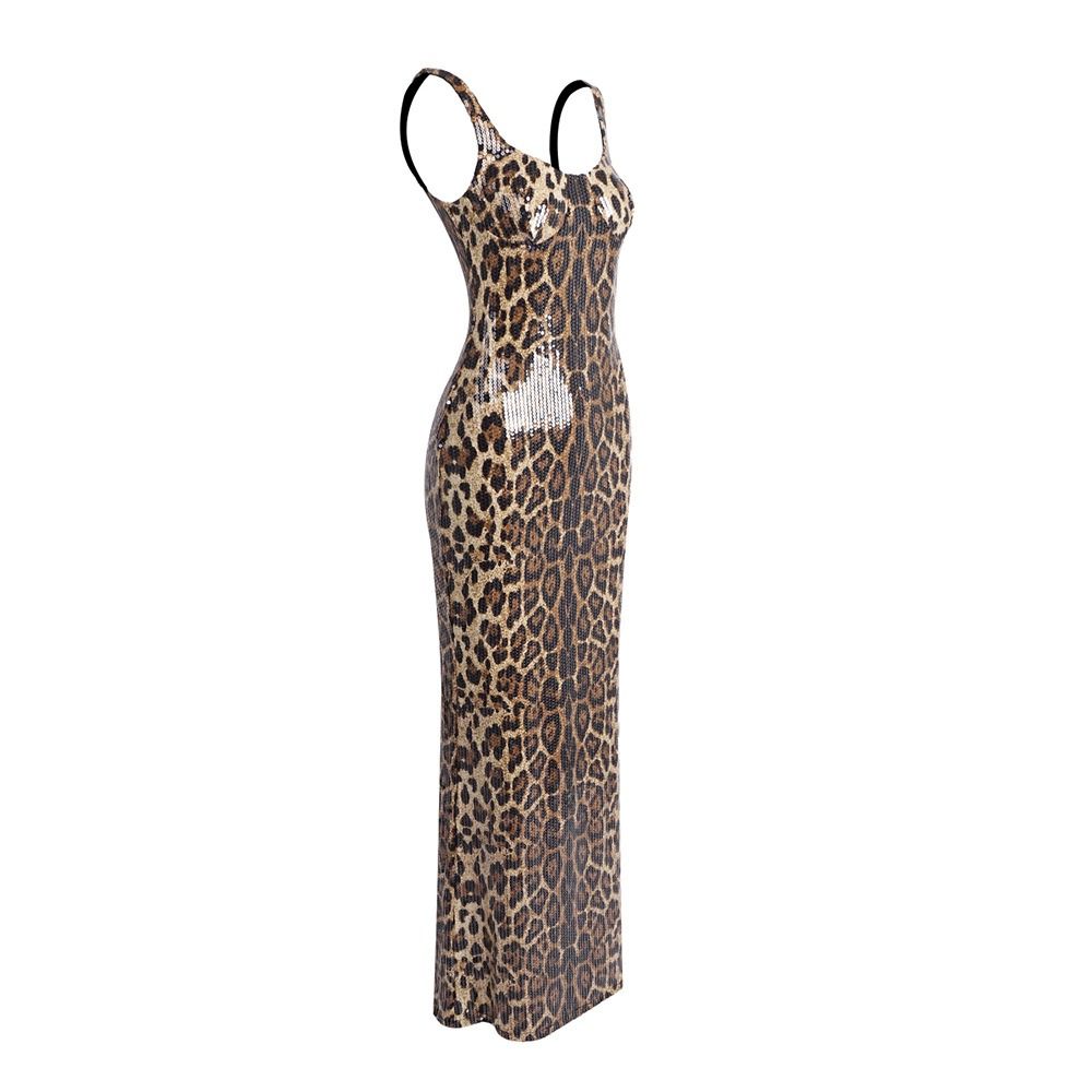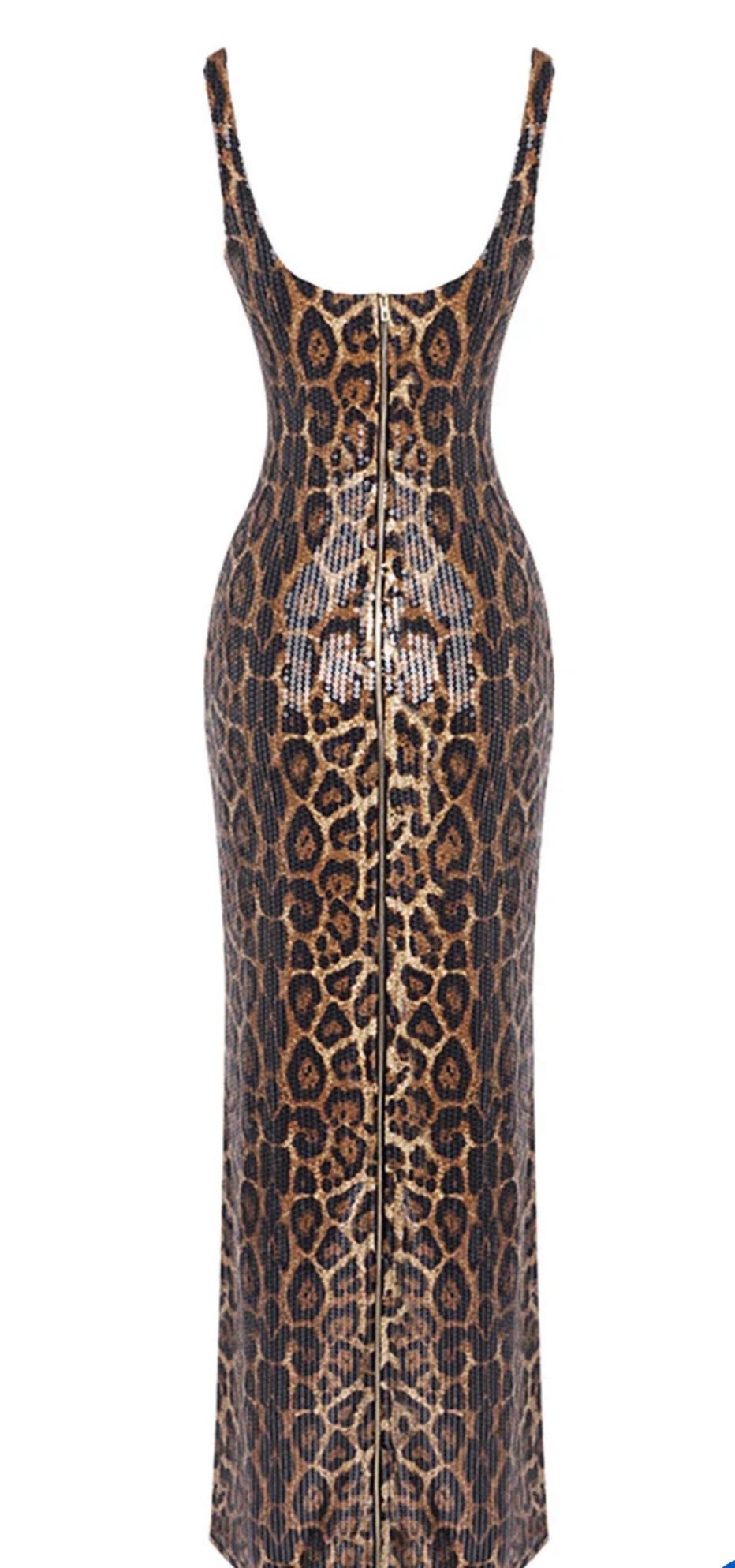Este vestido largo fusiona el instinto animal print con el glamour magnético de las lentejuelas transparentes efecto mojado, creando un efecto de brillo multidimensional que se adapta a cada uno de tus movimientos.
